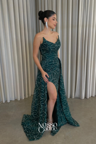 Brilho Texturizado: Paetês e cristais em degradê, que criam movimento e profundidade sob as luzes do salão.