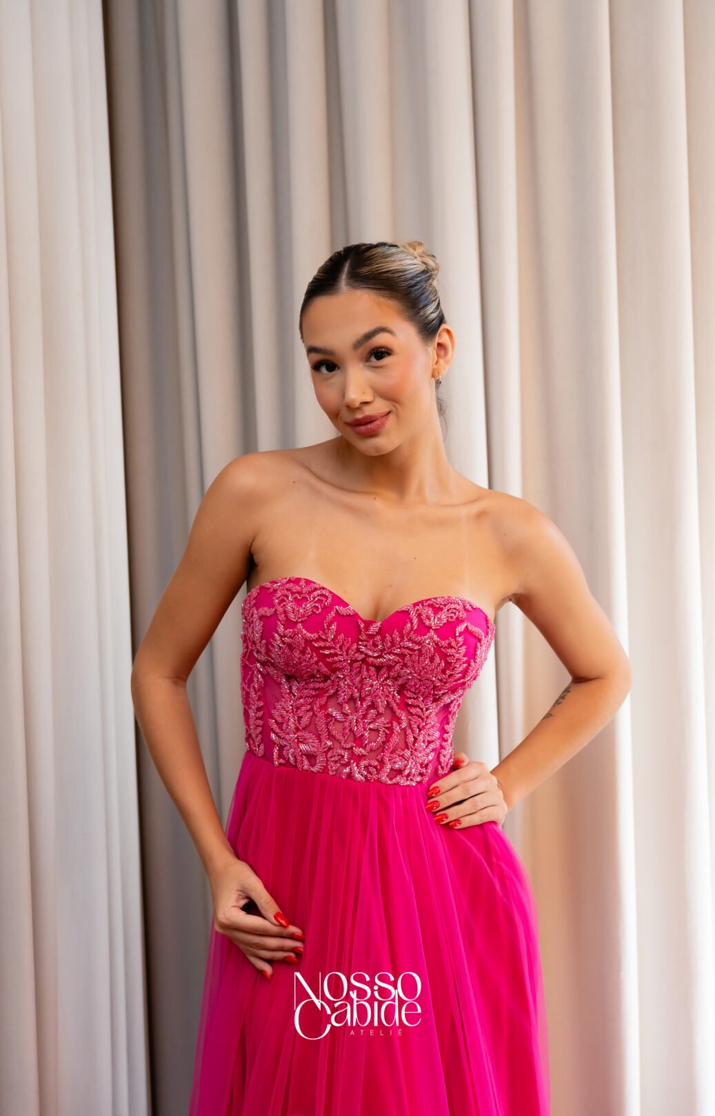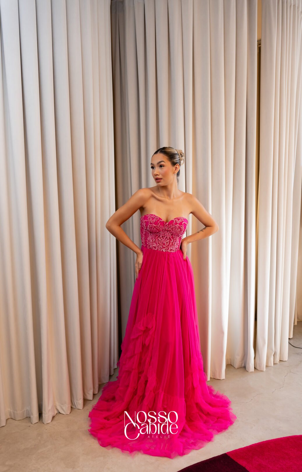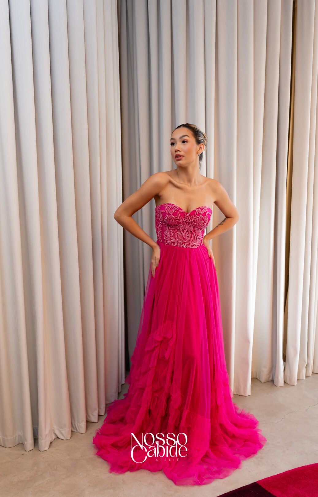O corte impecável deste vestido realça a silhueta feminina, proporcionando um ajuste perfeito em todas as áreas do corpo. Longa e fluída acrescenta movimento e elegância a cada passo, enquanto valoriza os traços femininos.