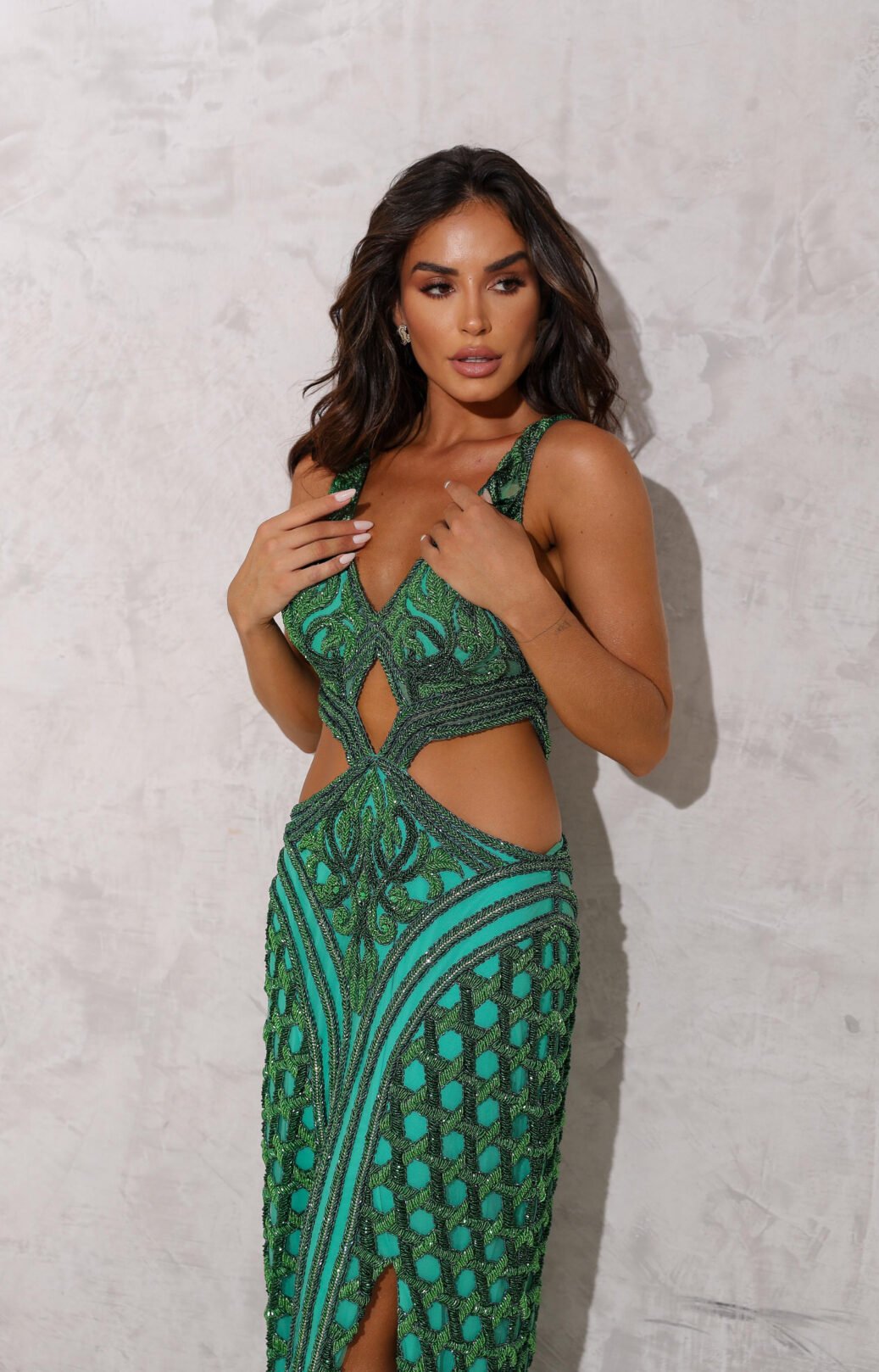 O corte impecável deste vestido realça a silhueta feminina, proporcionando um ajuste perfeito em todas as áreas do corpo. Longa e fluída acrescenta movimento e elegância a cada passo, enquanto valoriza os traços femininos.