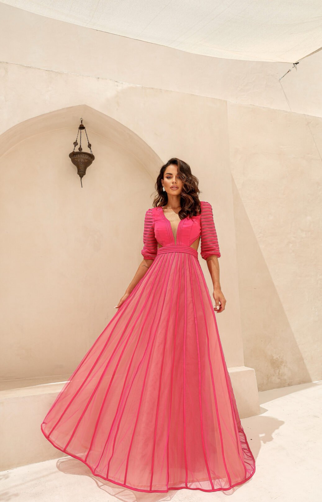 O corte impecável deste vestido realça a silhueta feminina, proporcionando um ajuste perfeito em todas as áreas do corpo. Longa e fluída acrescenta movimento e elegância a cada passo, enquanto valoriza os traços femininos.