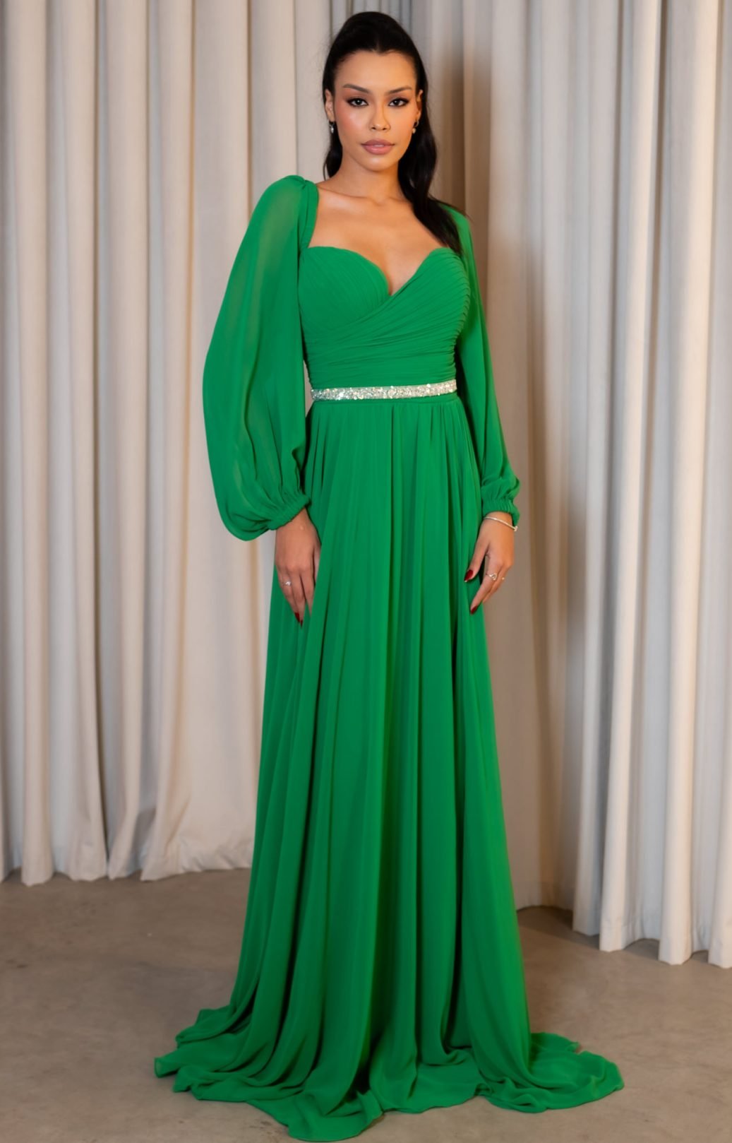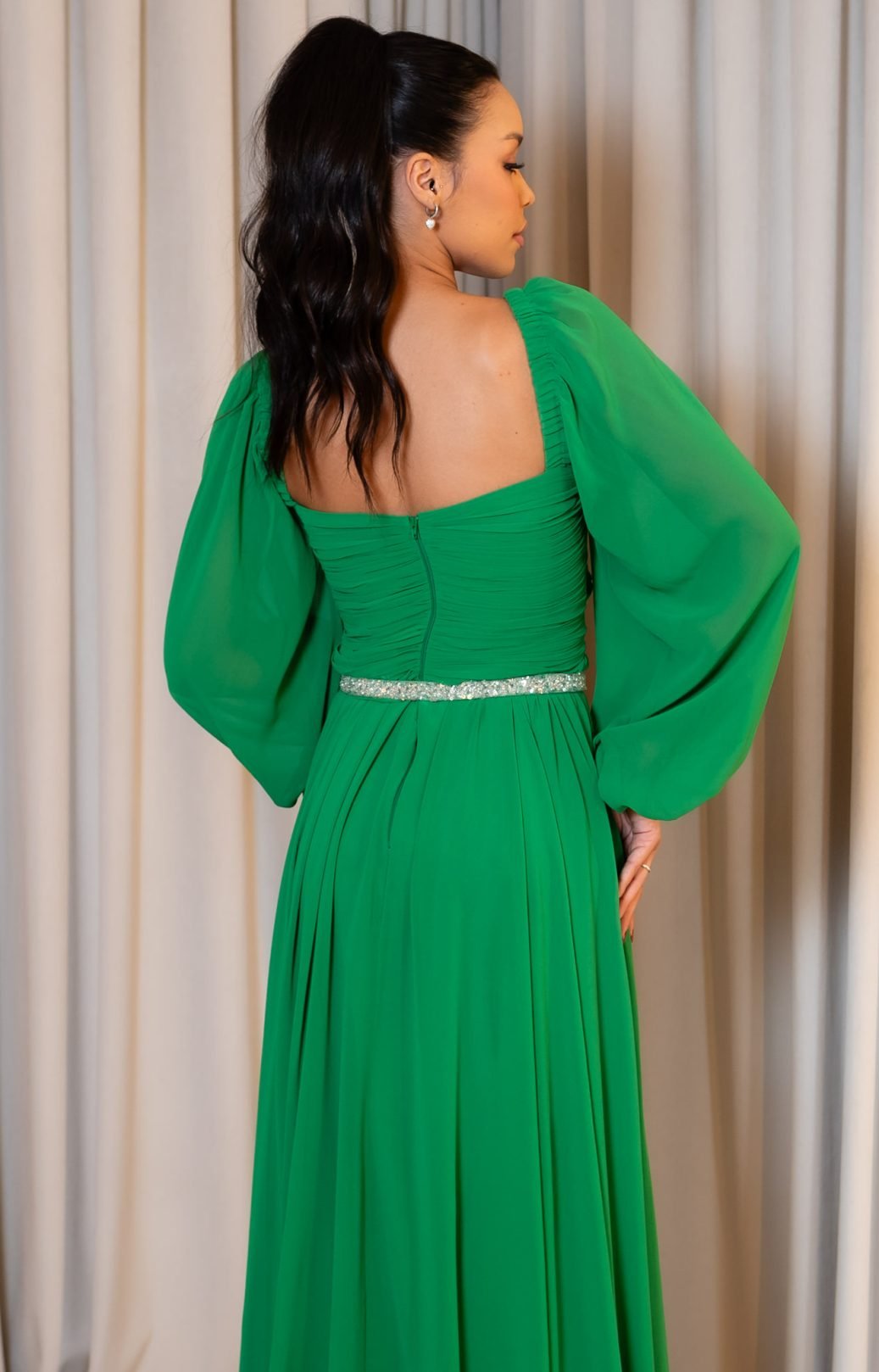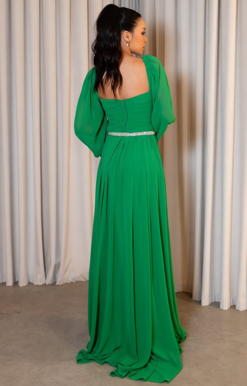 O corte impecável deste vestido realça a silhueta feminina, proporcionando um ajuste perfeito em todas as áreas do corpo. Longa e fluída acrescenta movimento e elegância a cada passo, enquanto valoriza o ombro e o pescoço.