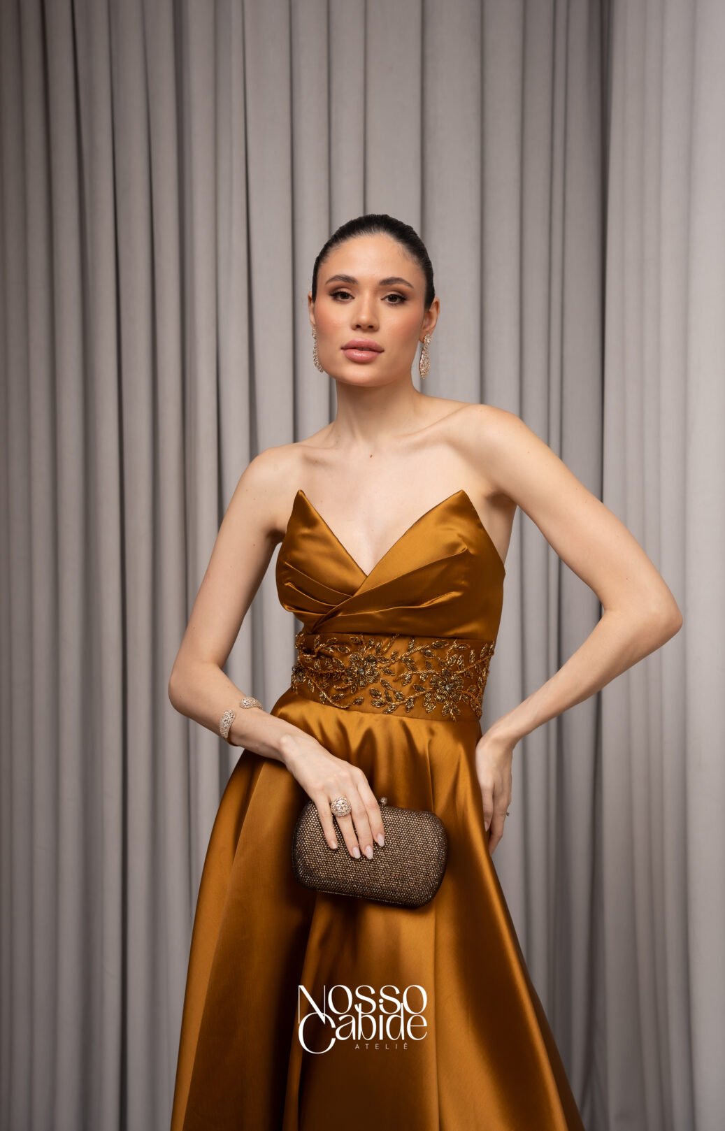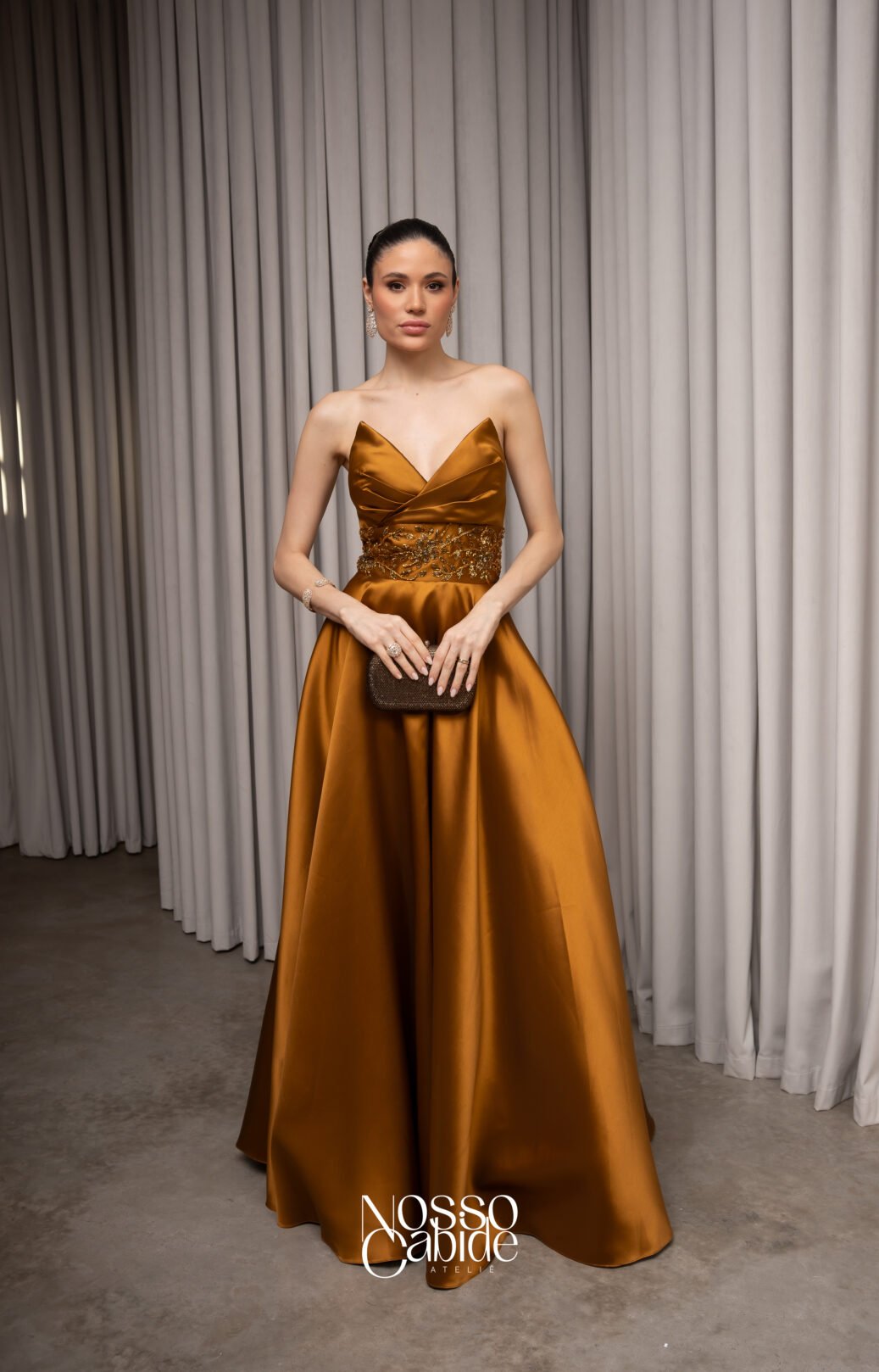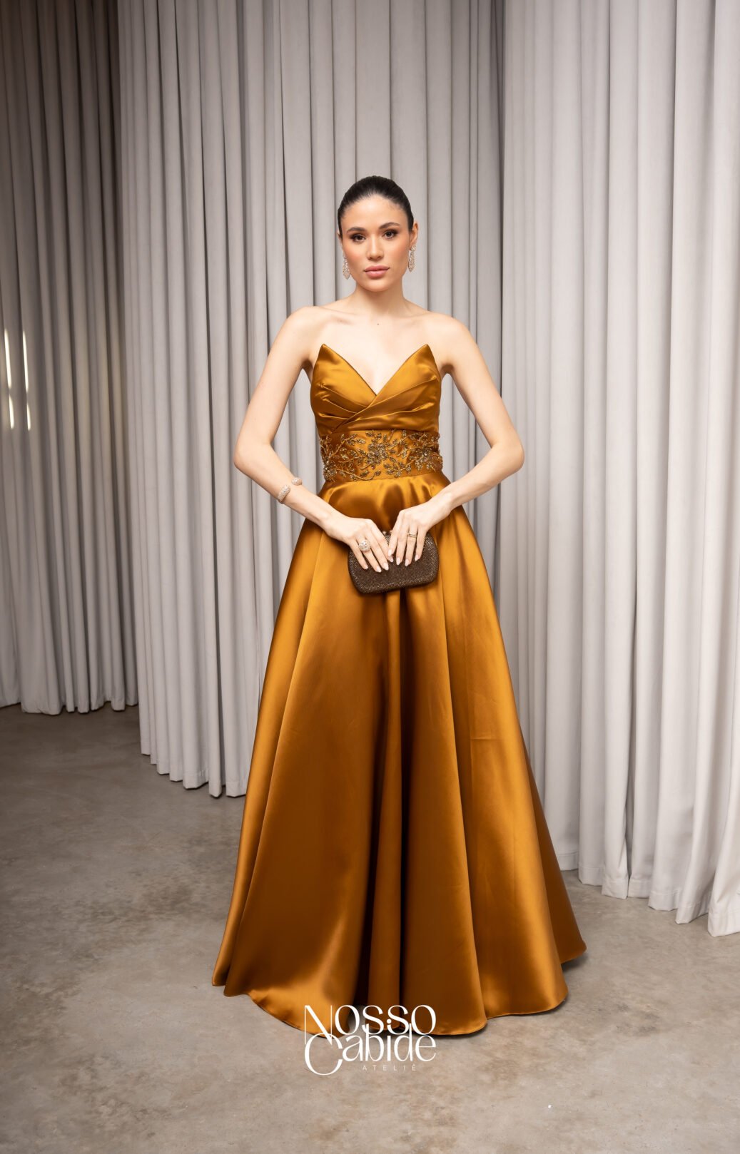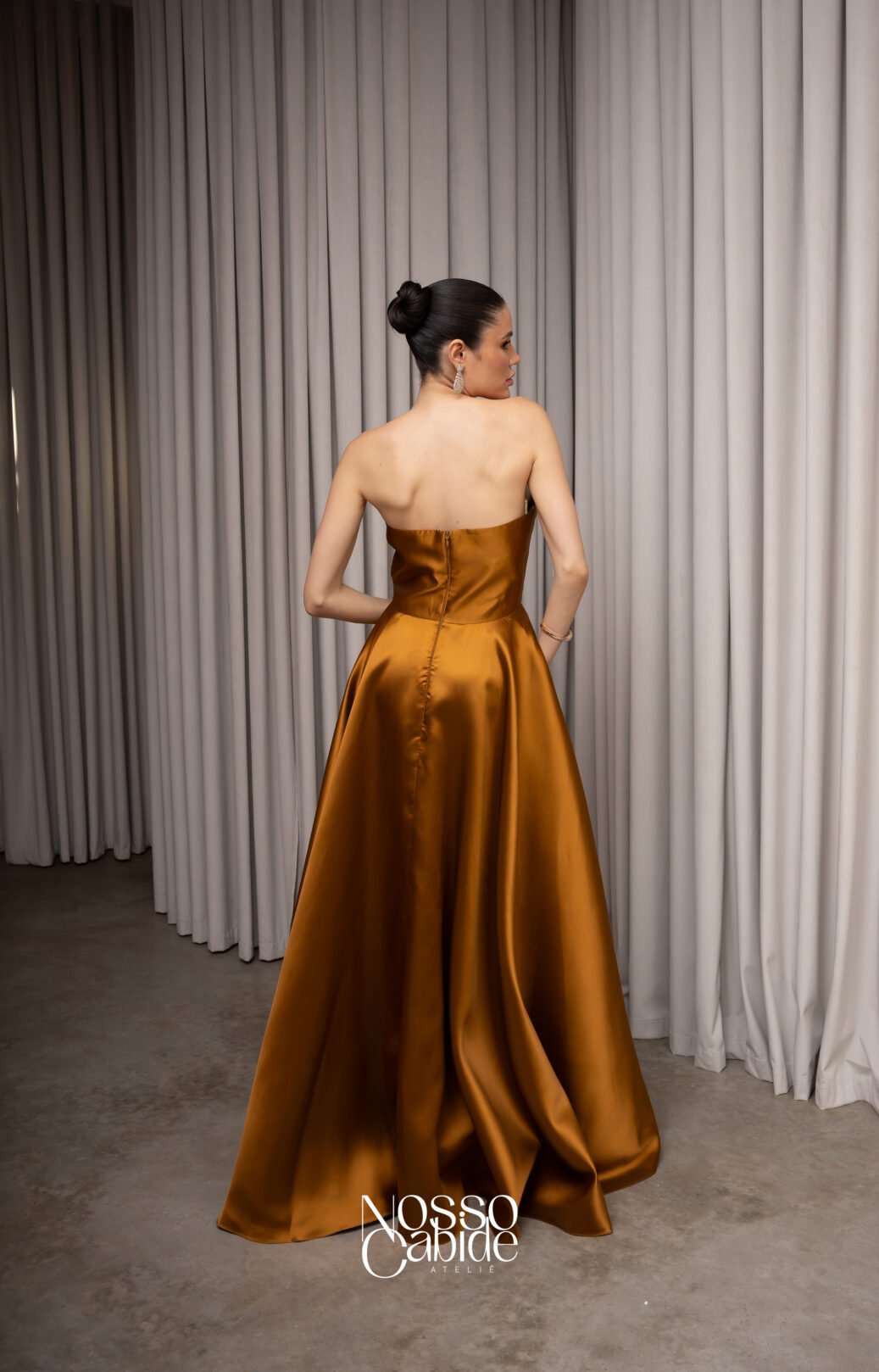 O corte impecável deste vestido realça a silhueta feminina, proporcionando um ajuste perfeito em todas as áreas do corpo. Longa e fluída acrescenta movimento e elegância a cada passo, enquanto valoriza os traços femininos.