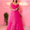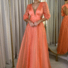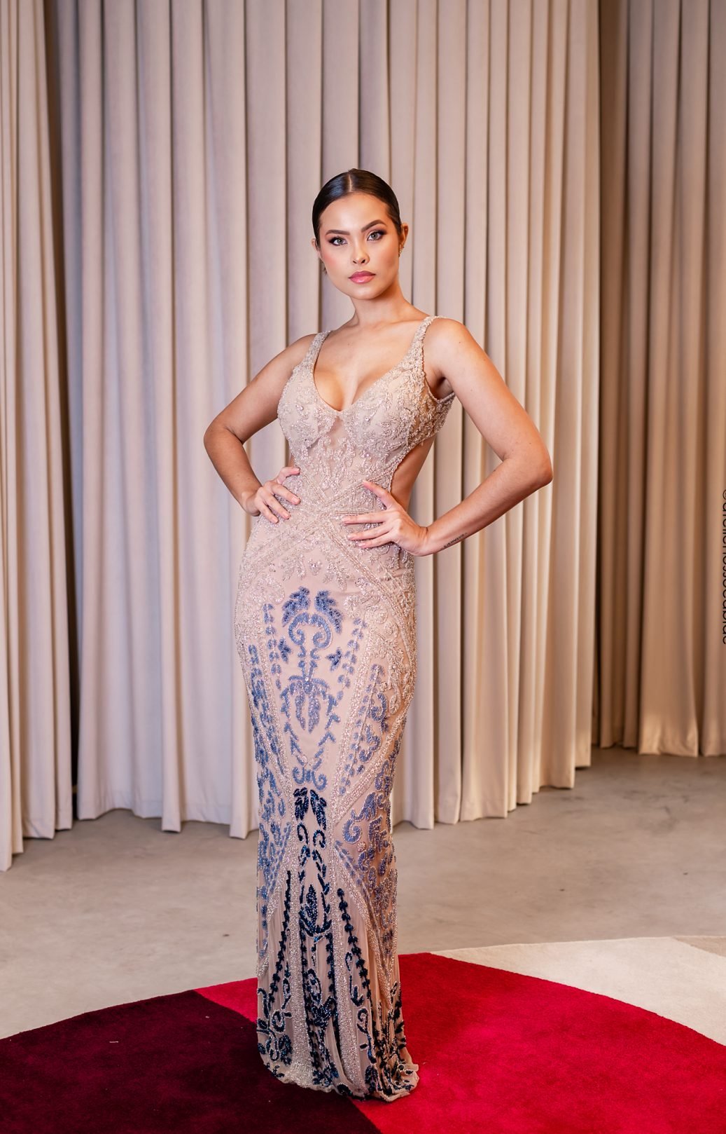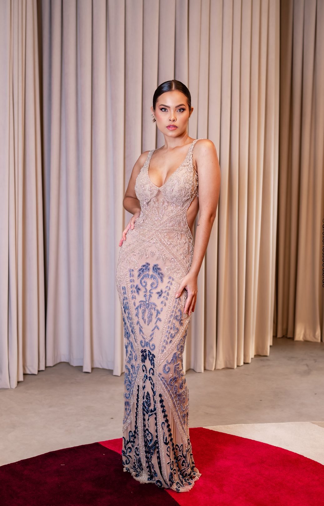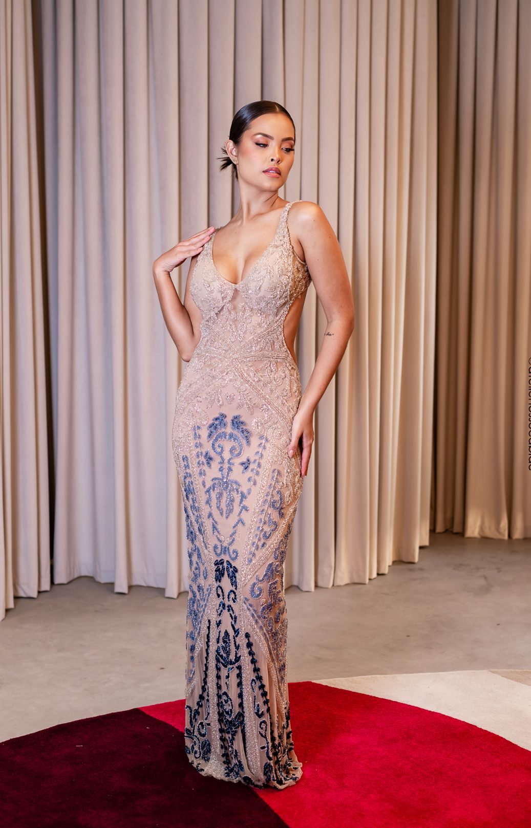 Vestido Longo Bordado com Transparência e Degradê Azul