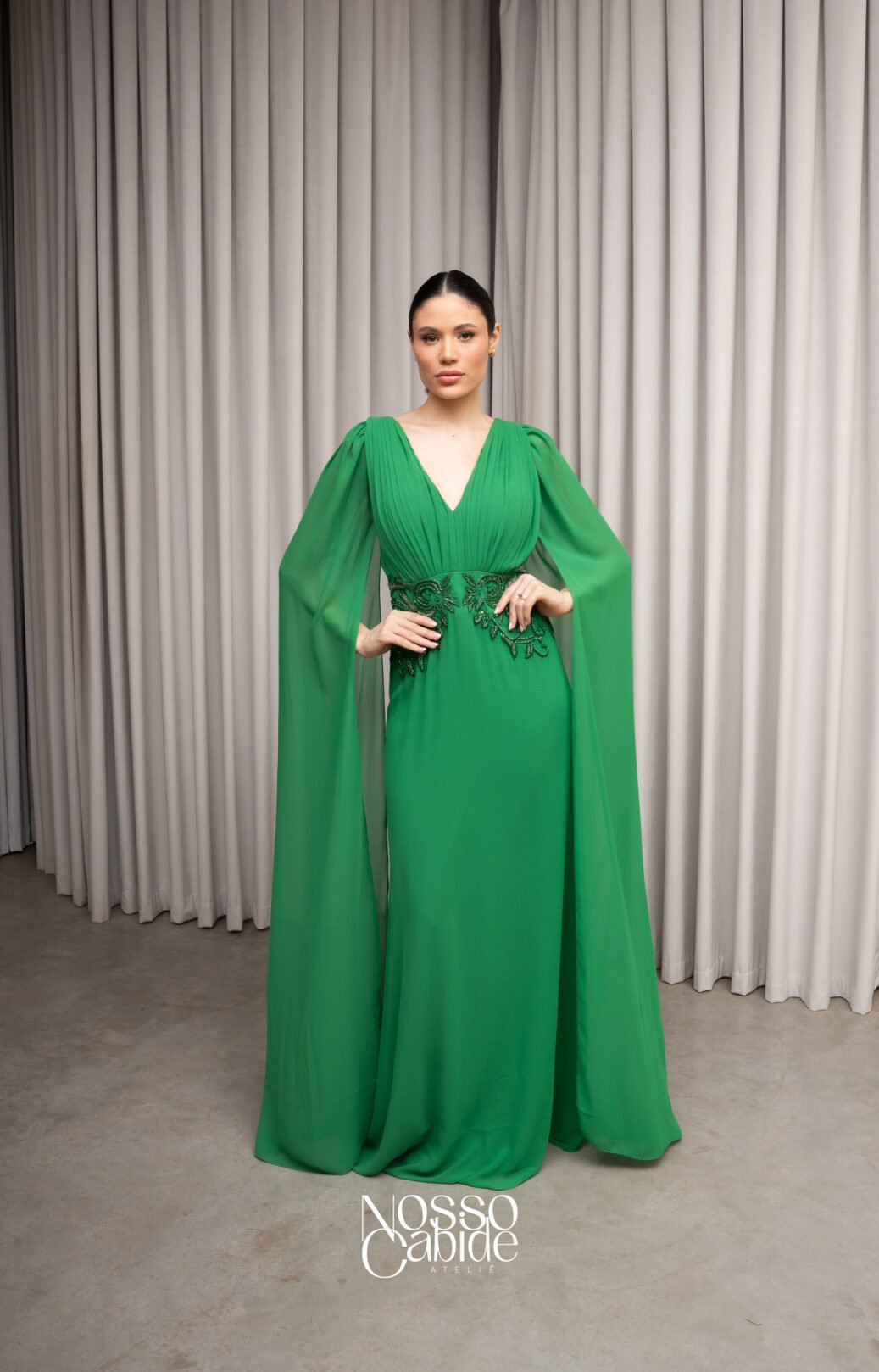 O corte impecável deste vestido realça a silhueta feminina, proporcionando um ajuste perfeito em todas as áreas do corpo. Longa e fluída acrescenta movimento e elegância a cada passo, enquanto valoriza os traços femininos.