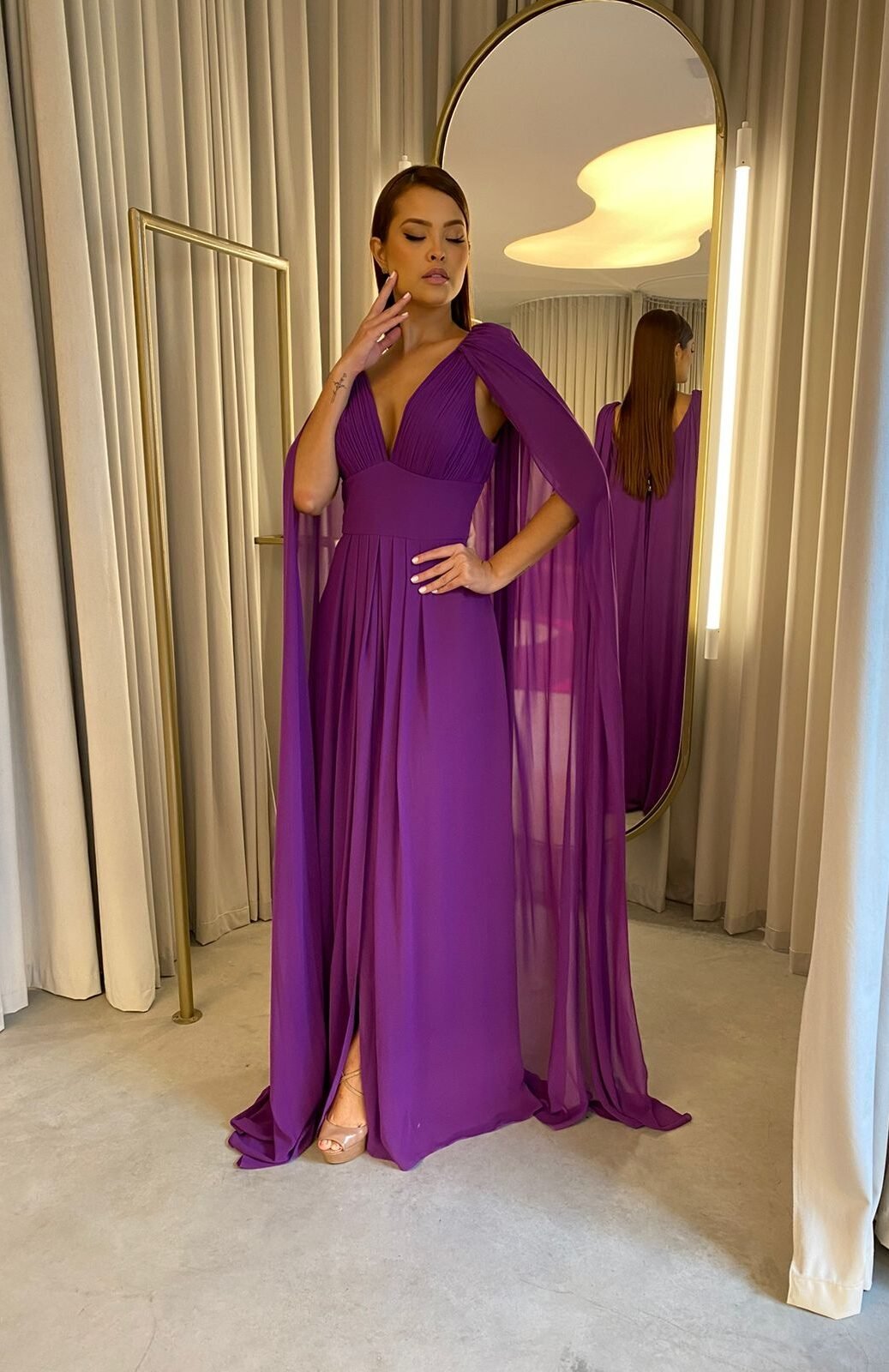 O corte impecável deste vestido realça a silhueta feminina, proporcionando um ajuste perfeito em todas as áreas do corpo. Longa e fluída acrescenta movimento e elegância a cada passo, enquanto valoriza os traços femininos.