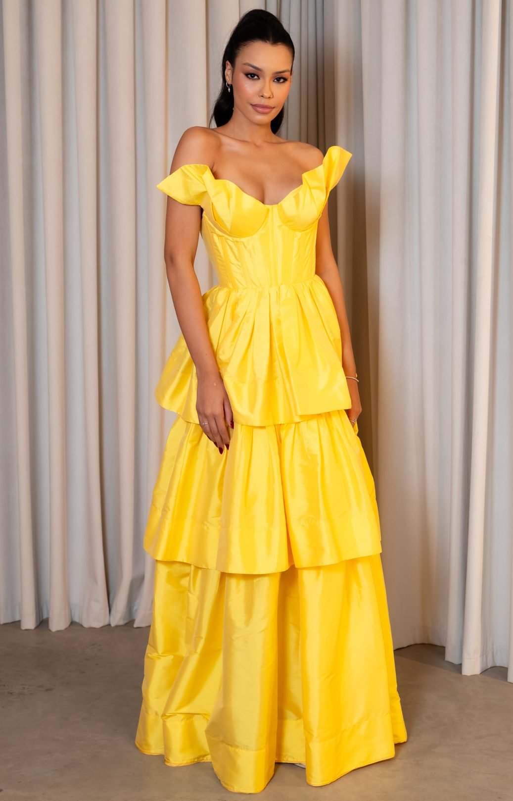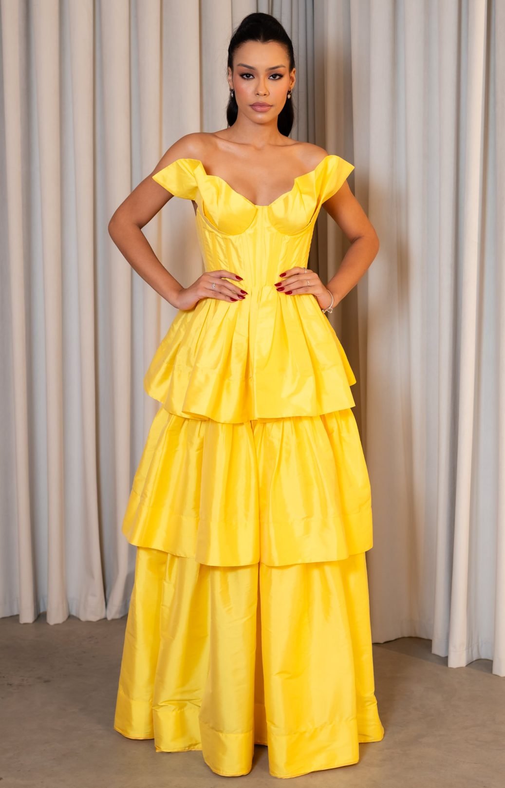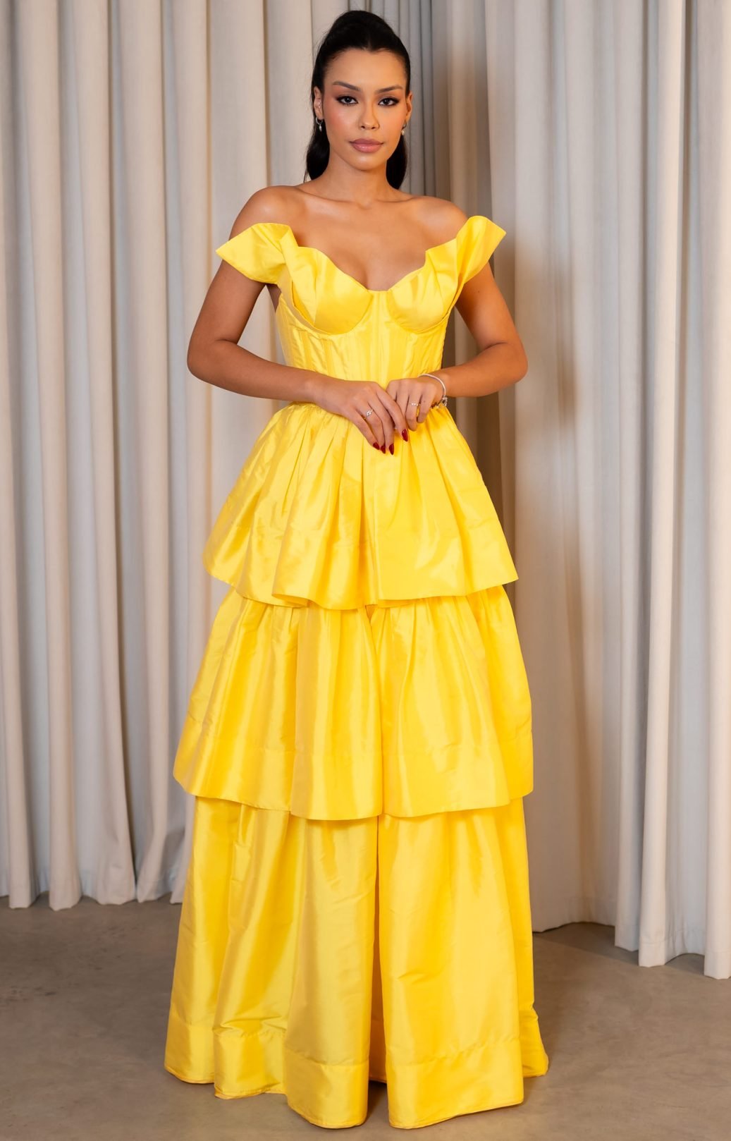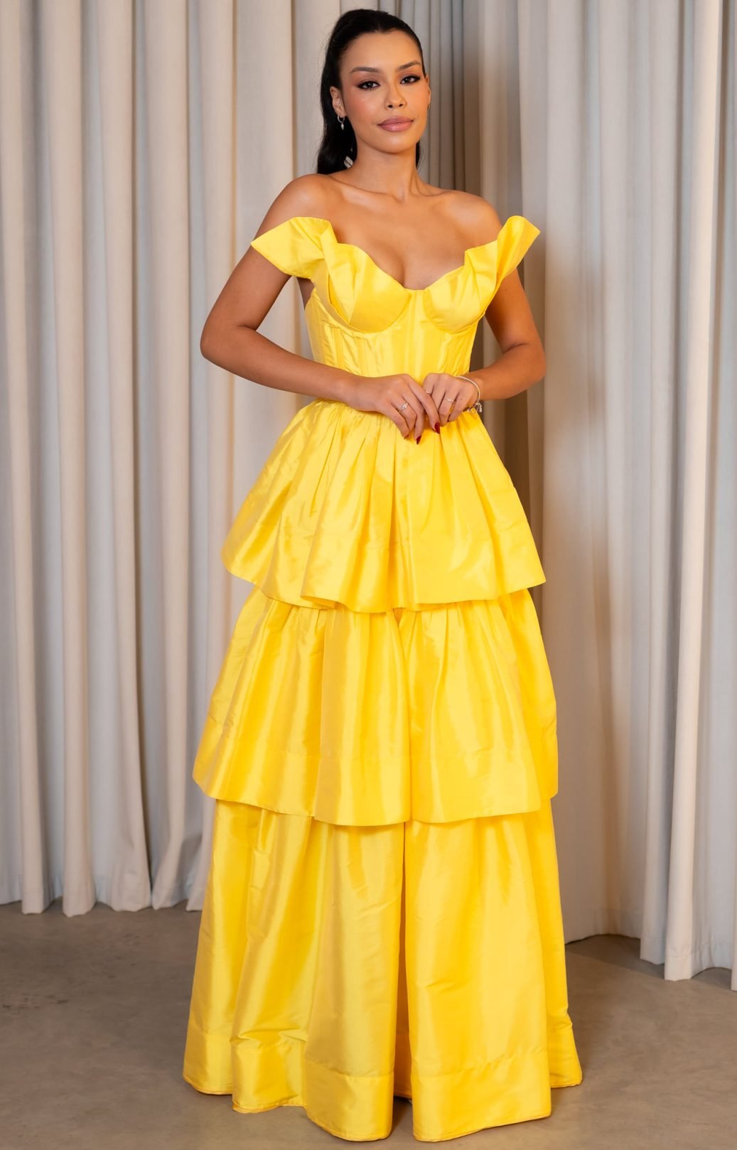 O corte impecável deste vestido realça a silhueta feminina, proporcionando um ajuste perfeito em todas as áreas do corpo. Longa e fluída acrescenta movimento e elegância a cada passo, enquanto valoriza o ombro e o pescoço.