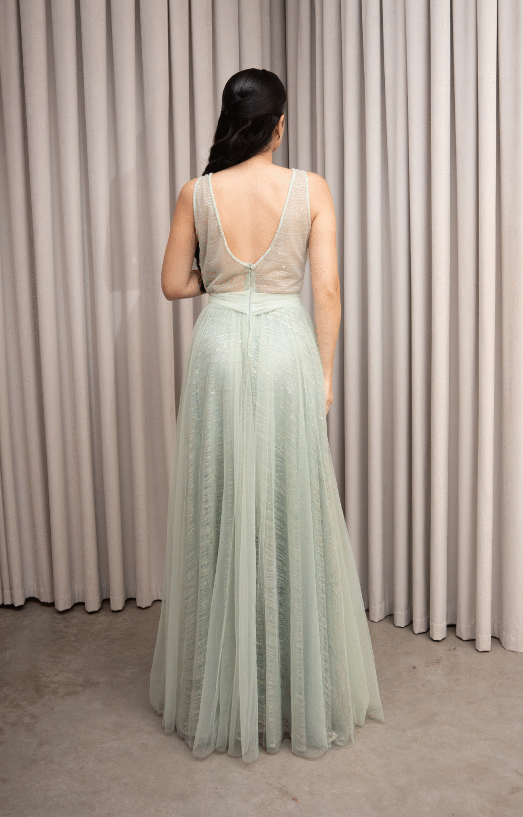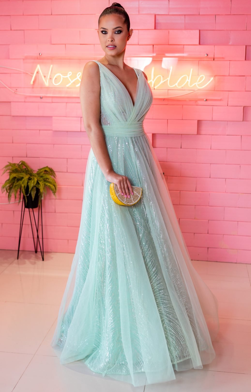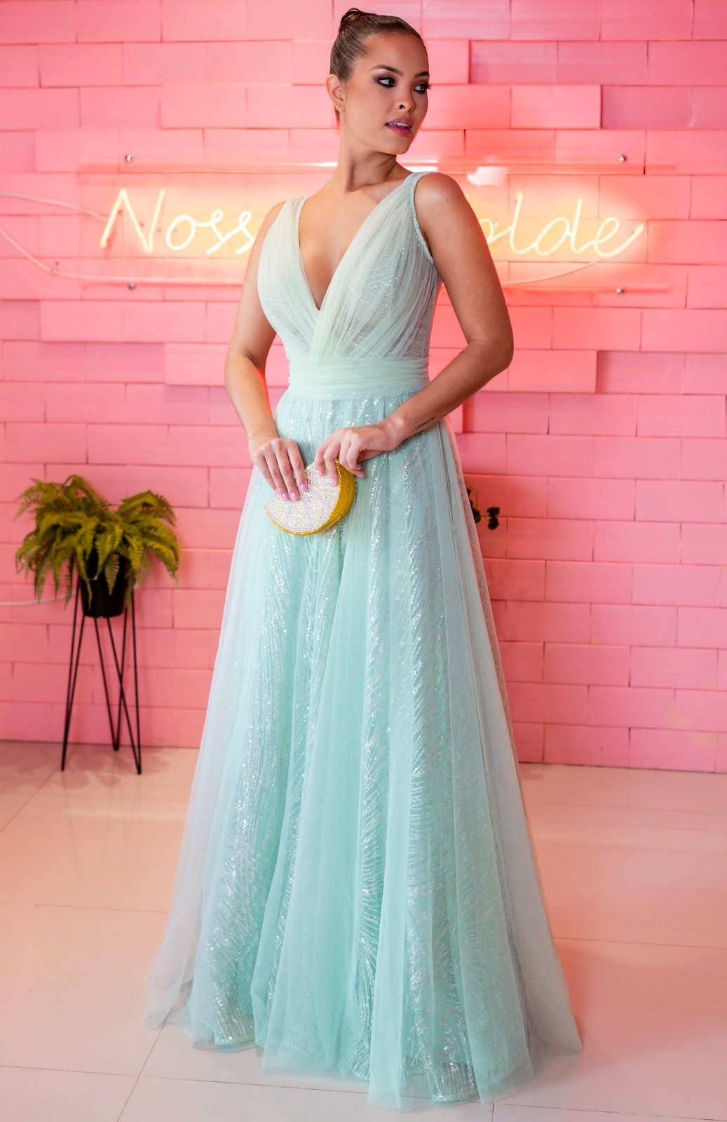 Uma noite de conto de fadas: O vestido verde menta de tule e brilho é a chave para uma festa encantada. Disponível para aluguel!