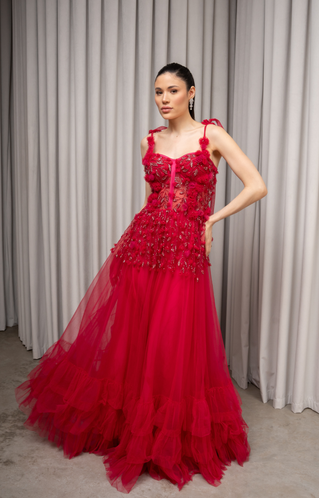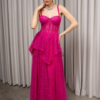 O corte impecável deste vestido realça a silhueta feminina, proporcionando um ajuste perfeito em todas as áreas do corpo. Longa e fluída acrescenta movimento e elegância a cada passo, enquanto valoriza os traços femininos.