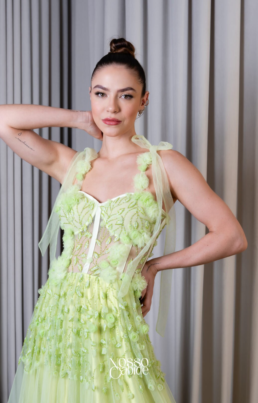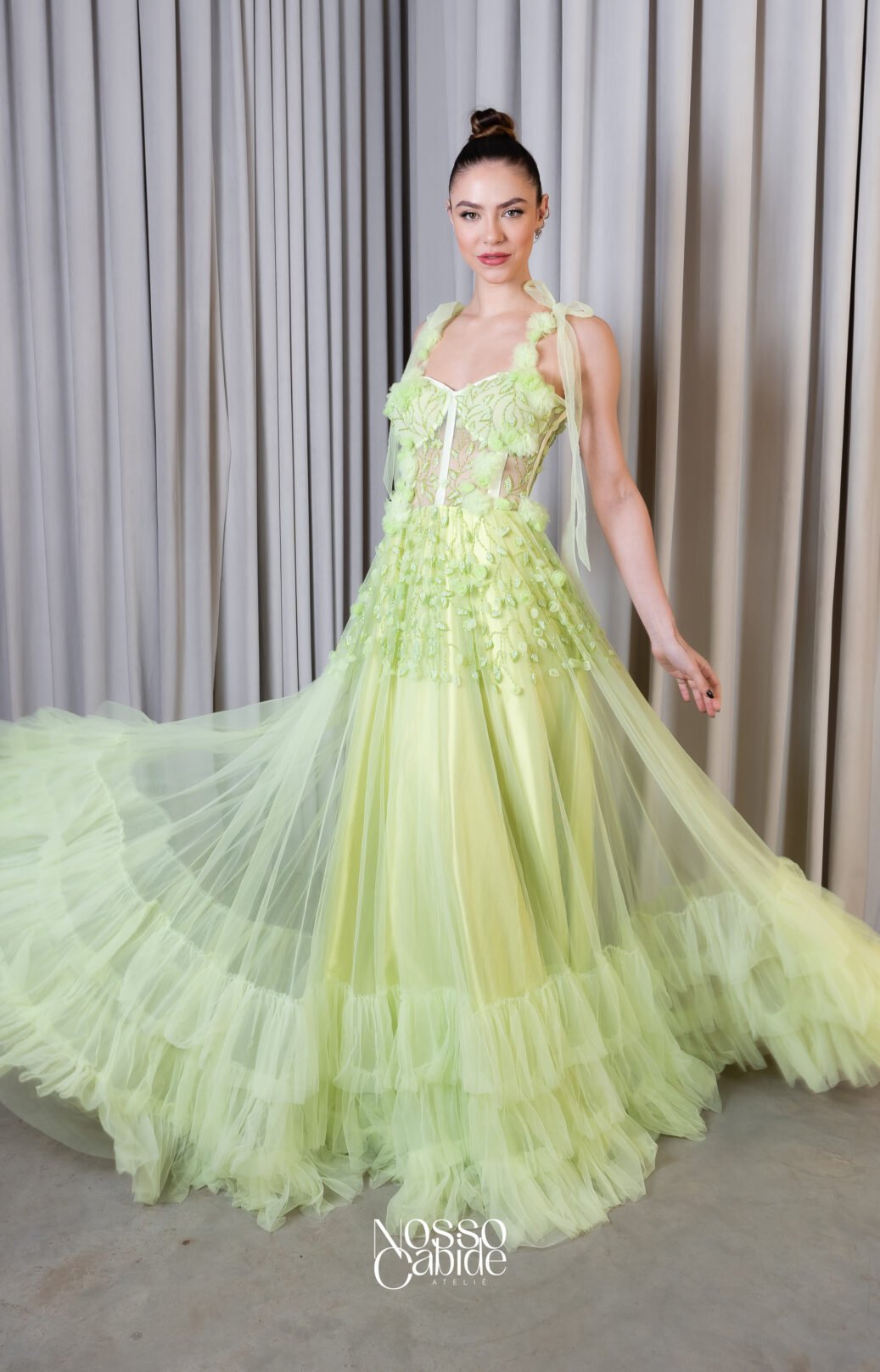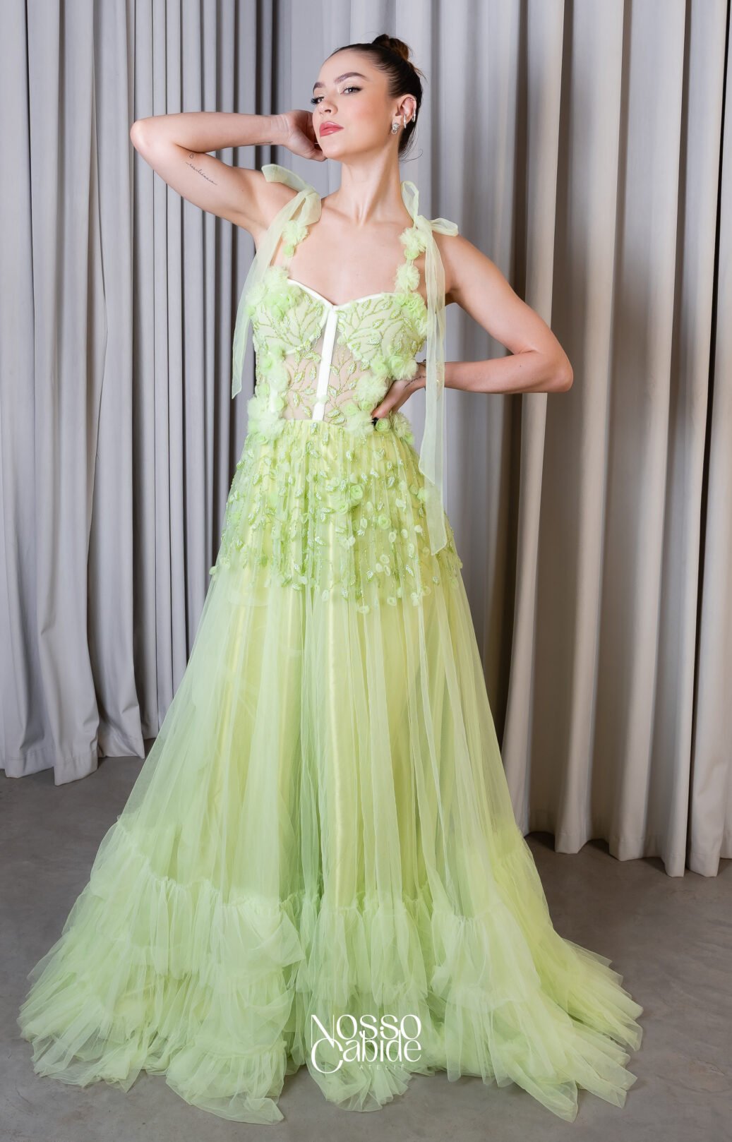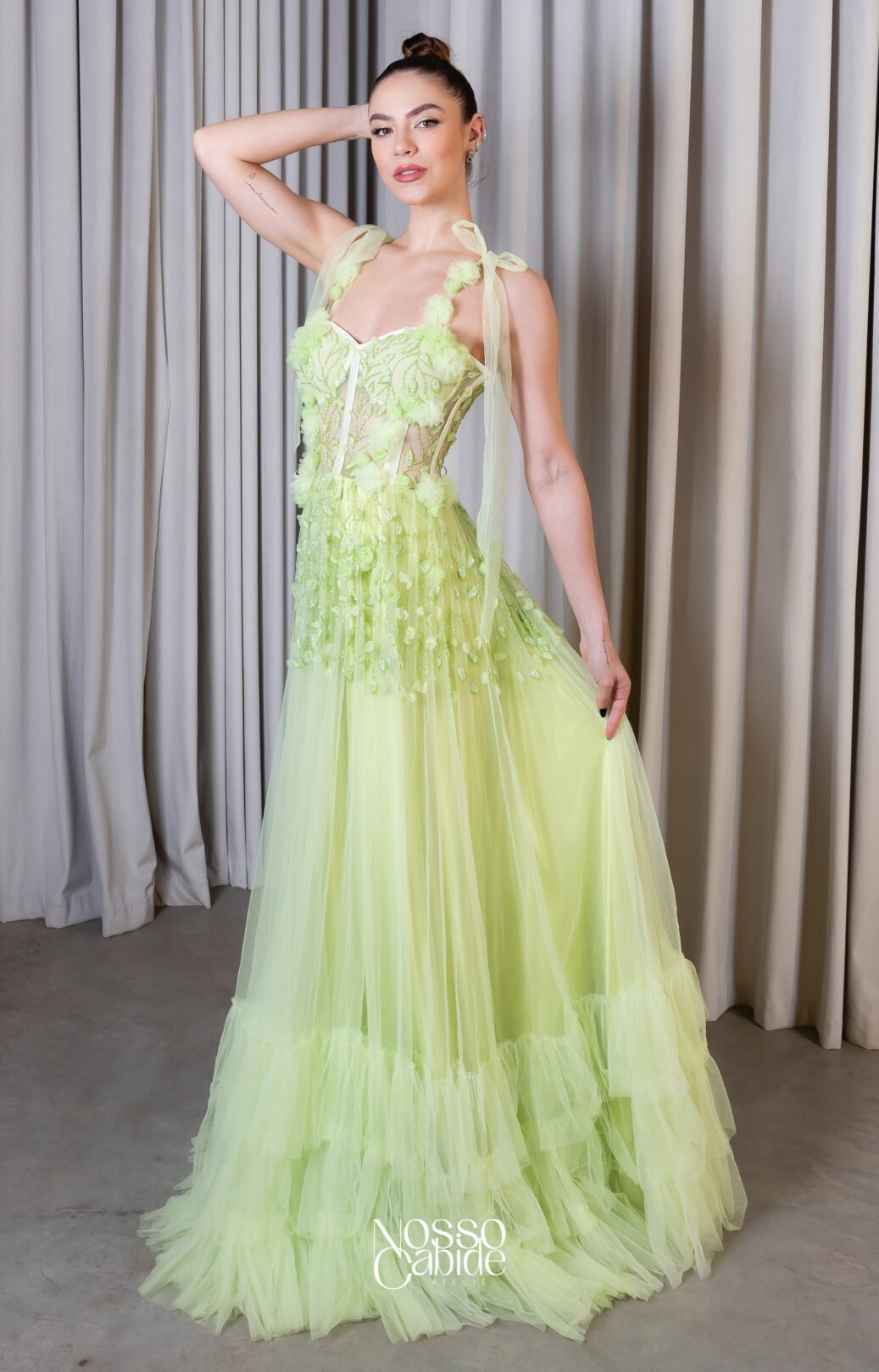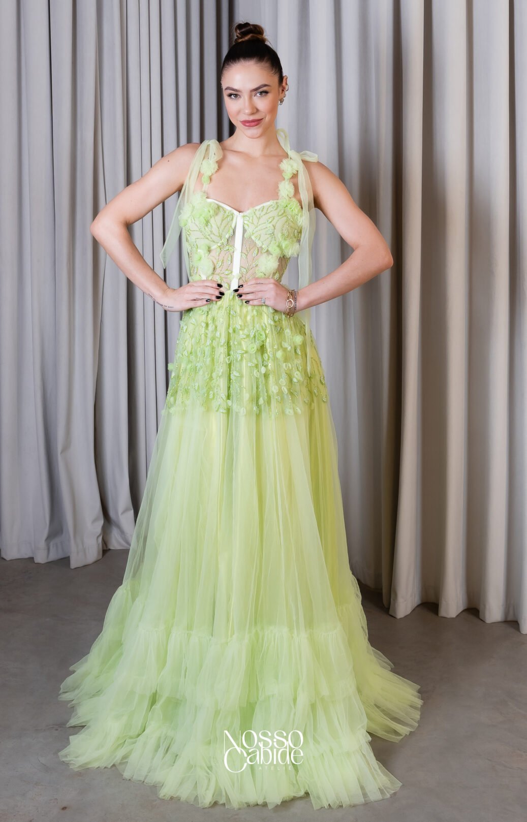 O corte impecável deste vestido realça a silhueta feminina, proporcionando um ajuste perfeito em todas as áreas do corpo. Longa e fluída acrescenta movimento e elegância a cada passo, enquanto valoriza os traços femininos.