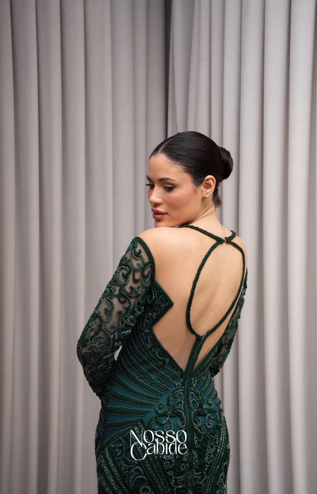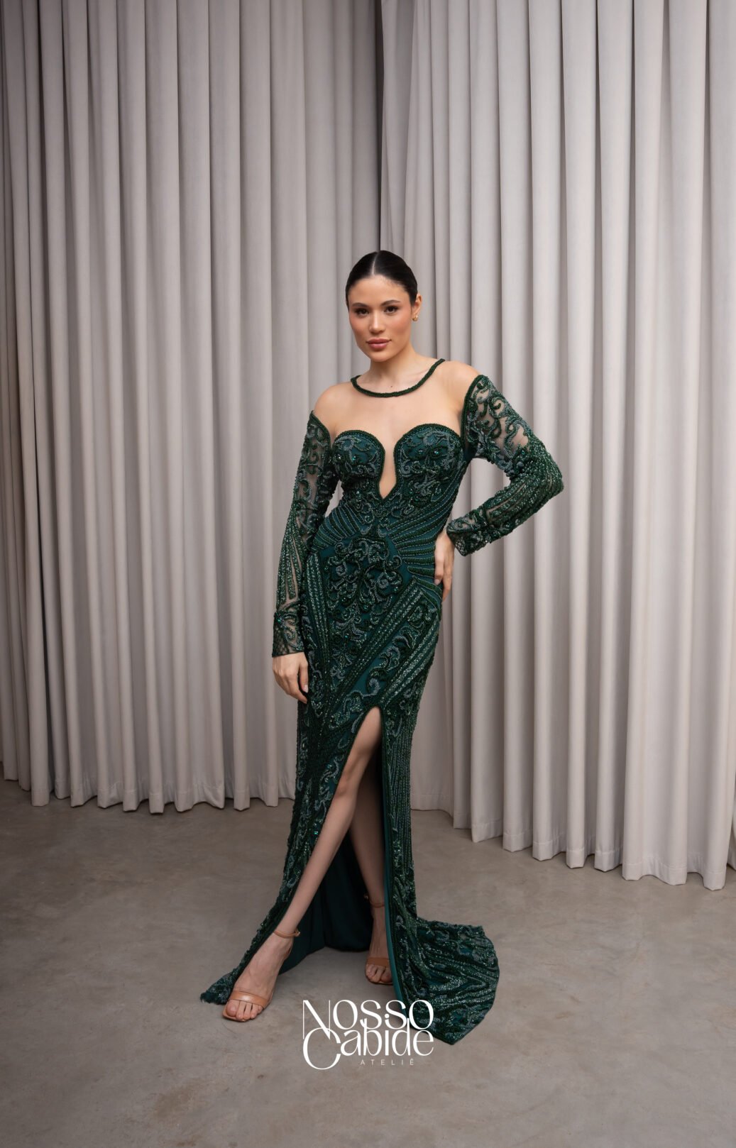 O corte impecável deste vestido realça a silhueta feminina, proporcionando um ajuste perfeito em todas as áreas do corpo. Longa e fluída acrescenta movimento e elegância a cada passo, enquanto valoriza os traços femininos.