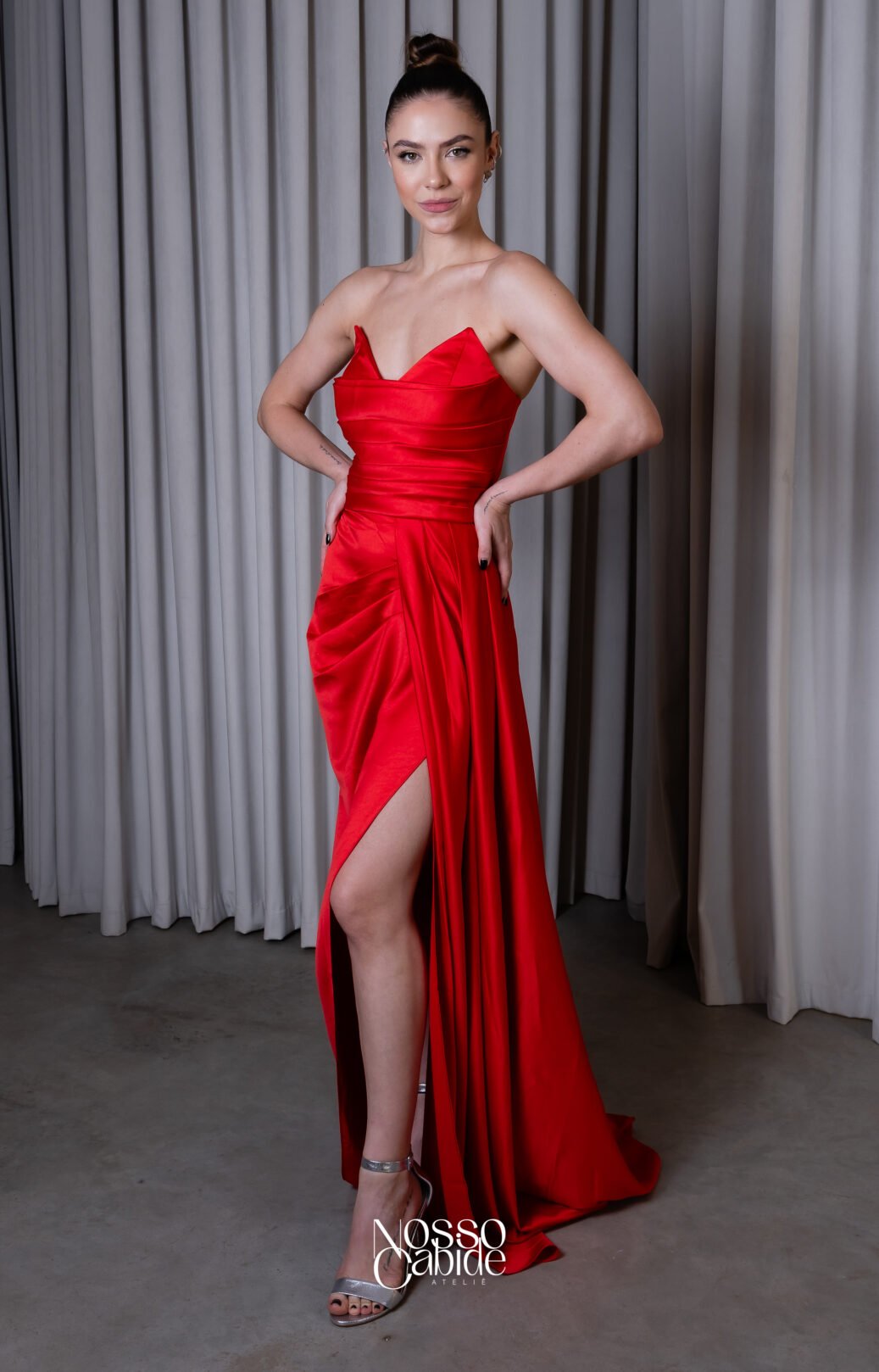 O corte impecável deste vestido realça a silhueta feminina, proporcionando um ajuste perfeito em todas as áreas do corpo. Longa e fluída acrescenta movimento e elegância a cada passo, enquanto valoriza os traços femininos.