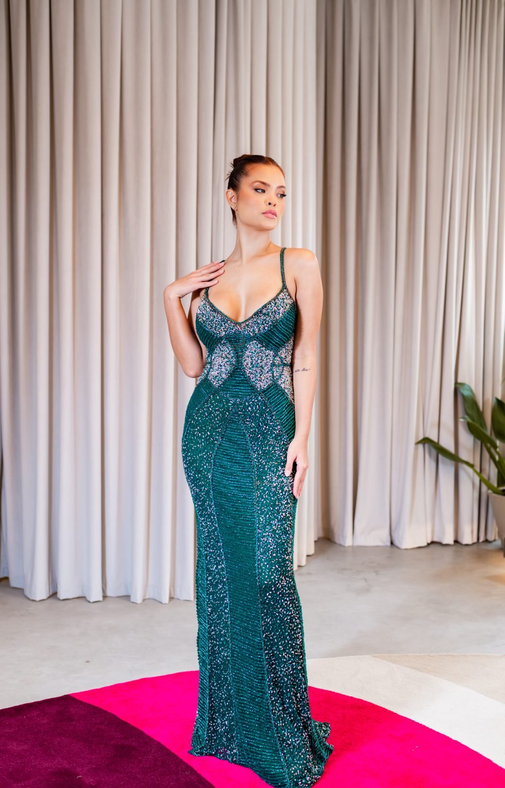 O verde intenso é uma escolha ousada e vibrante, que faz com que você se destaque em qualquer lugar. A cor transmite uma energia contagiante e um espírito alegre, o que torna o vestido perfeito para ocasiões especiais.
