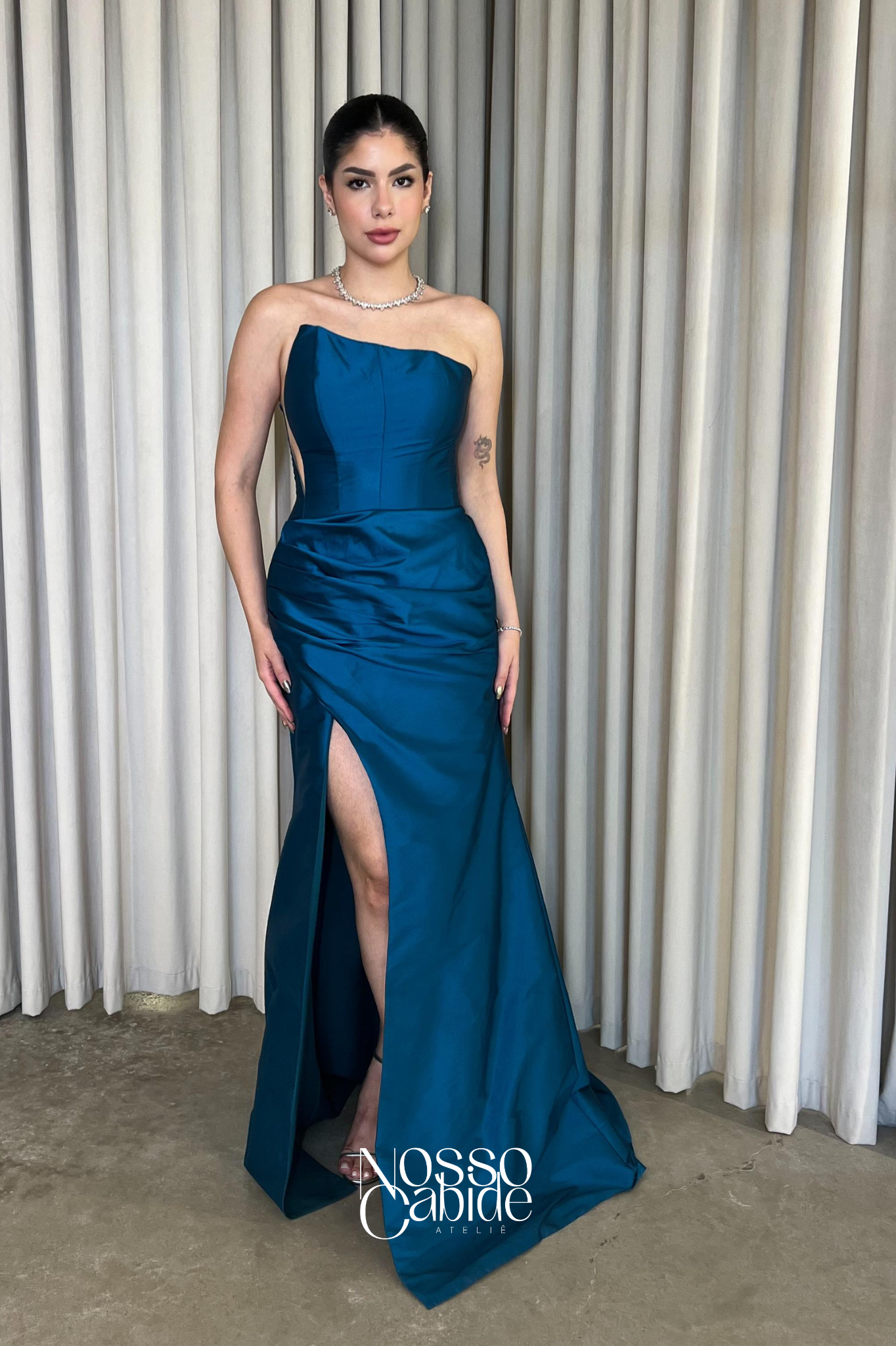 O corte impecável deste vestido realça a silhueta feminina, proporcionando um ajuste perfeito em todas as áreas do corpo. Longa e fluída acrescenta movimento e elegância a cada passo, enquanto valoriza os traços femininos.