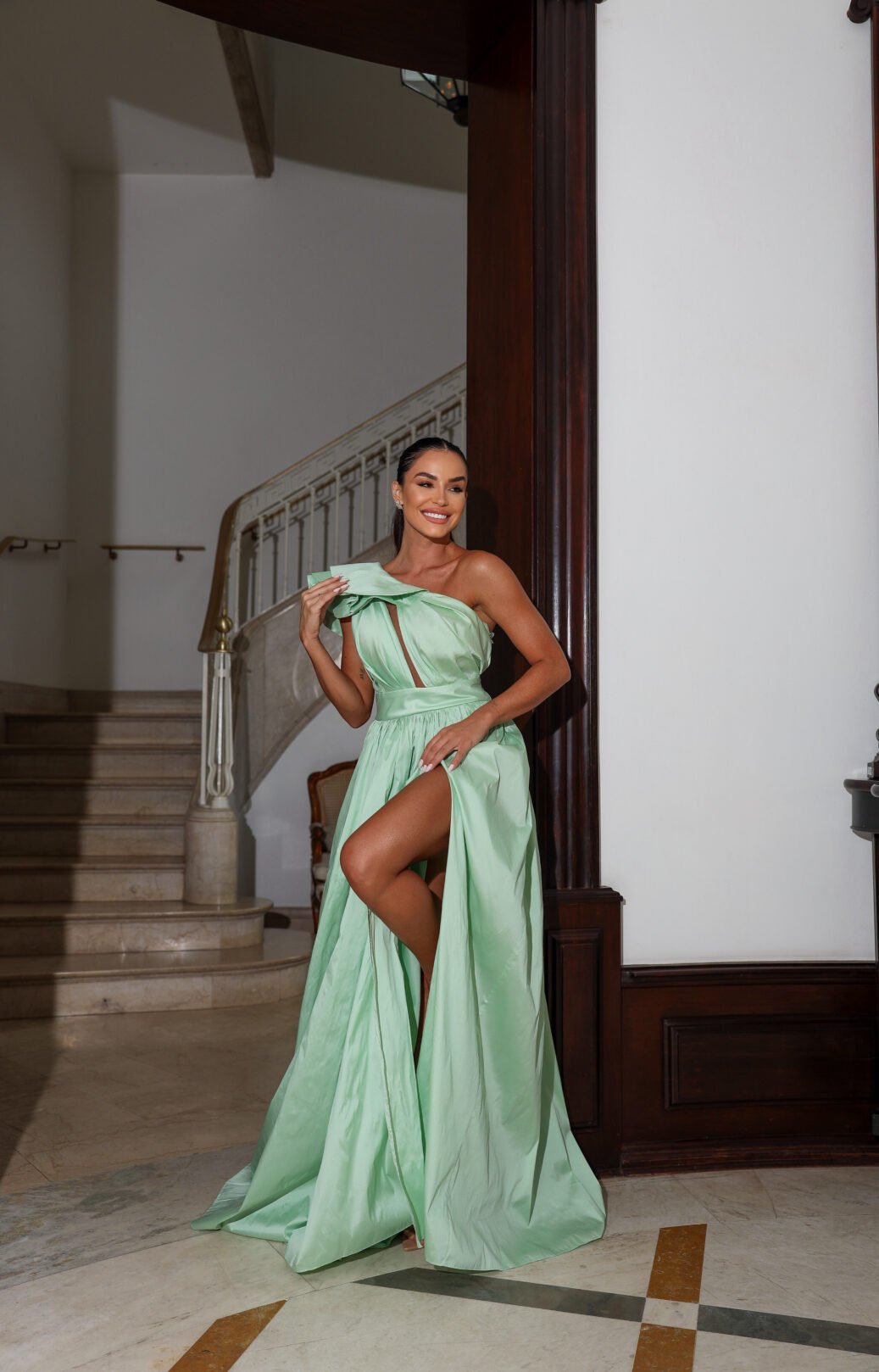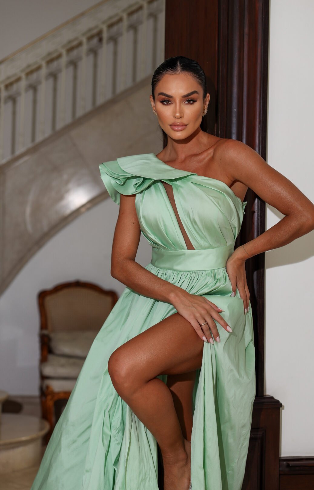 O corte impecável deste vestido realça a silhueta feminina, proporcionando um ajuste perfeito em todas as áreas do corpo. Longa e fluída acrescenta movimento e elegância a cada passo, enquanto valoriza os traços femininos.