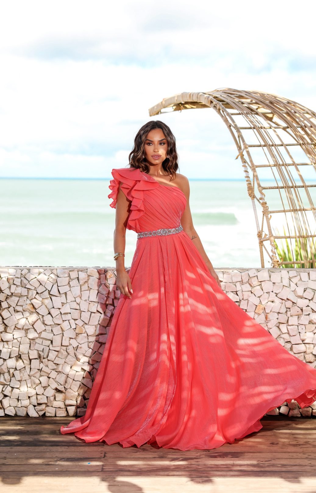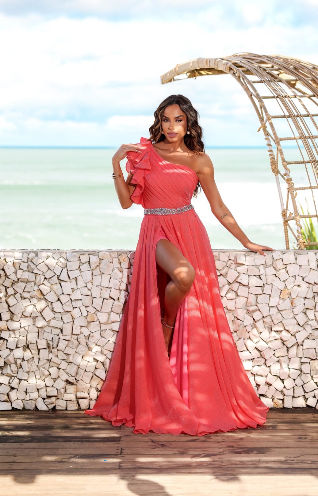 O corte impecável deste vestido realça a silhueta feminina, proporcionando um ajuste perfeito em todas as áreas do corpo. Longa e fluída acrescenta movimento e elegância a cada passo, enquanto valoriza o ombro e o pescoço.
