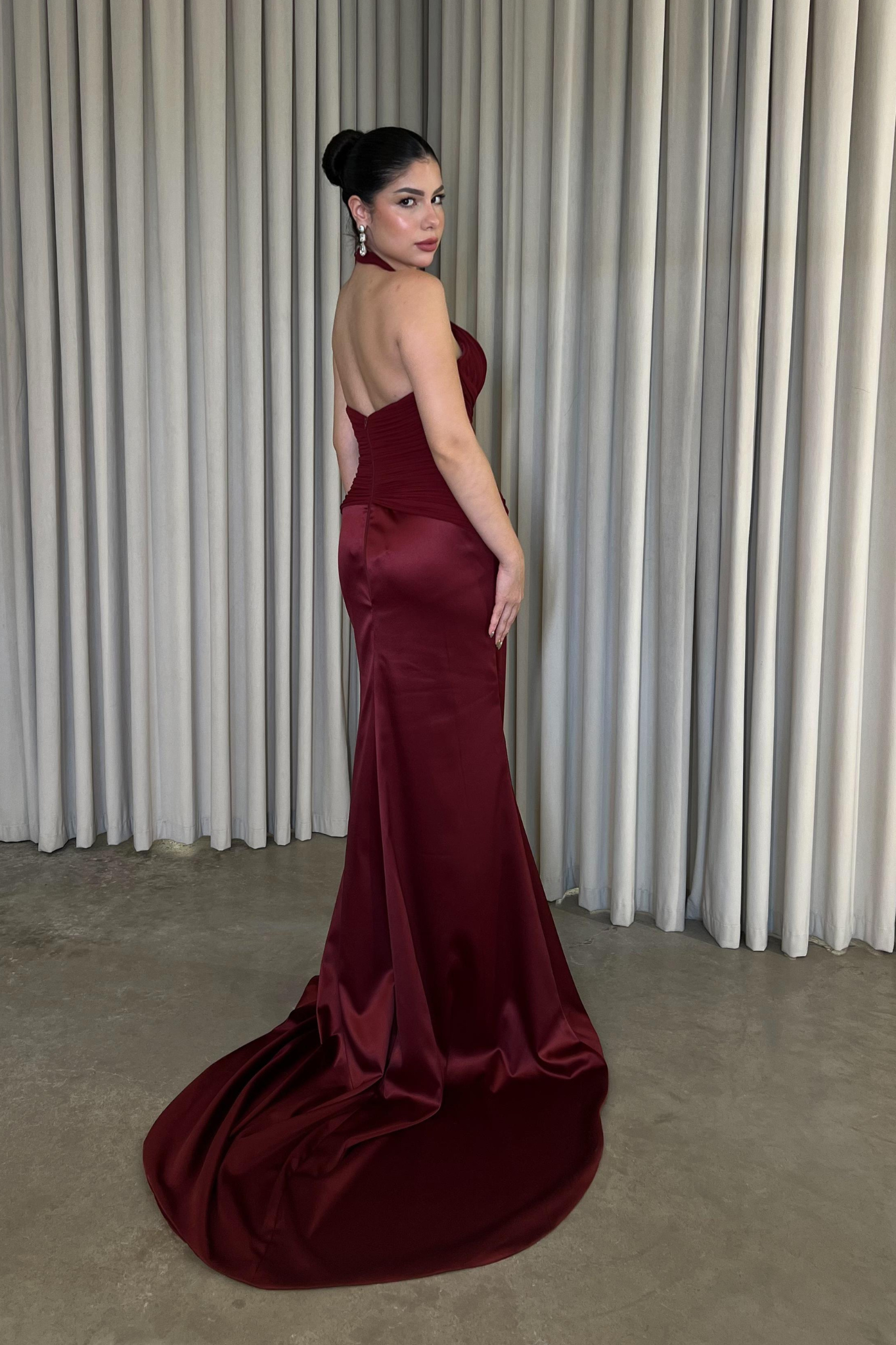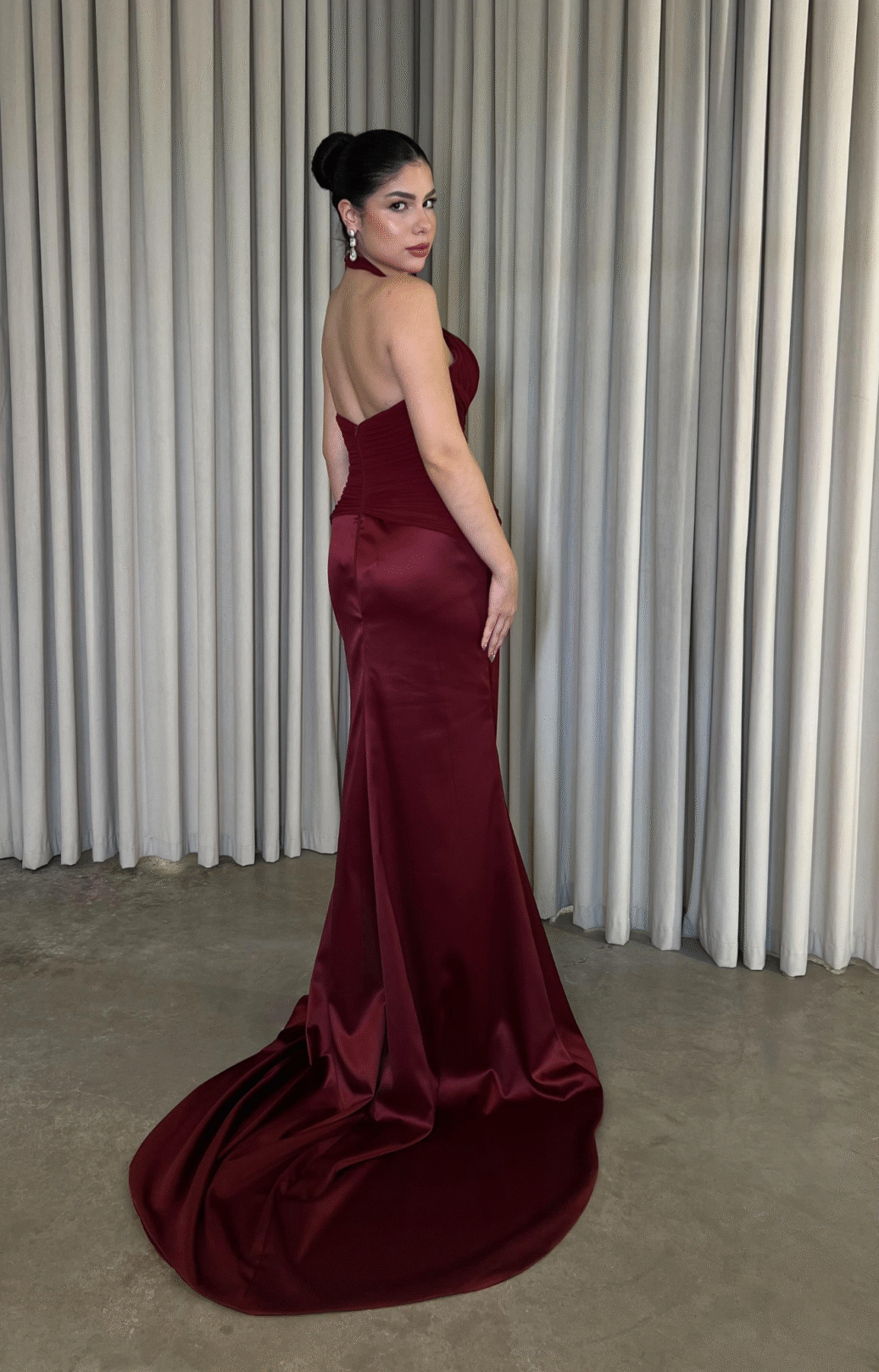 O corte impecável deste vestido realça a silhueta feminina, proporcionando um ajuste perfeito em todas as áreas do corpo. Longa e fluída acrescenta movimento e elegância a cada passo, enquanto valoriza os traços femininos.