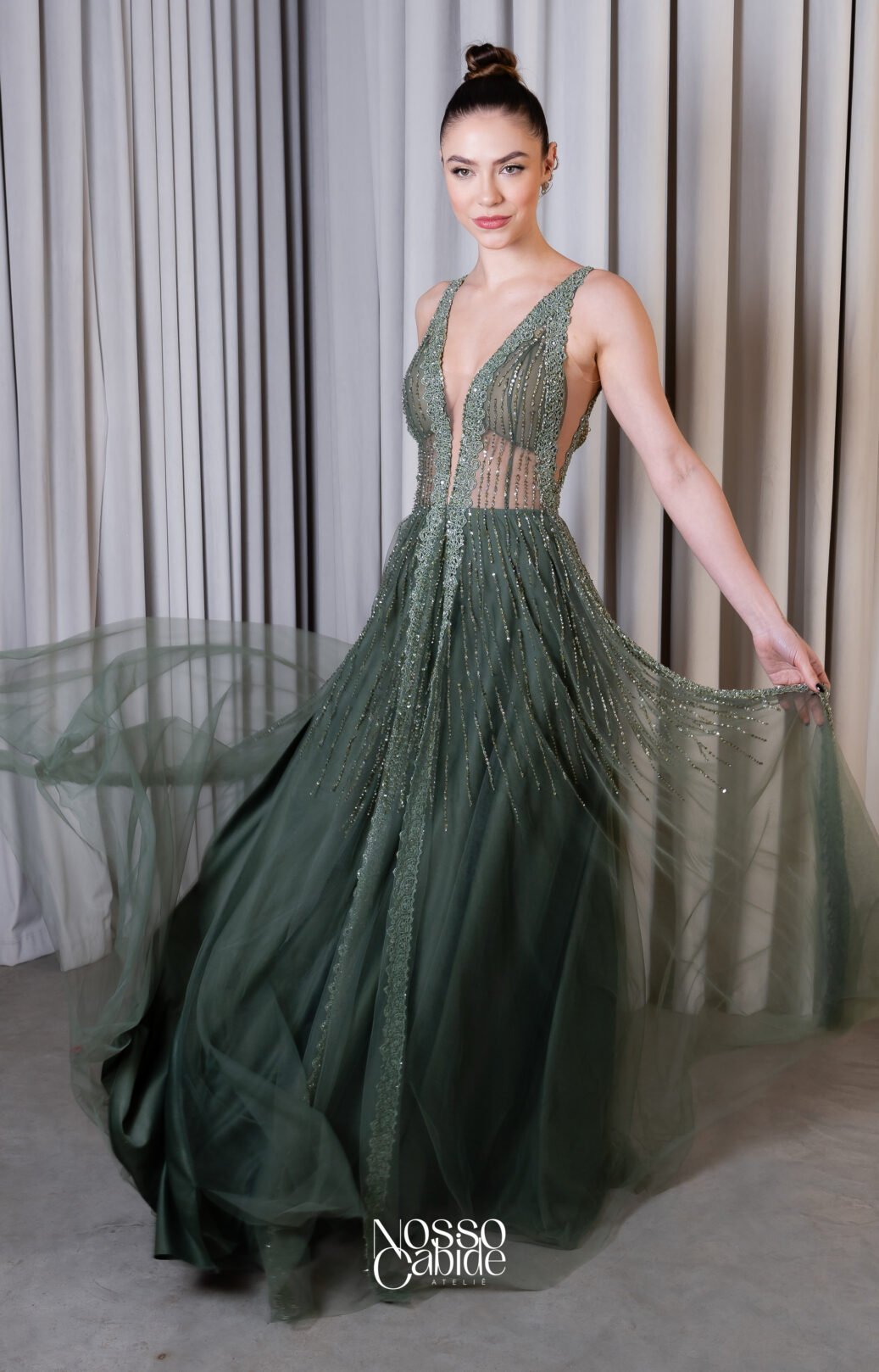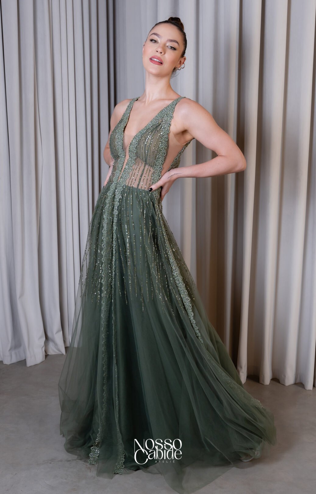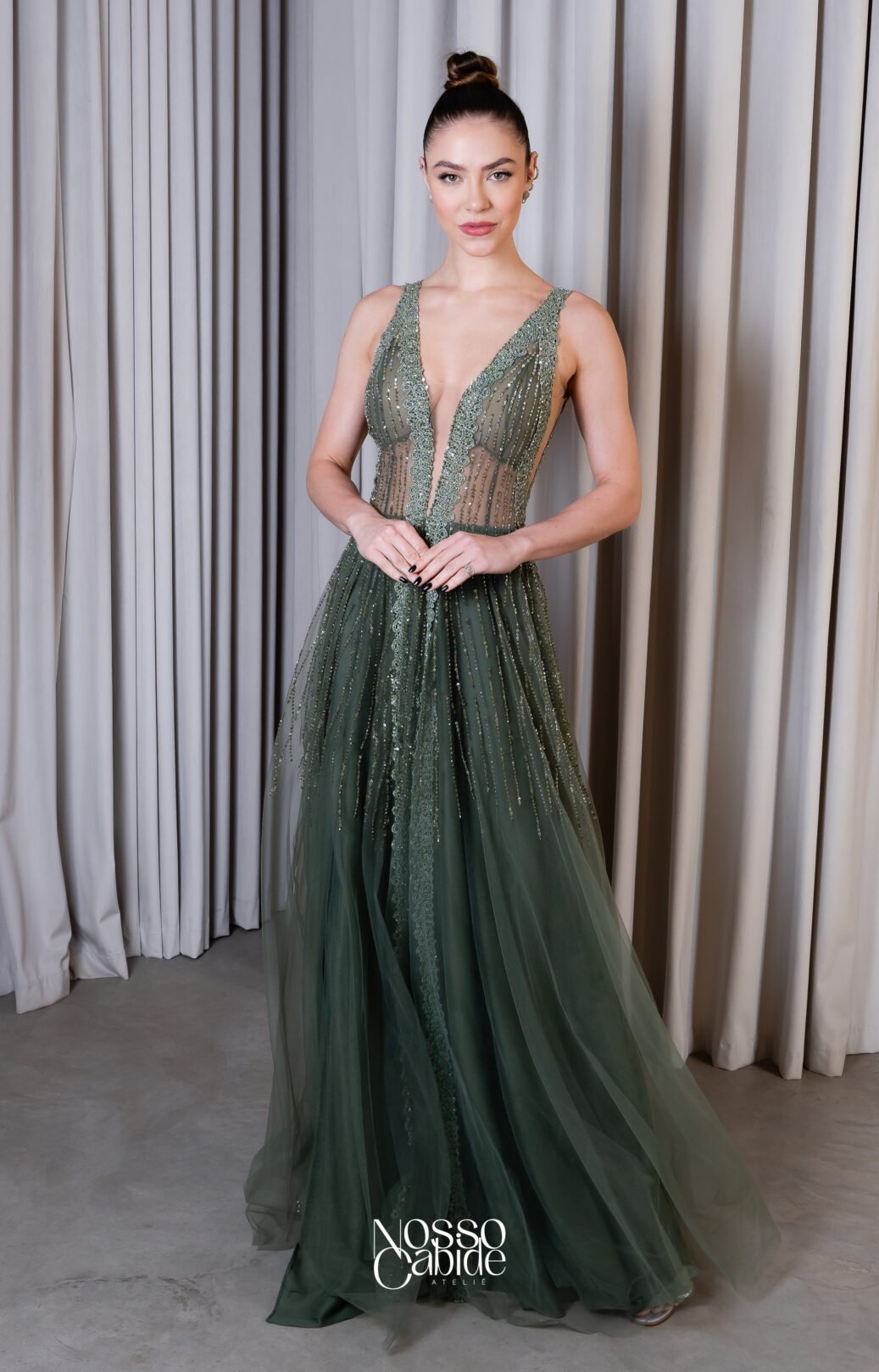 O corte impecável deste vestido realça a silhueta feminina, proporcionando um ajuste perfeito em todas as áreas do corpo. Longa e fluída acrescenta movimento e elegância a cada passo, enquanto valoriza os traços femininos.