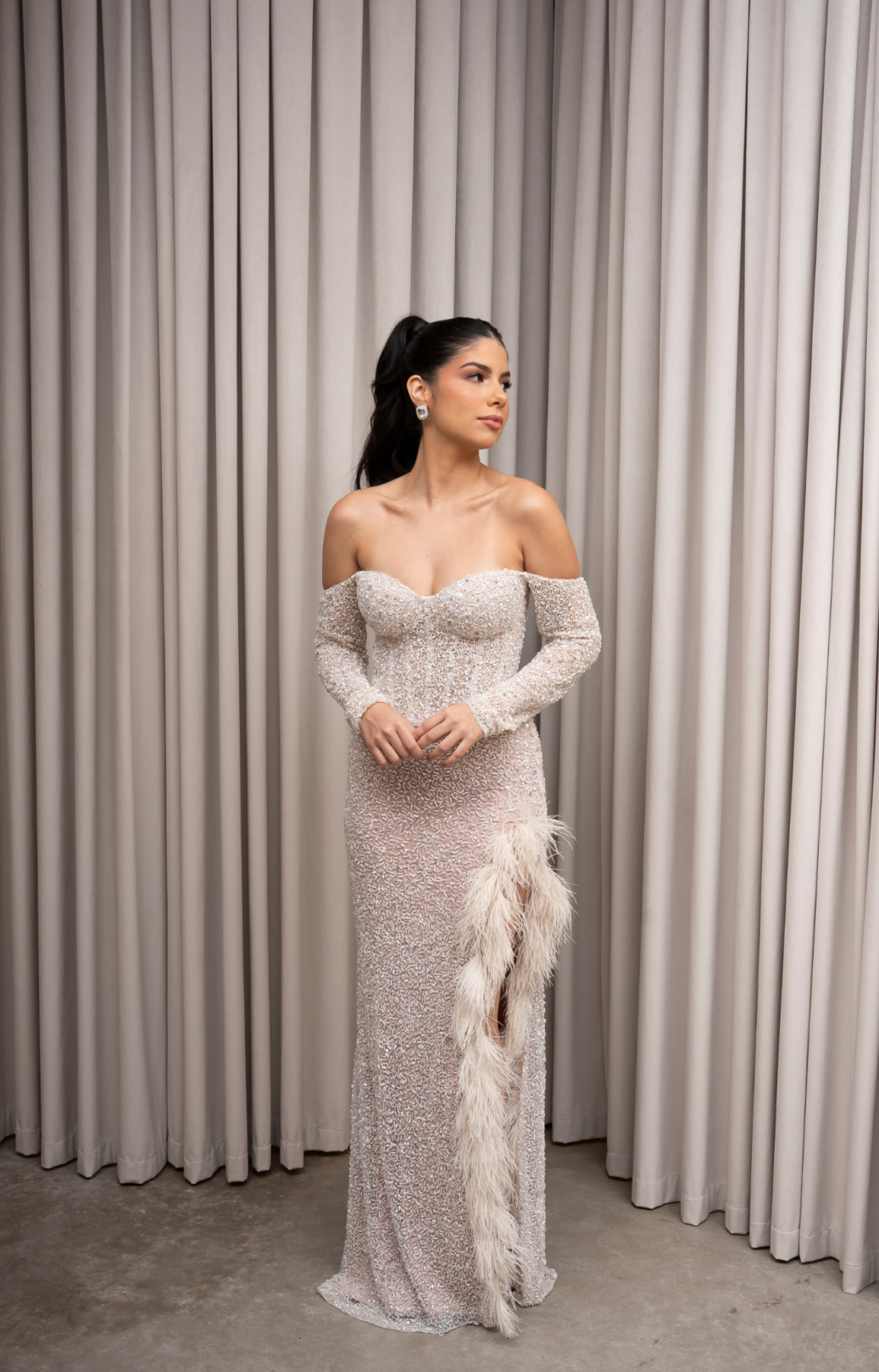 O corte impecável deste vestido realça a silhueta feminina, proporcionando um ajuste perfeito em todas as áreas do corpo. Longa e fluída acrescenta movimento e elegância a cada passo, enquanto valoriza os traços femininos.