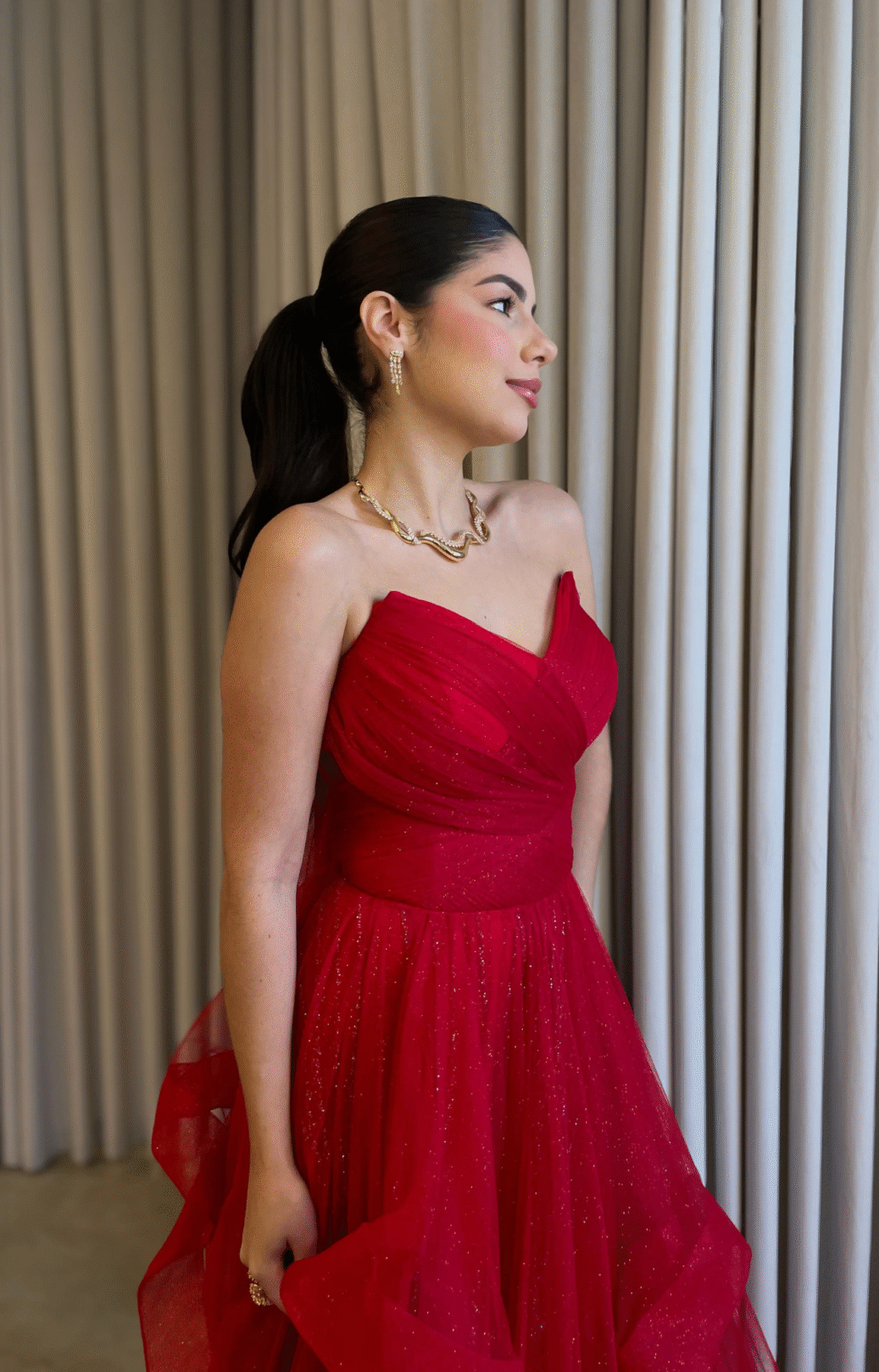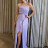 O corte impecável deste vestido realça a silhueta feminina, proporcionando um ajuste perfeito em todas as áreas do corpo. Longa e fluída acrescenta movimento e elegância a cada passo, enquanto valoriza os traços femininos.