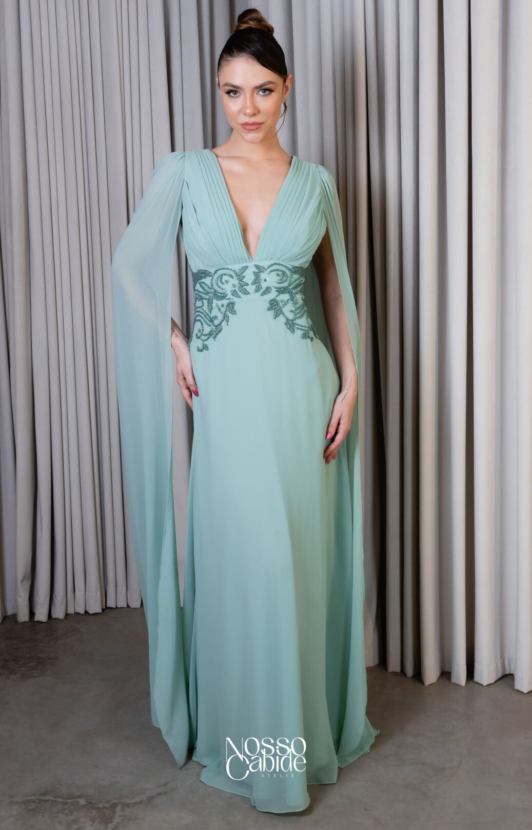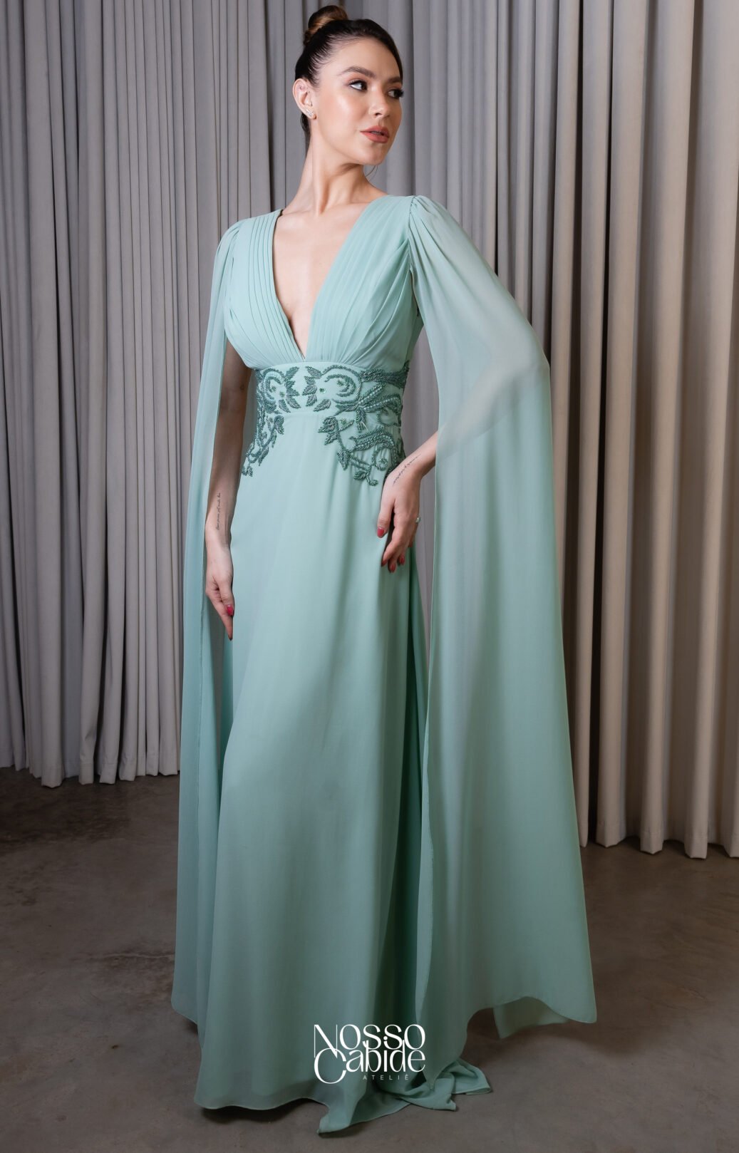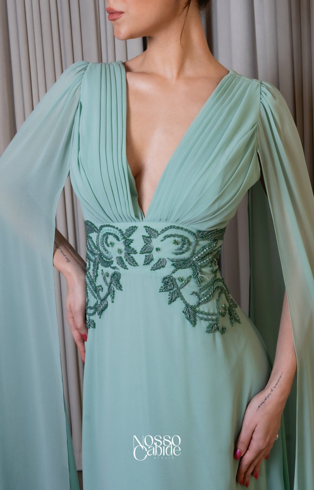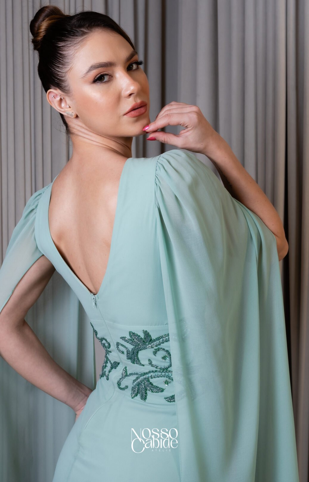 Este vestido é a perfeita combinação de delicadeza e elegância. O verde claro traz uma sensação de frescor e renovação, enquanto as mangas fluidas adicionam movimento e graciosidade ao visual. Use este vestido para uma noite especial.. sua beleza única irá brilhar em qualquer ocasião.