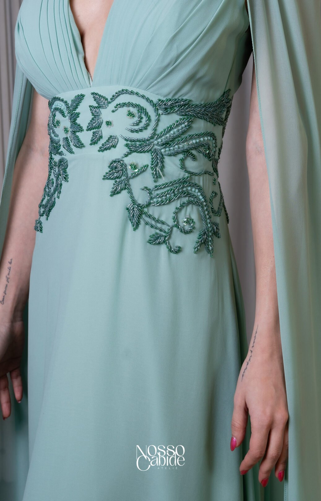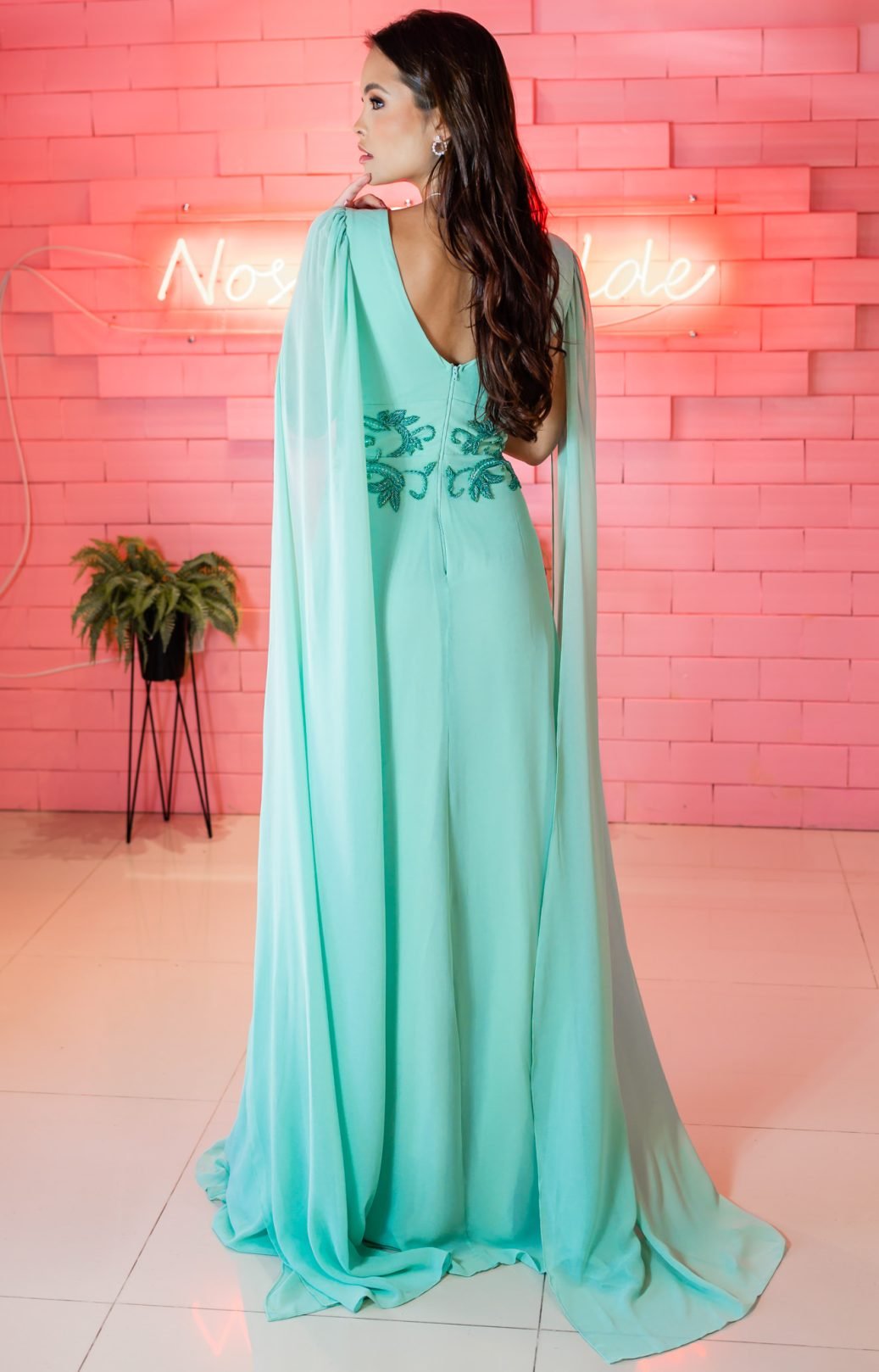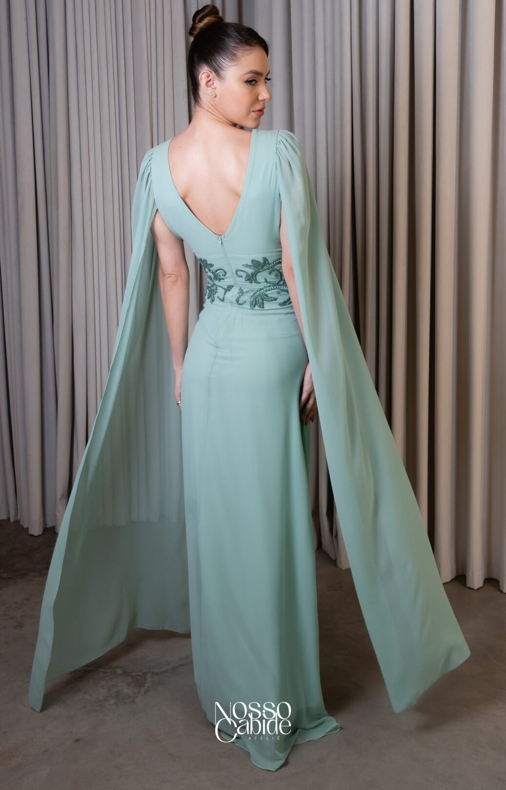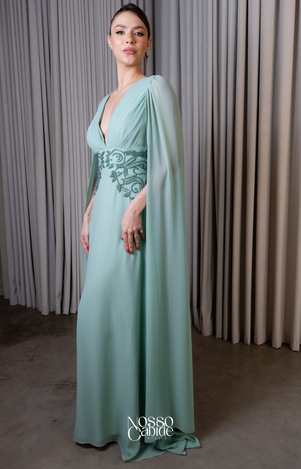 Este vestido é a perfeita combinação de delicadeza e elegância. O verde claro traz uma sensação de frescor e renovação, enquanto as mangas fluidas adicionam movimento e graciosidade ao visual. Use este vestido para uma noite especial.. sua beleza única irá brilhar em qualquer ocasião.