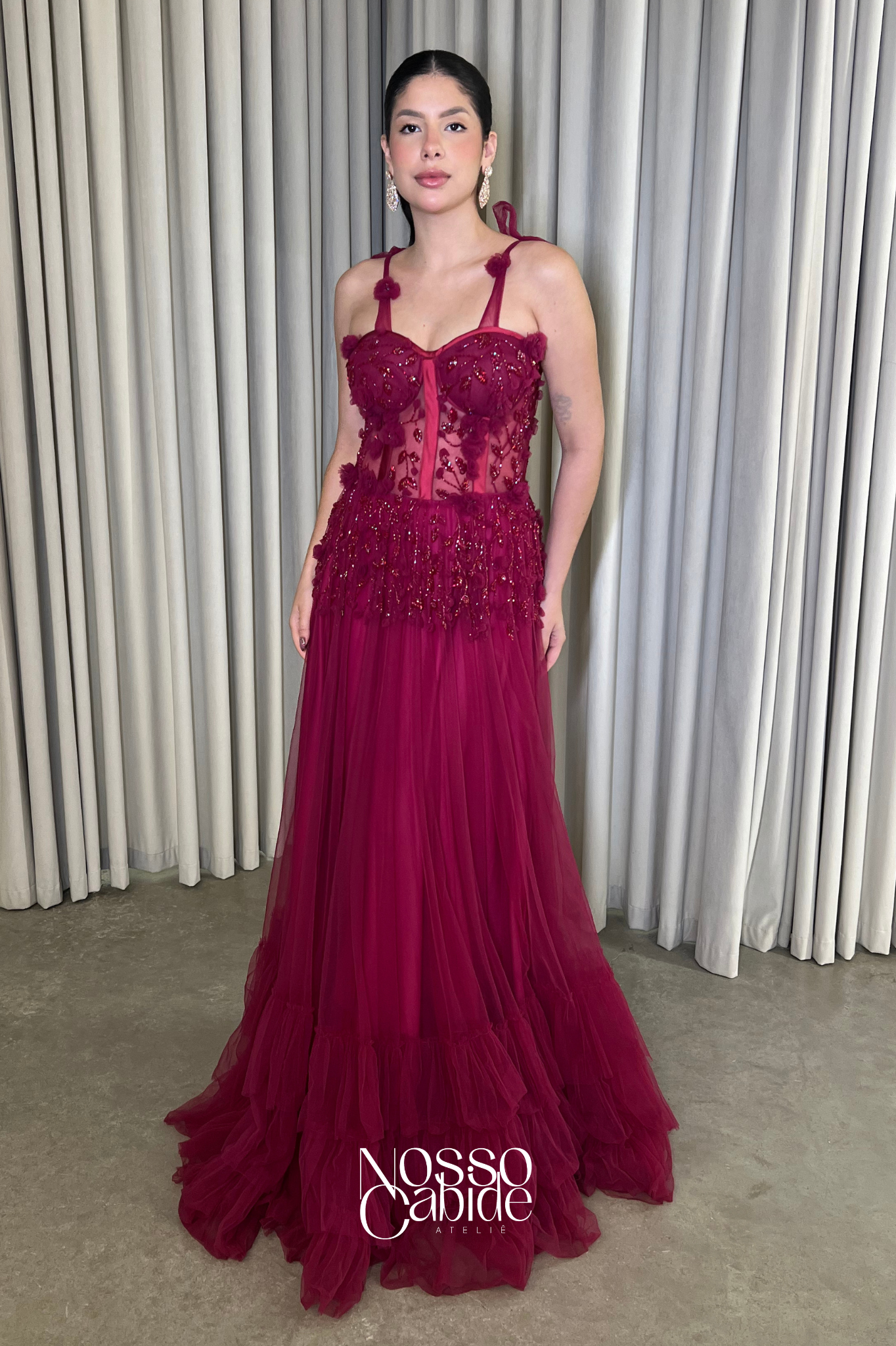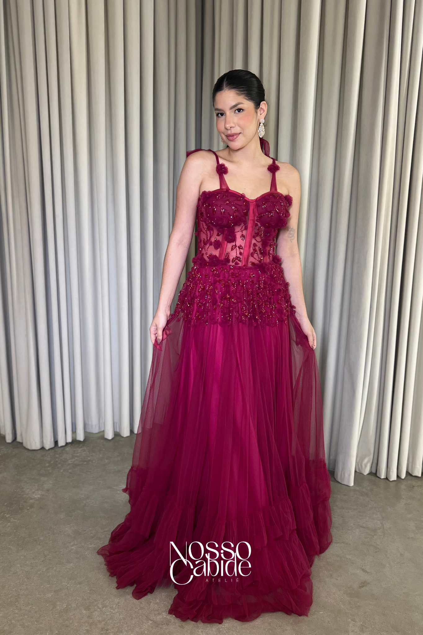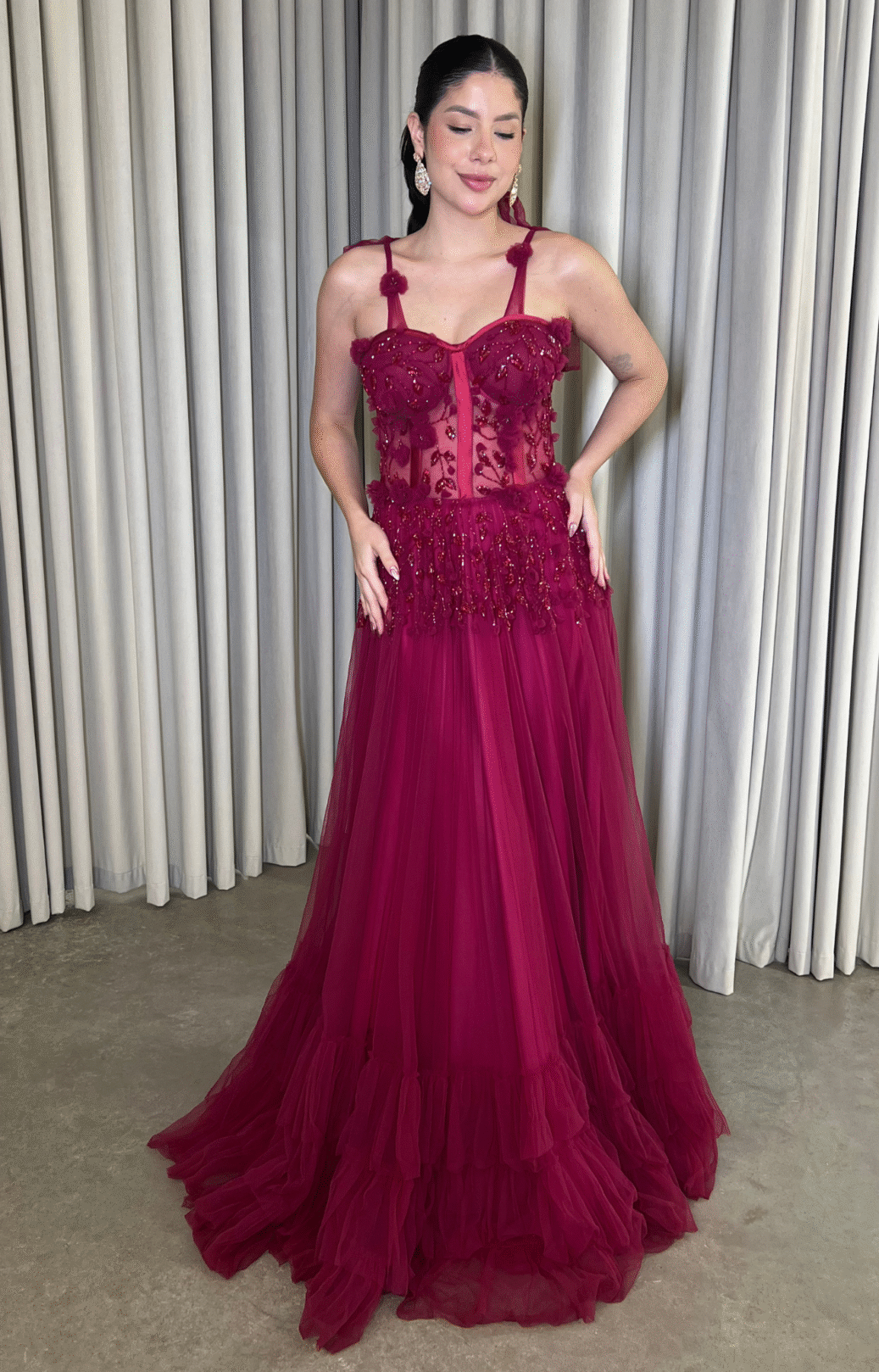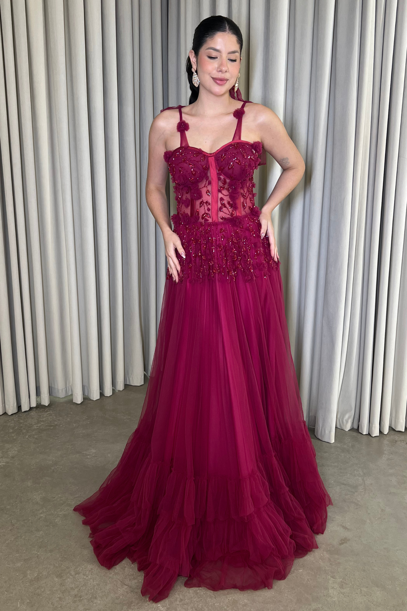 Vestido Longo Fúcsia Tule com Bordado Floral no Corpete