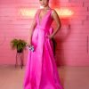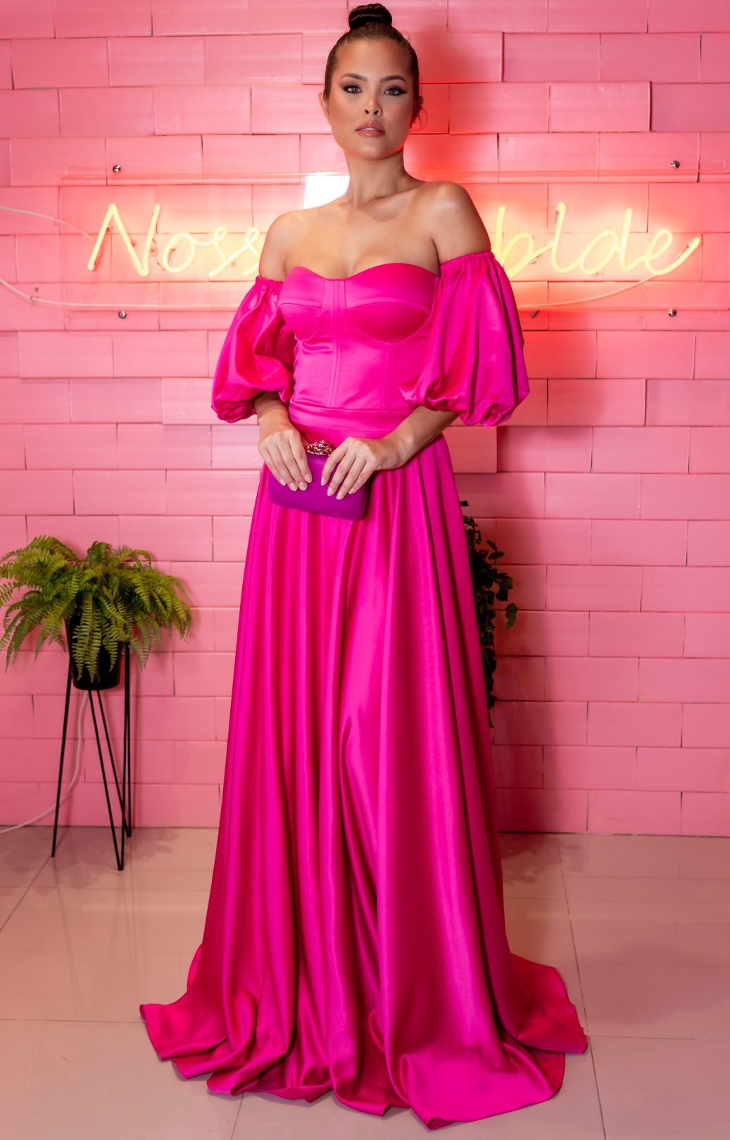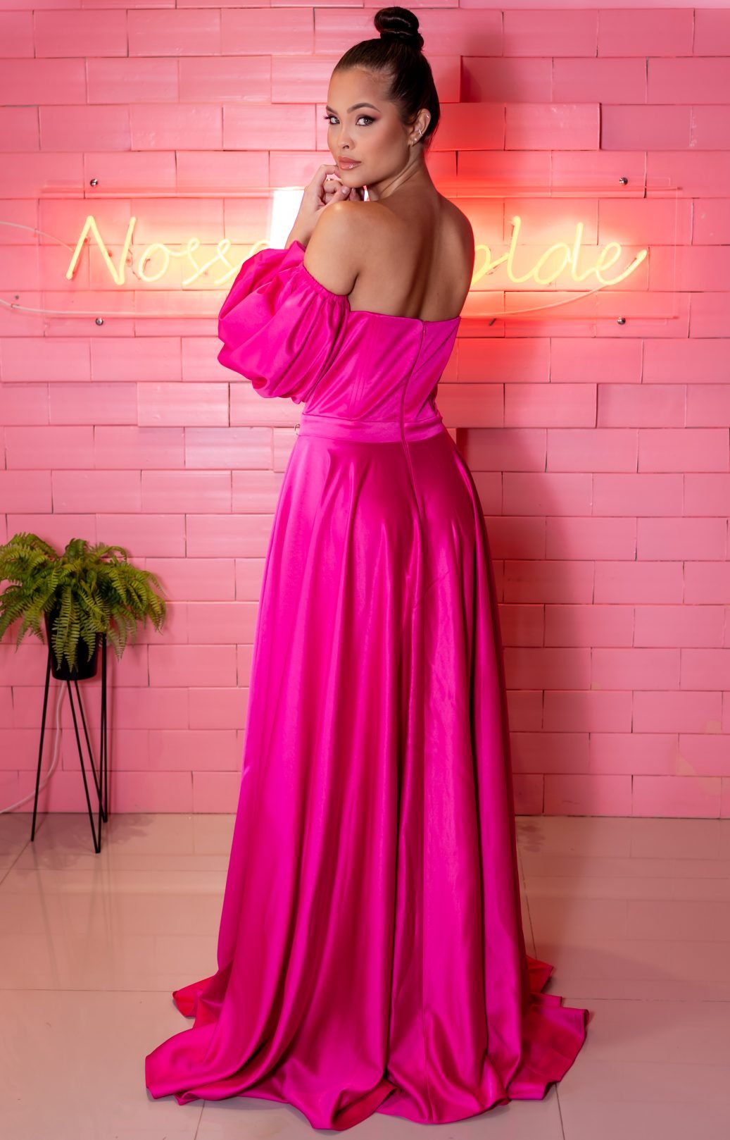 Vestido longo rosa pink, tomara que caia, busto estruturado, manga ciganinha bufante removível e saia rodada.