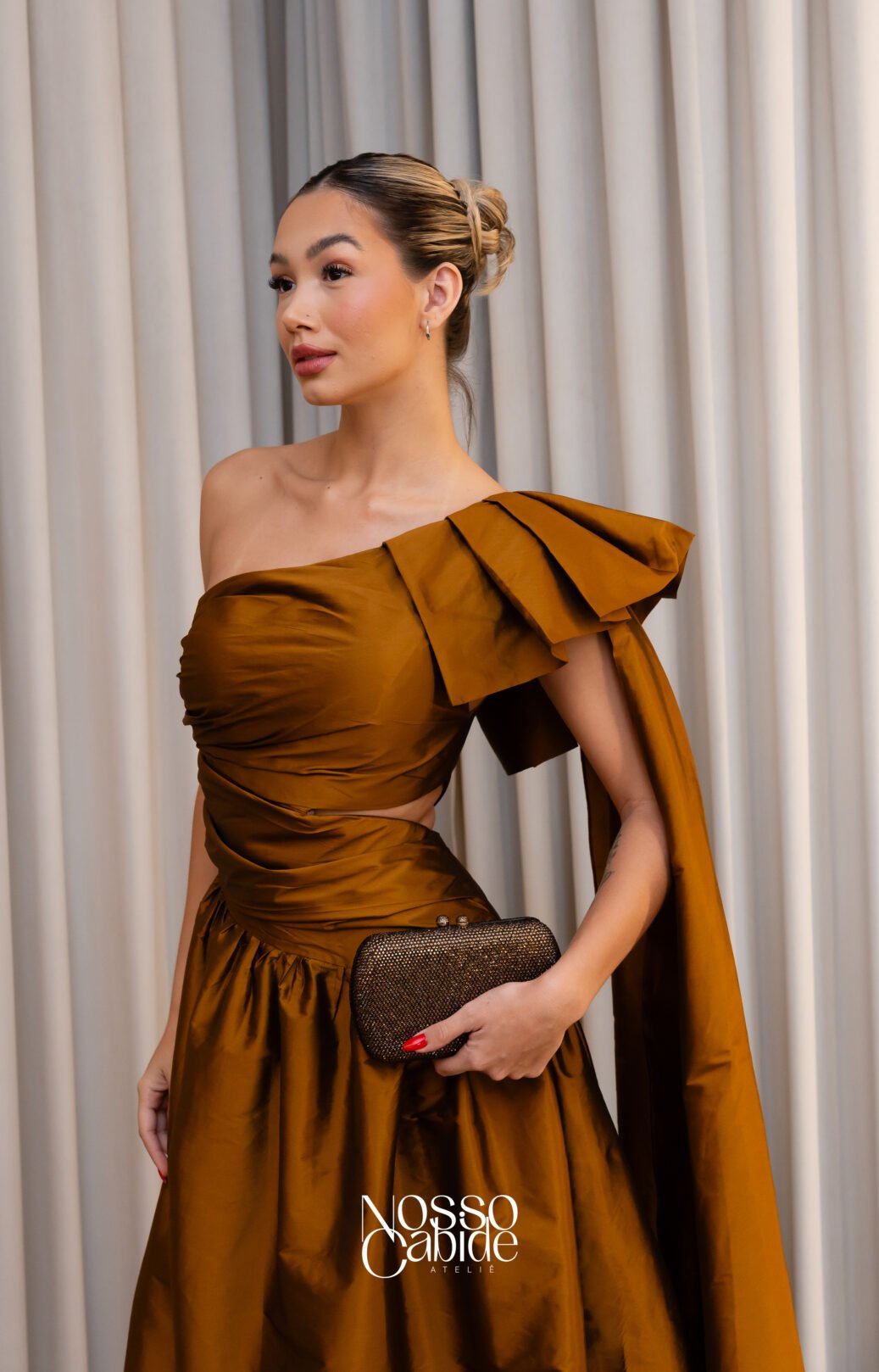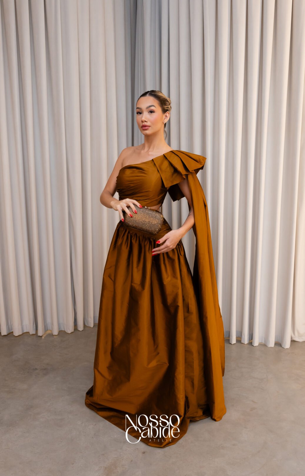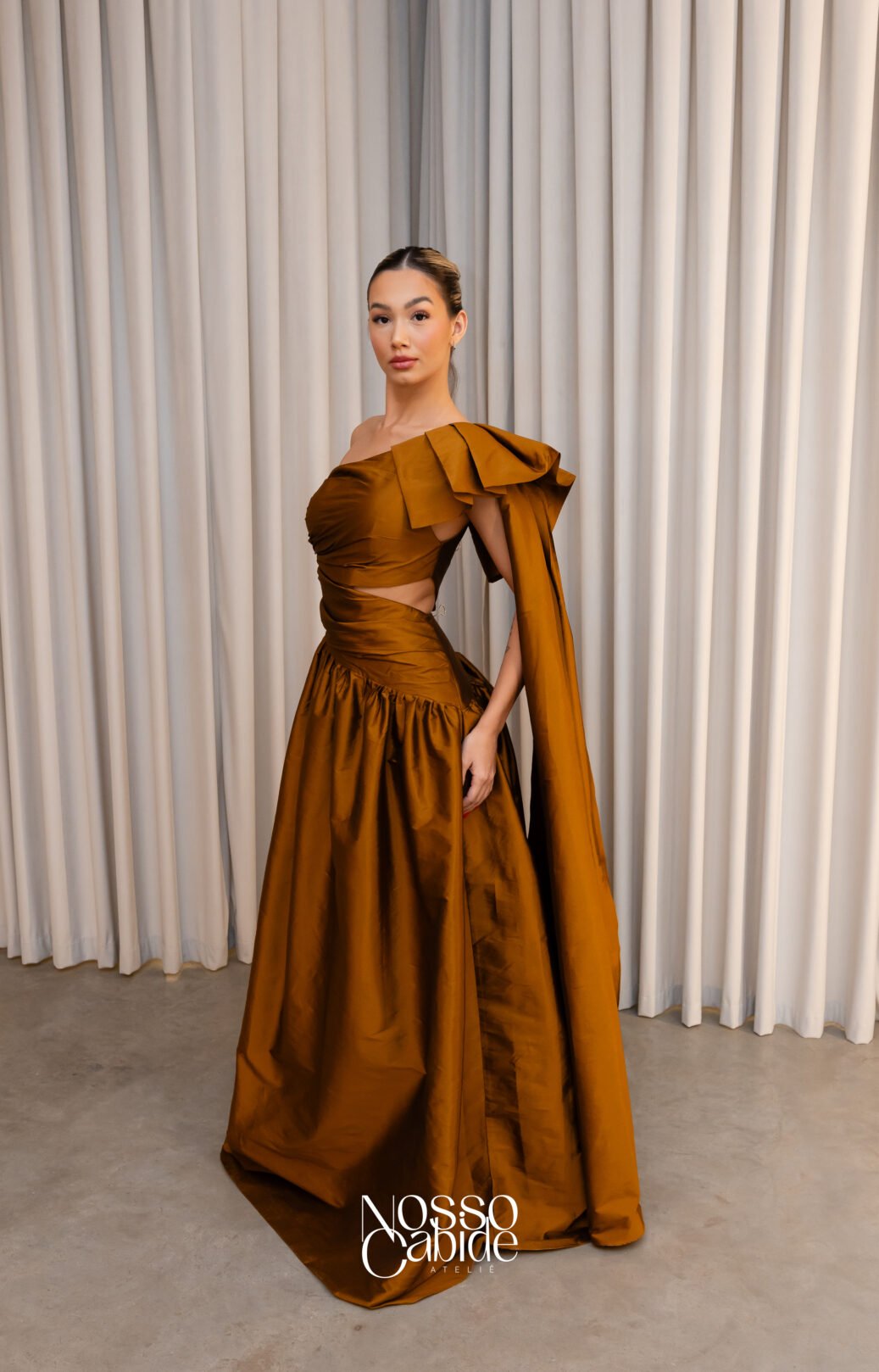 O corte impecável deste vestido realça a silhueta feminina, proporcionando um ajuste perfeito em todas as áreas do corpo. Longa e fluída acrescenta movimento e elegância a cada passo, enquanto valoriza os traços femininos.