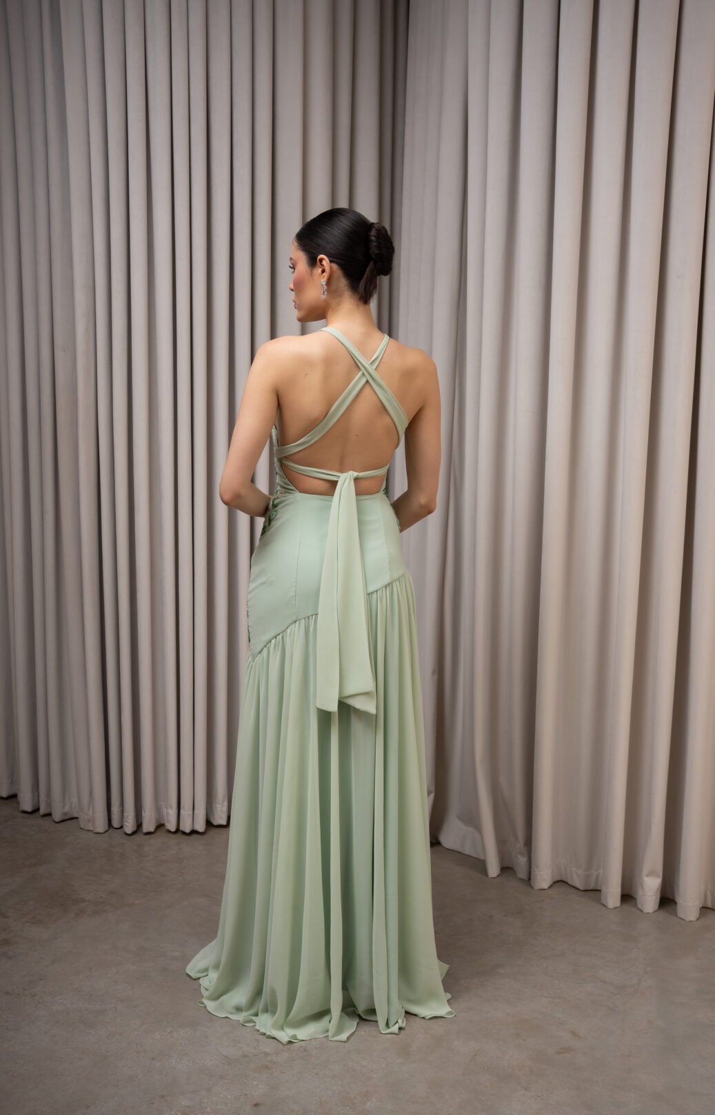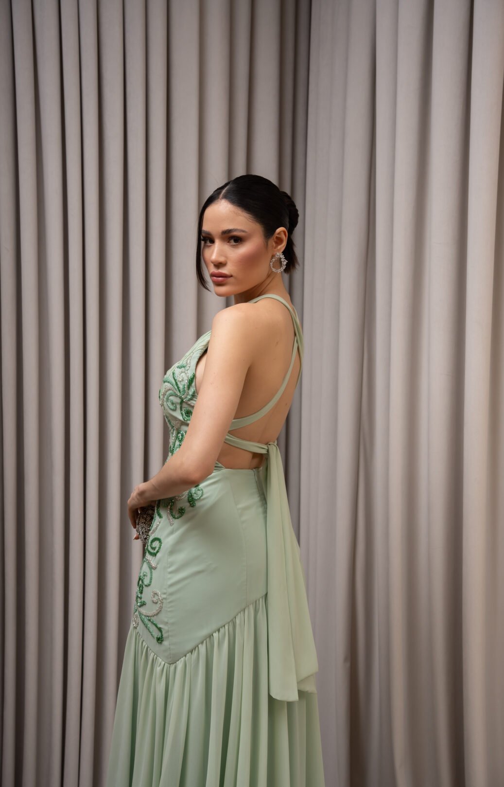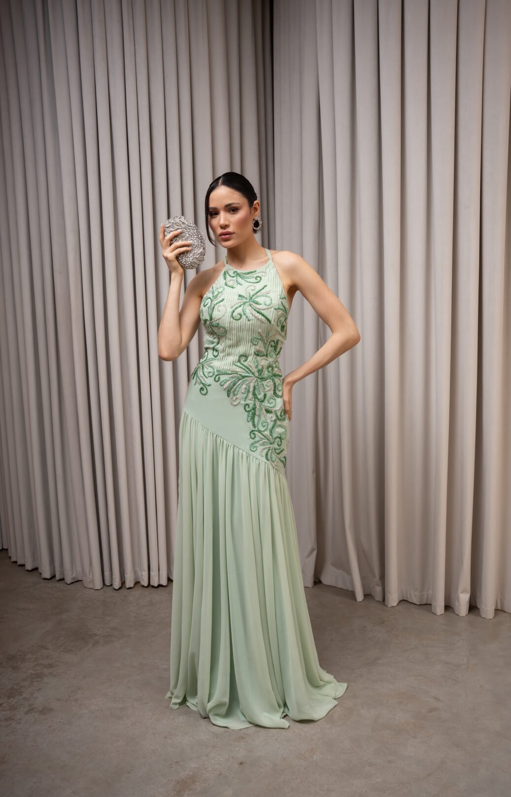 O corte impecável deste vestido realça a silhueta feminina, proporcionando um ajuste perfeito em todas as áreas do corpo. Longa e fluída acrescenta movimento e elegância a cada passo, enquanto valoriza os traços femininos.