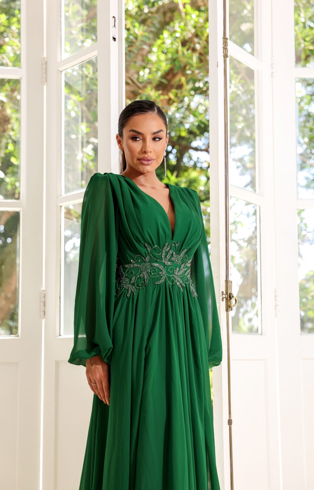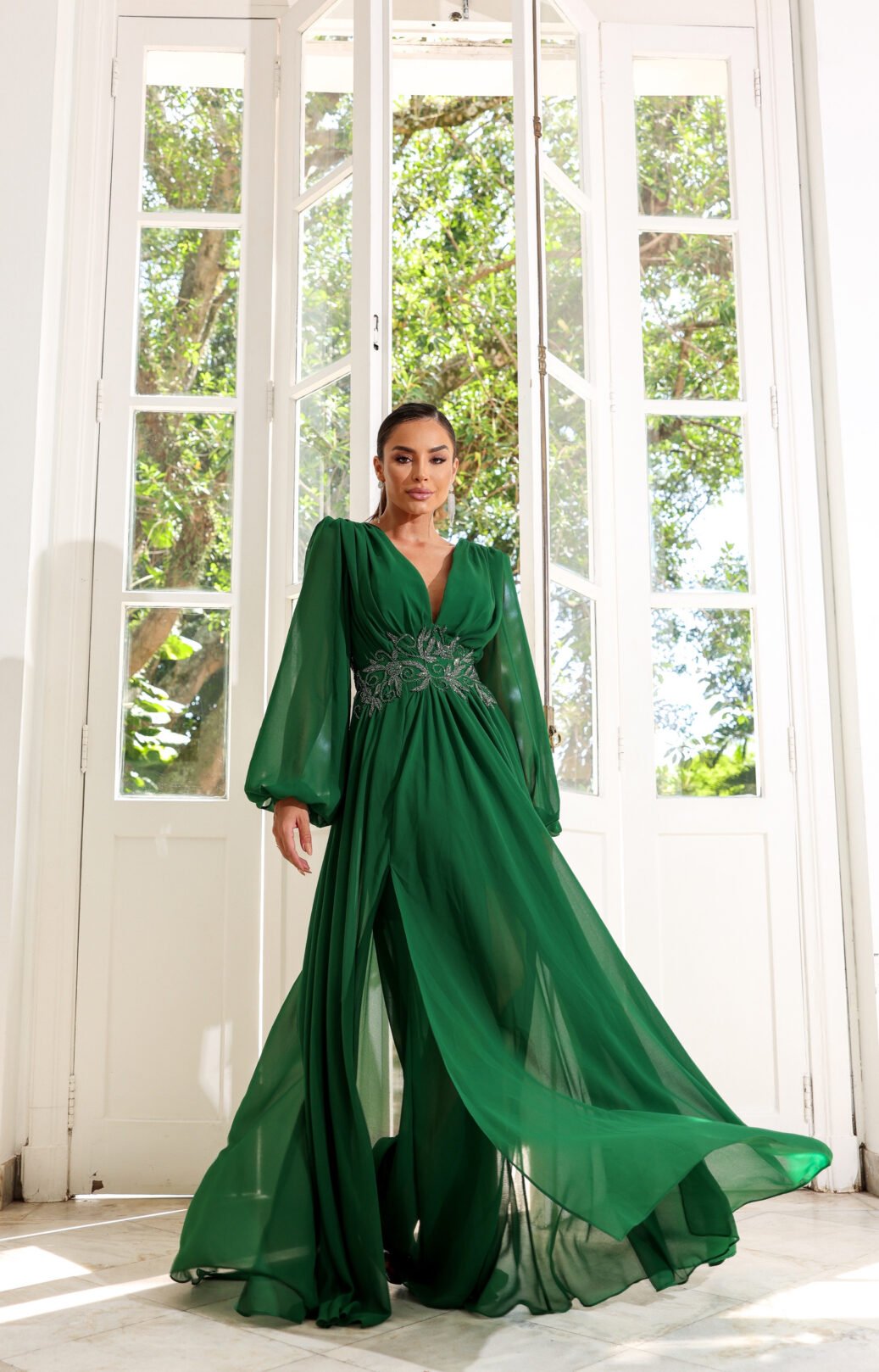 O corte impecável deste vestido realça a silhueta feminina, proporcionando um ajuste perfeito em todas as áreas do corpo. Longa e fluída acrescenta movimento e elegância a cada passo, enquanto valoriza os traços femininos.