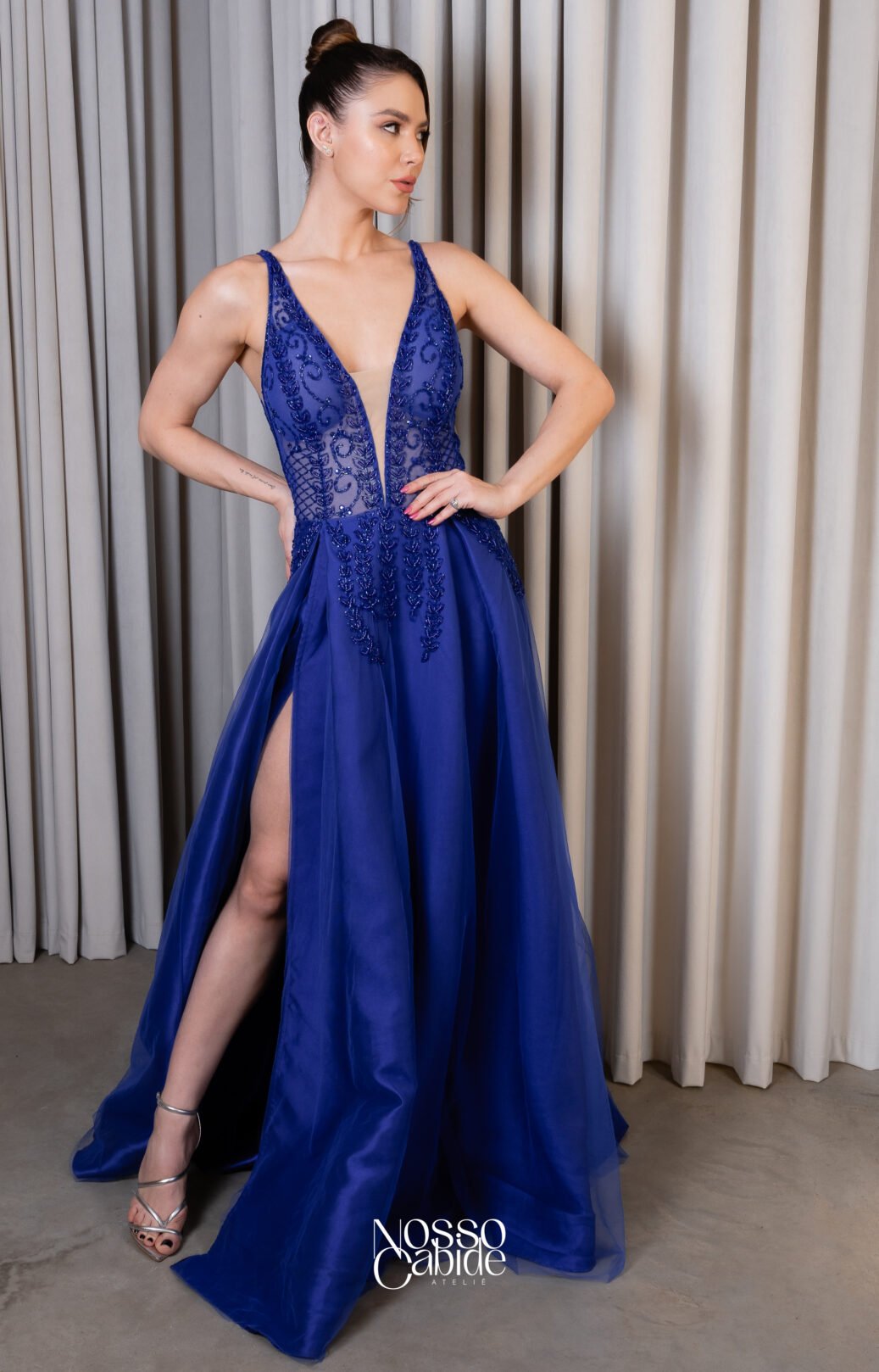 Desperte olhares com elegância e estilo neste vestido azul bic, com fenda ousada e bordado sofisticado. Perfeito para brilhar em qualquer evento com um toque de glamour e personalidade