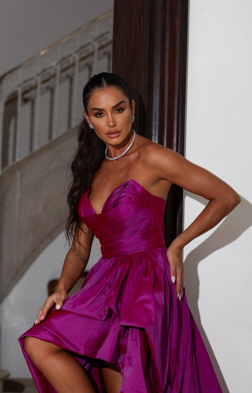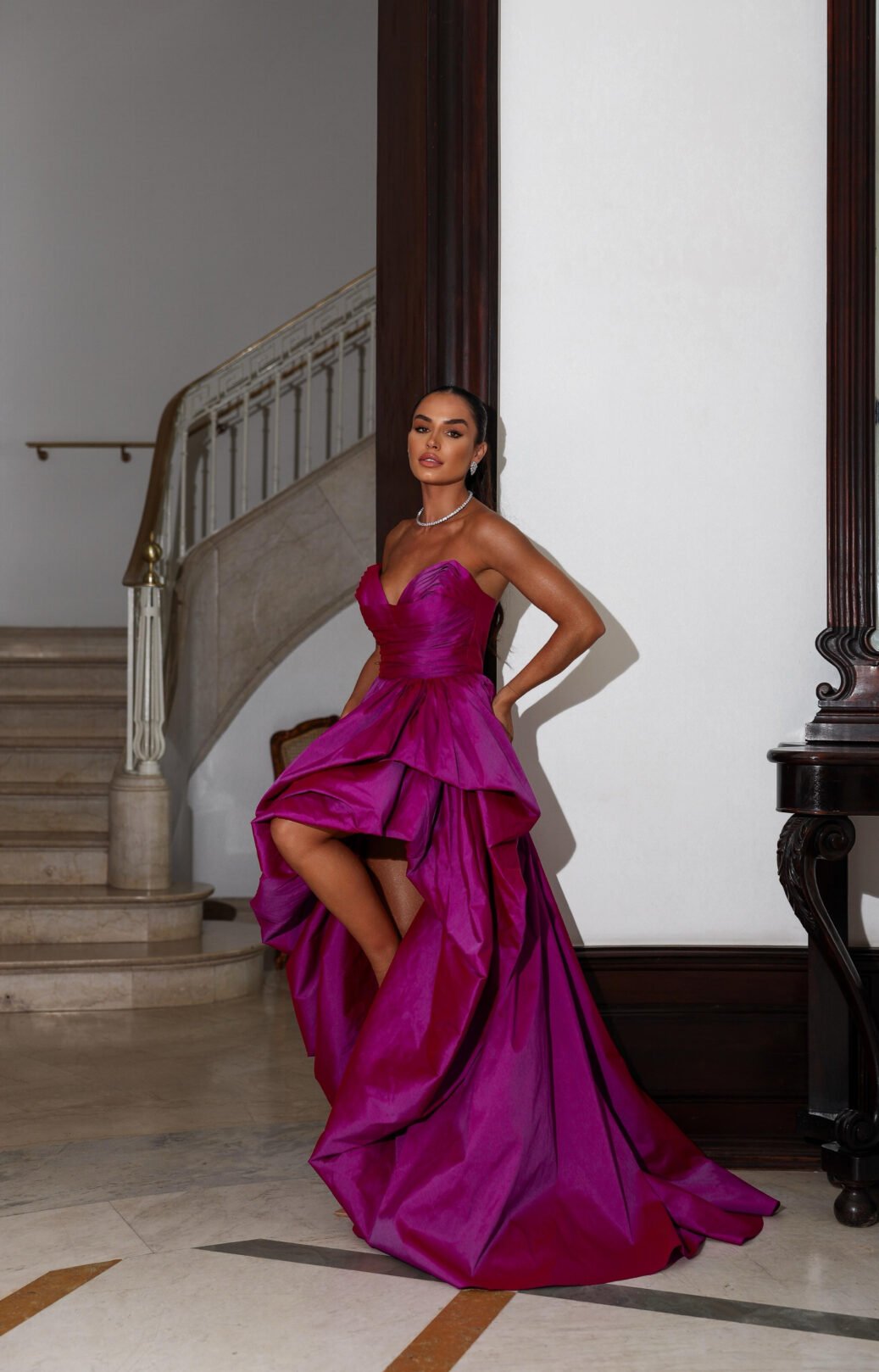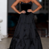 O corte impecável deste vestido realça a silhueta feminina, proporcionando um ajuste perfeito em todas as áreas do corpo. Longa e fluída acrescenta movimento e elegância a cada passo, enquanto valoriza os traços femininos.