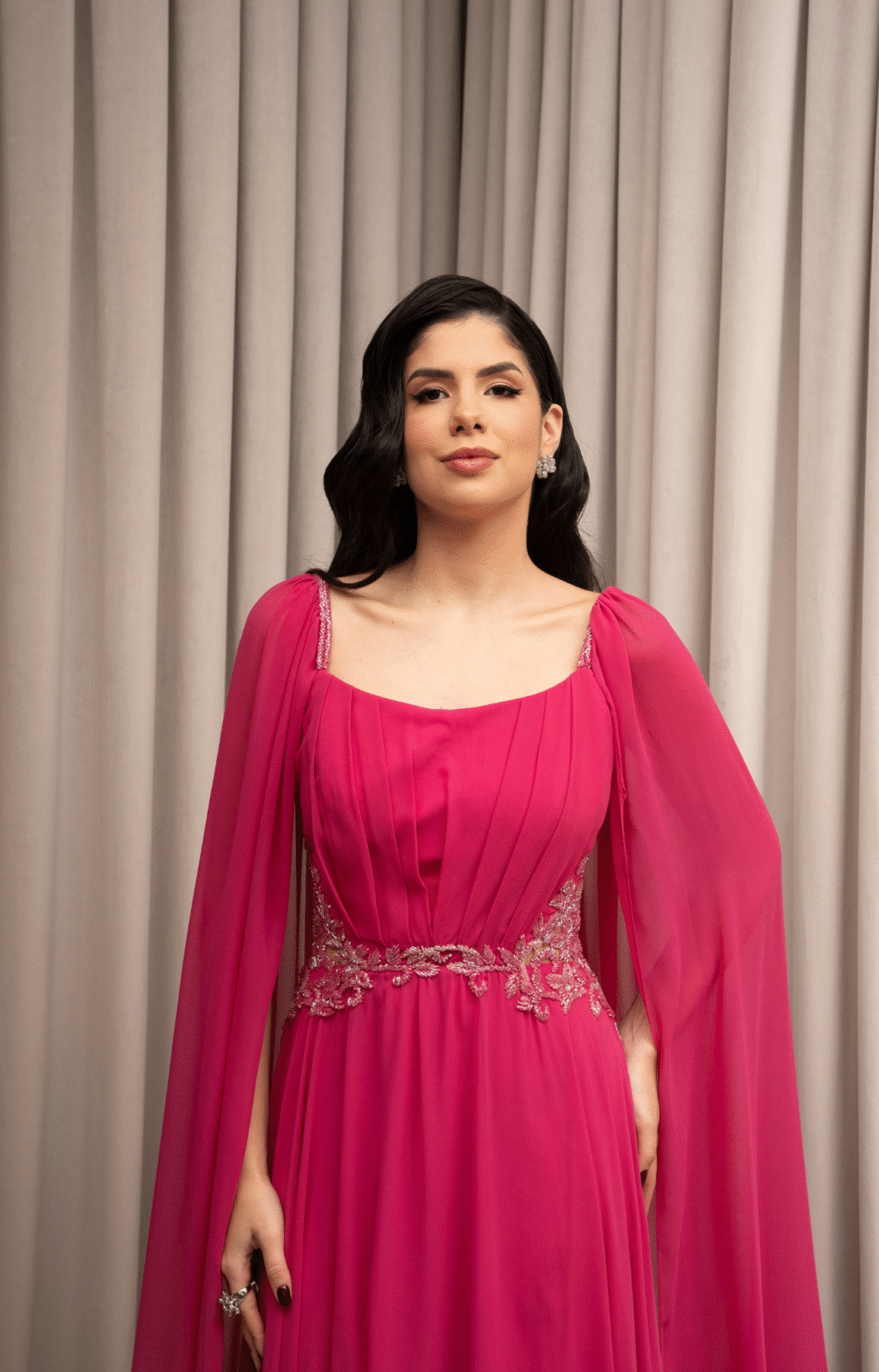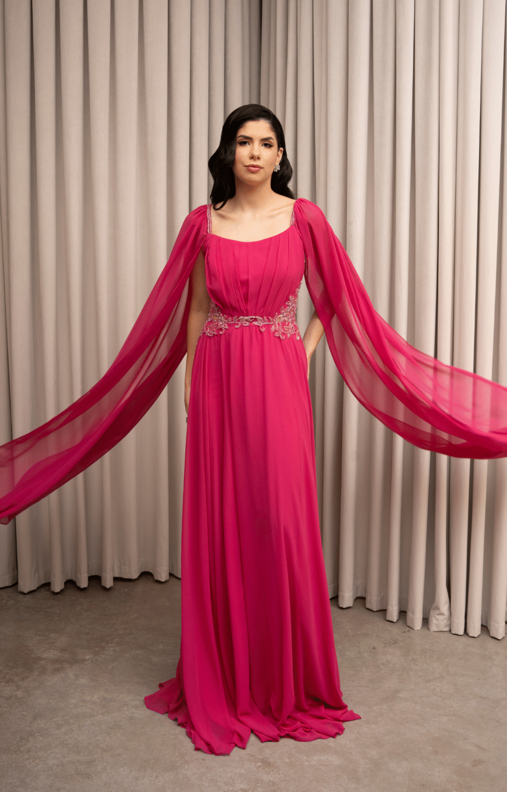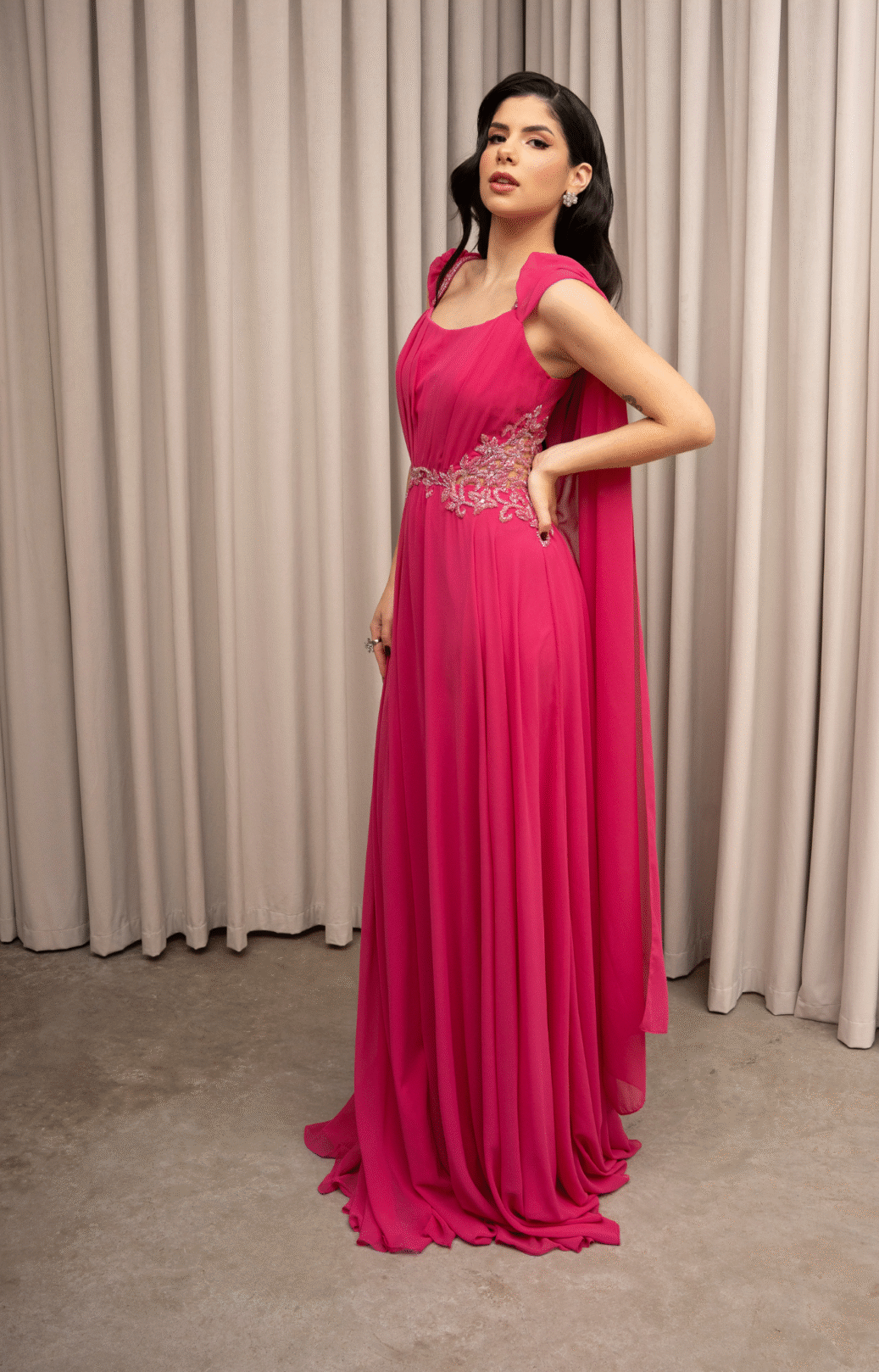 O corte impecável deste vestido realça a silhueta feminina, proporcionando um ajuste perfeito em todas as áreas do corpo. Longa e fluída acrescenta movimento e elegância a cada passo, enquanto valoriza os traços femininos.