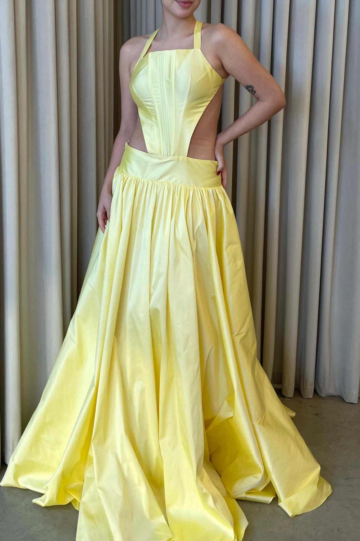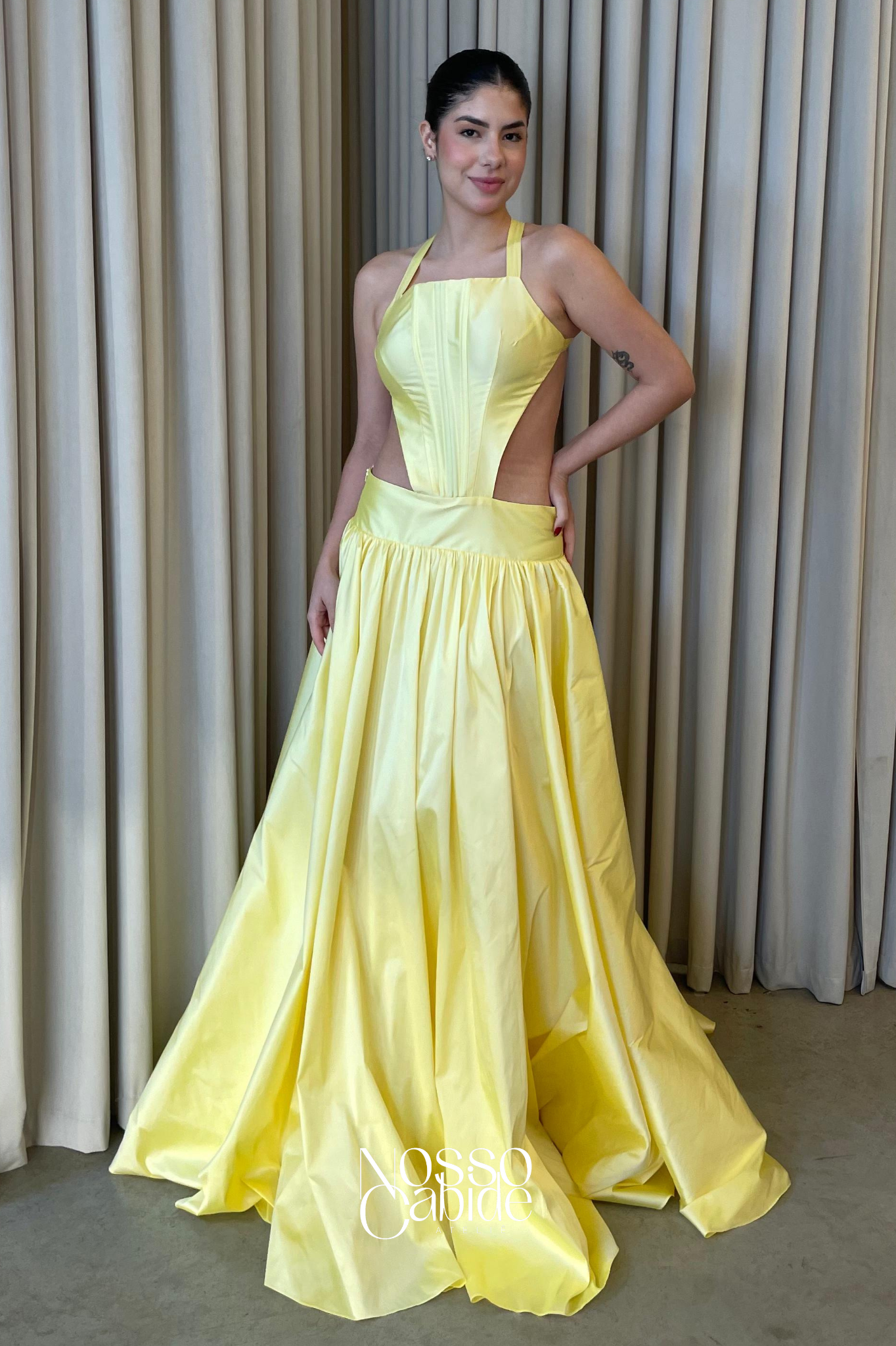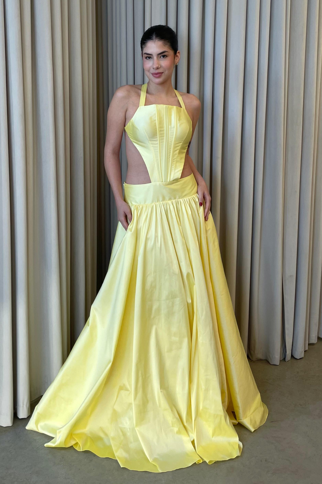 O corte impecável deste vestido realça a silhueta feminina, proporcionando um ajuste perfeito em todas as áreas do corpo. Longa e fluída acrescenta movimento e elegância a cada passo, enquanto valoriza os traços femininos.