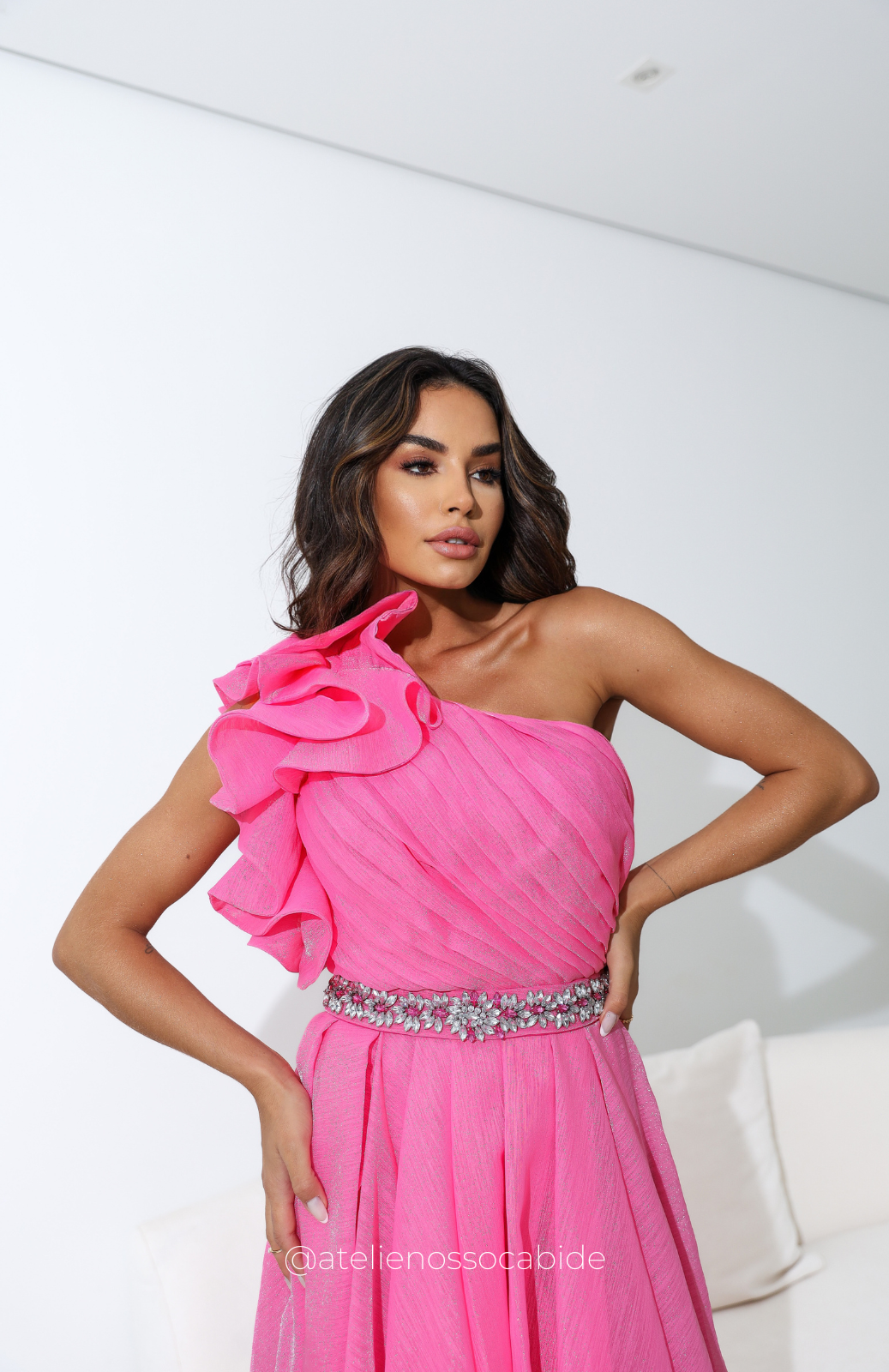 O corte impecável deste vestido realça a silhueta feminina, proporcionando um ajuste perfeito em todas as áreas do corpo. Longa e fluída acrescenta movimento e elegância a cada passo, enquanto valoriza os traços femininos.