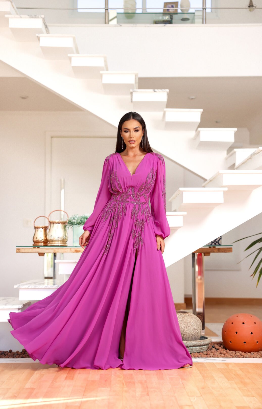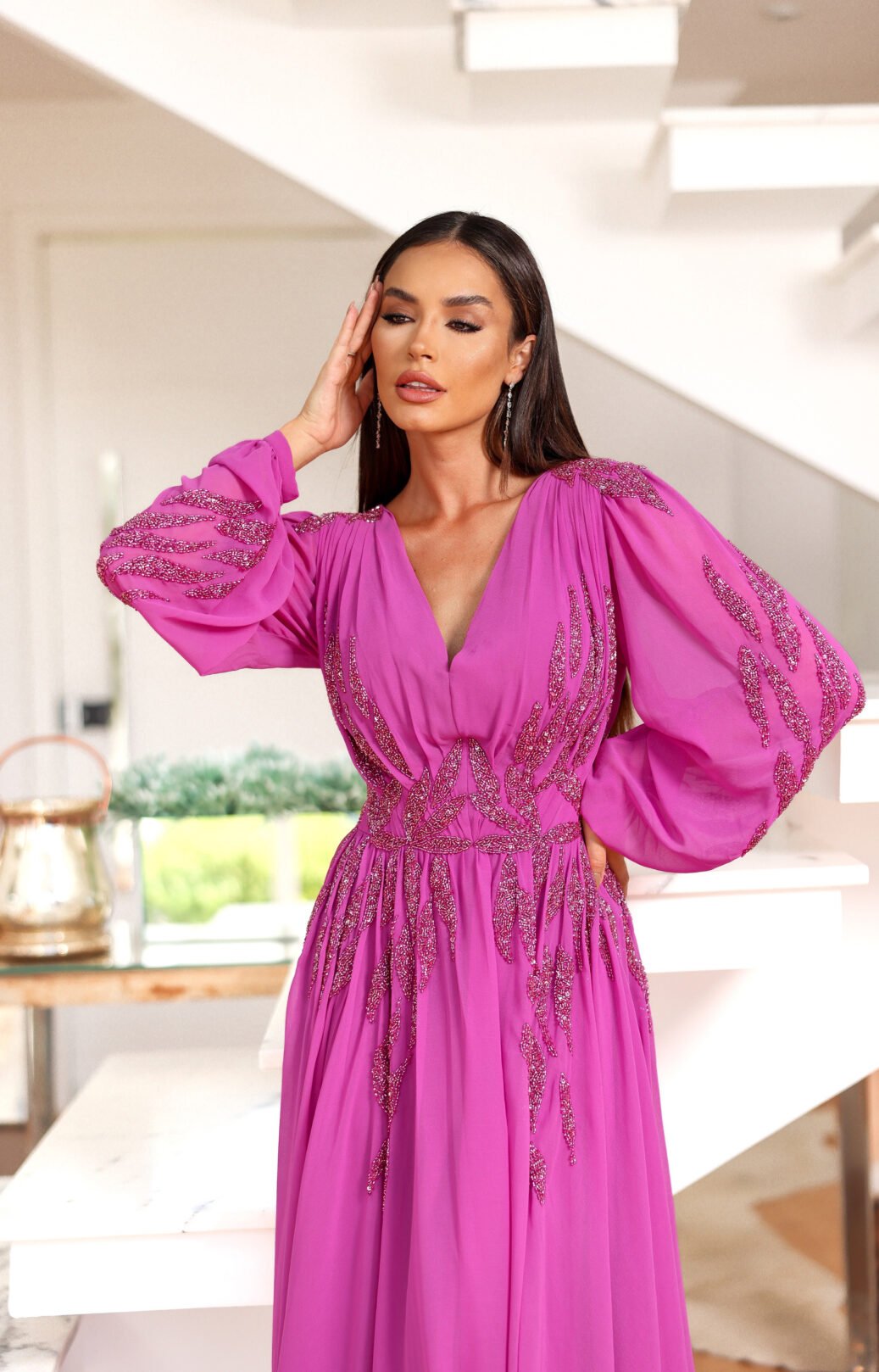 O corte impecável deste vestido realça a silhueta feminina, proporcionando um ajuste perfeito em todas as áreas do corpo. Longa e fluída acrescenta movimento e elegância a cada passo, enquanto valoriza os traços femininos.