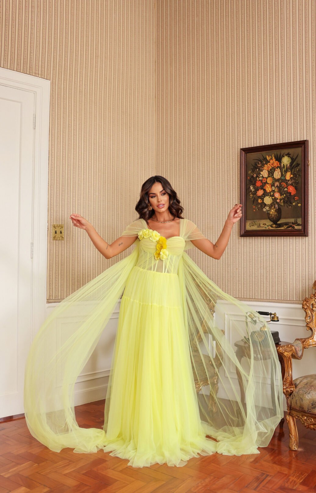 O corte impecável deste vestido realça a silhueta feminina, proporcionando um ajuste perfeito em todas as áreas do corpo. Longa e fluída acrescenta movimento e elegância a cada passo, enquanto valoriza os traços femininos.