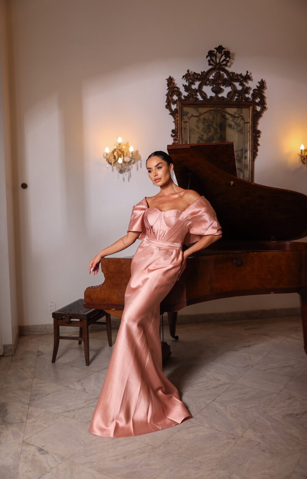 O corte impecável deste vestido realça a silhueta feminina, proporcionando um ajuste perfeito em todas as áreas do corpo. Longa e fluída acrescenta movimento e elegância a cada passo, enquanto valoriza os traços femininos.