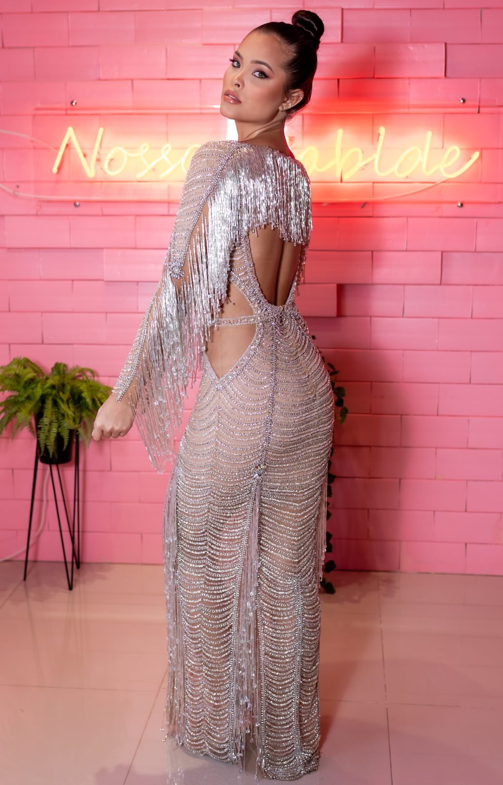 Vestido longo bordado prata e nude, franjas nos braços, pernas e costas, recortes com transparência e decote nas costas.