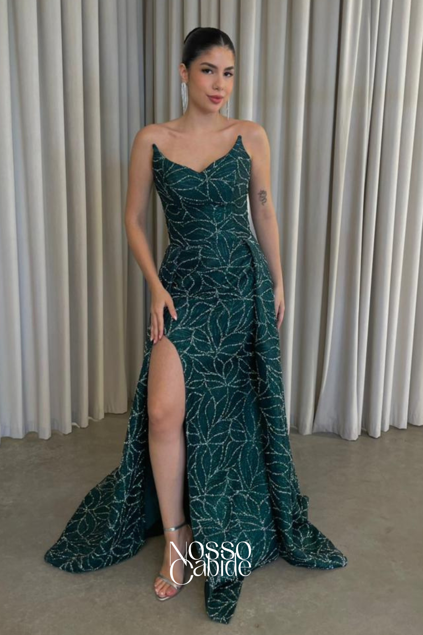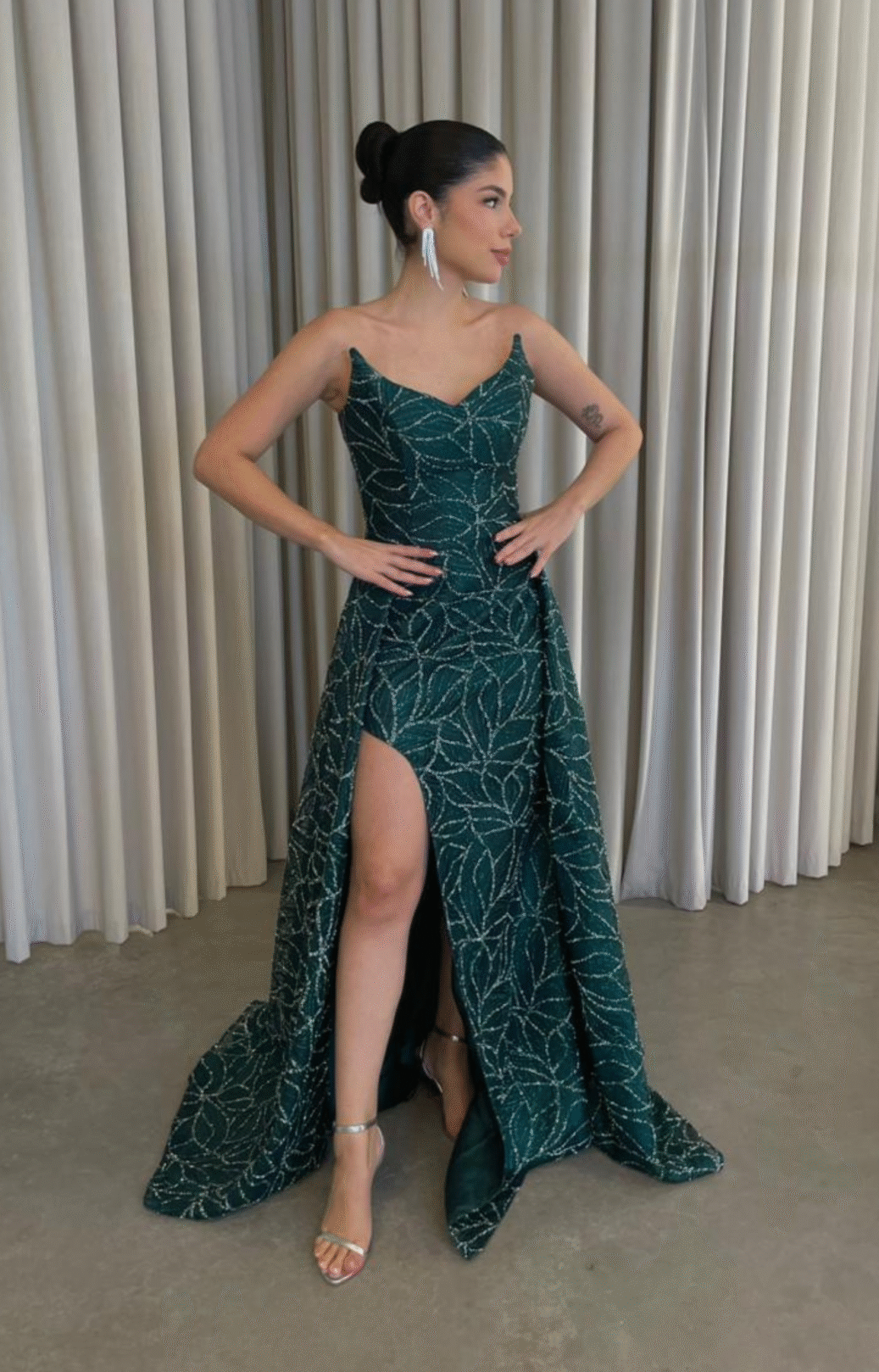 O corte impecável deste vestido realça a silhueta feminina, proporcionando um ajuste perfeito em todas as áreas do corpo. Longa e fluída acrescenta movimento e elegância a cada passo, enquanto valoriza os traços femininos.