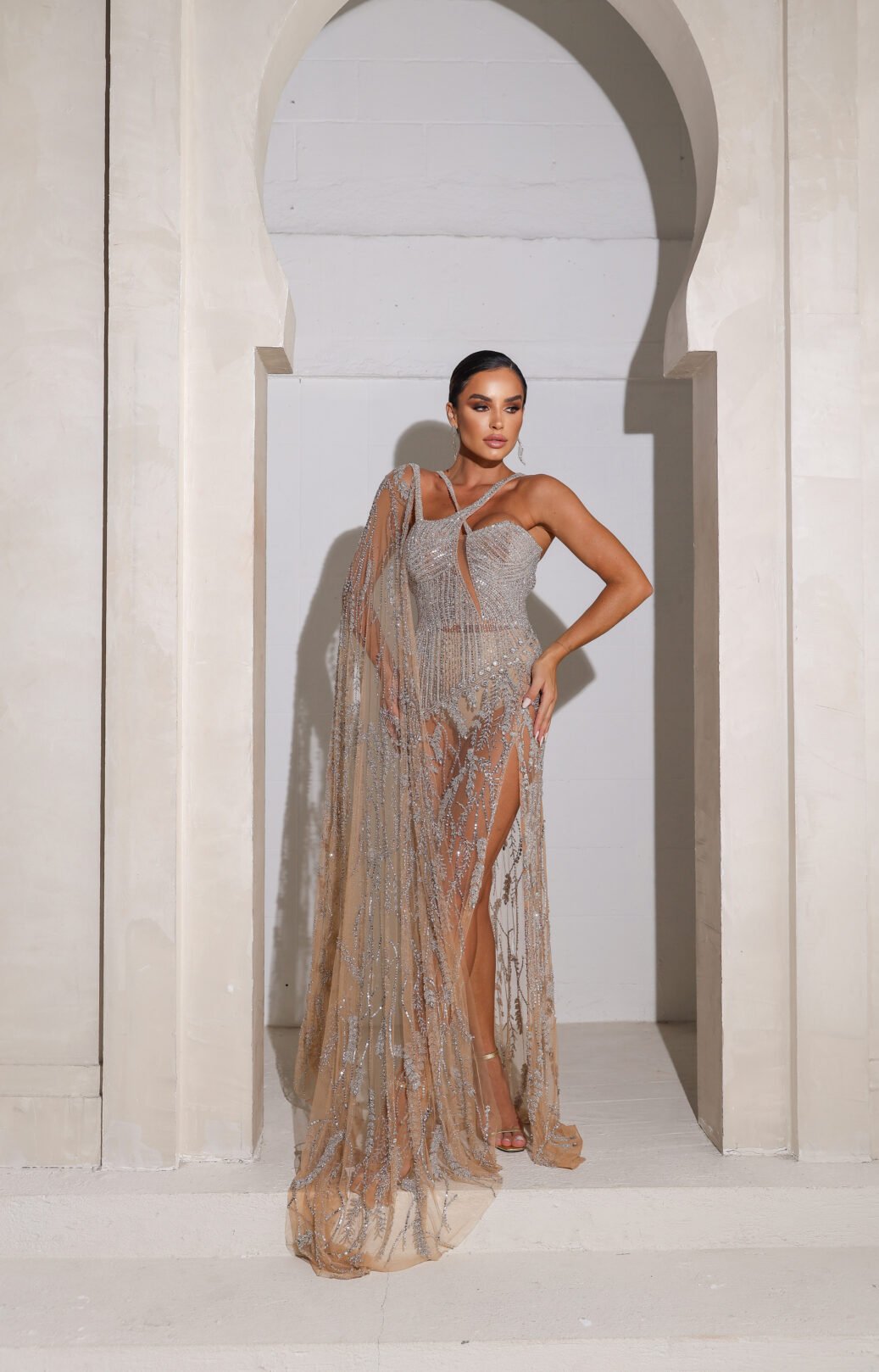 O corte impecável deste vestido realça a silhueta feminina, proporcionando um ajuste perfeito em todas as áreas do corpo. Longa e fluída acrescenta movimento e elegância a cada passo, enquanto valoriza os traços femininos.