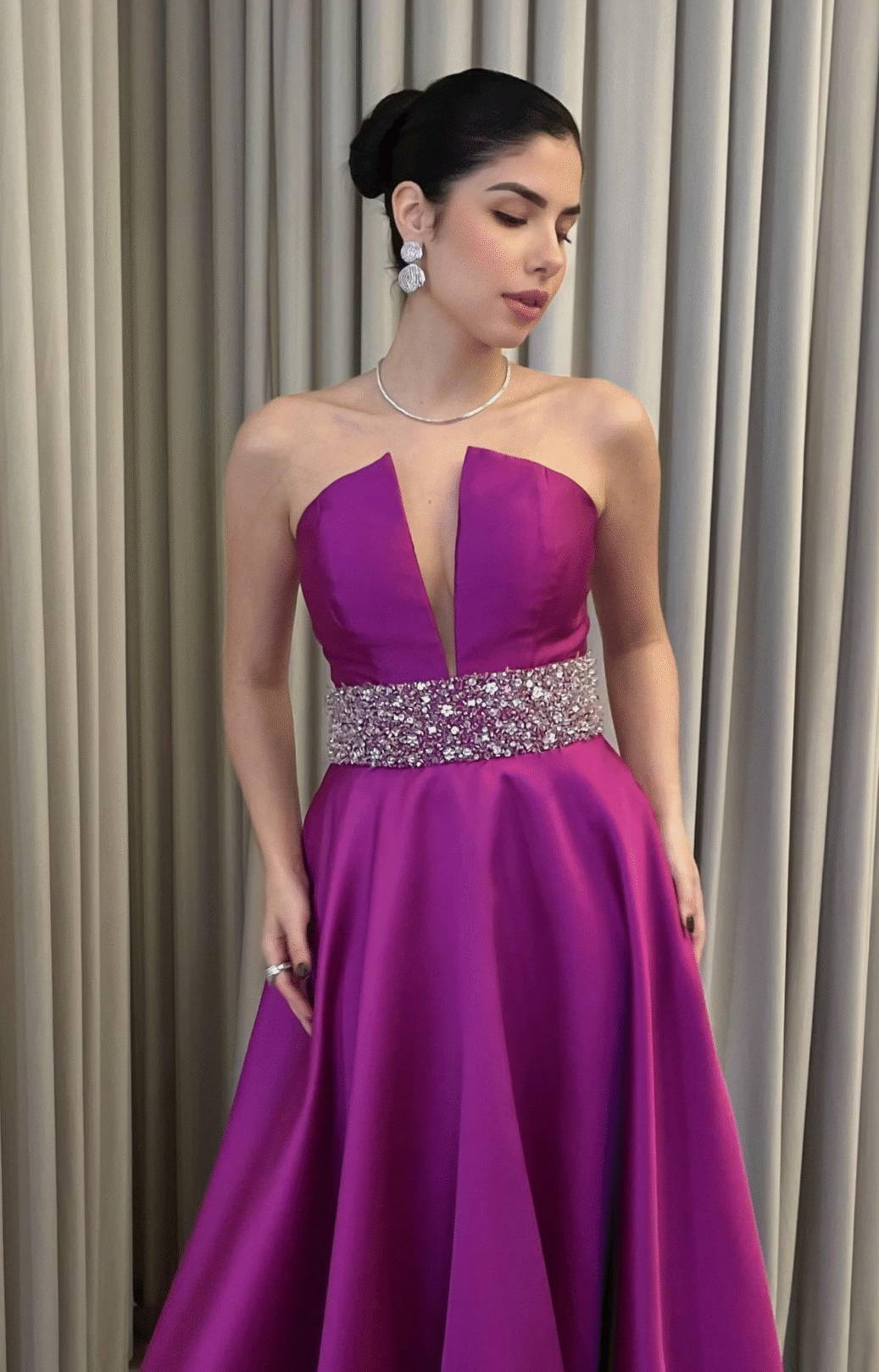 O corte impecável deste vestido realça a silhueta feminina, proporcionando um ajuste perfeito em todas as áreas do corpo. Longa e fluída acrescenta movimento e elegância a cada passo, enquanto valoriza os traços femininos.