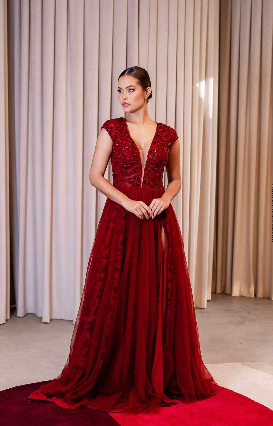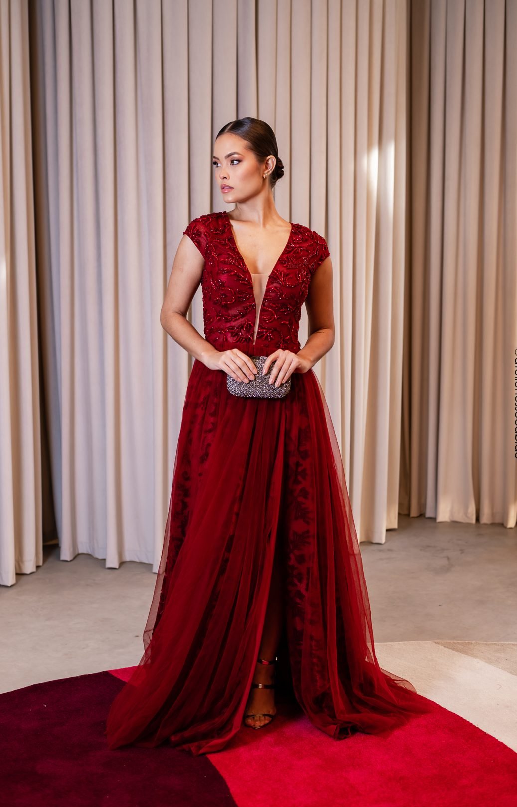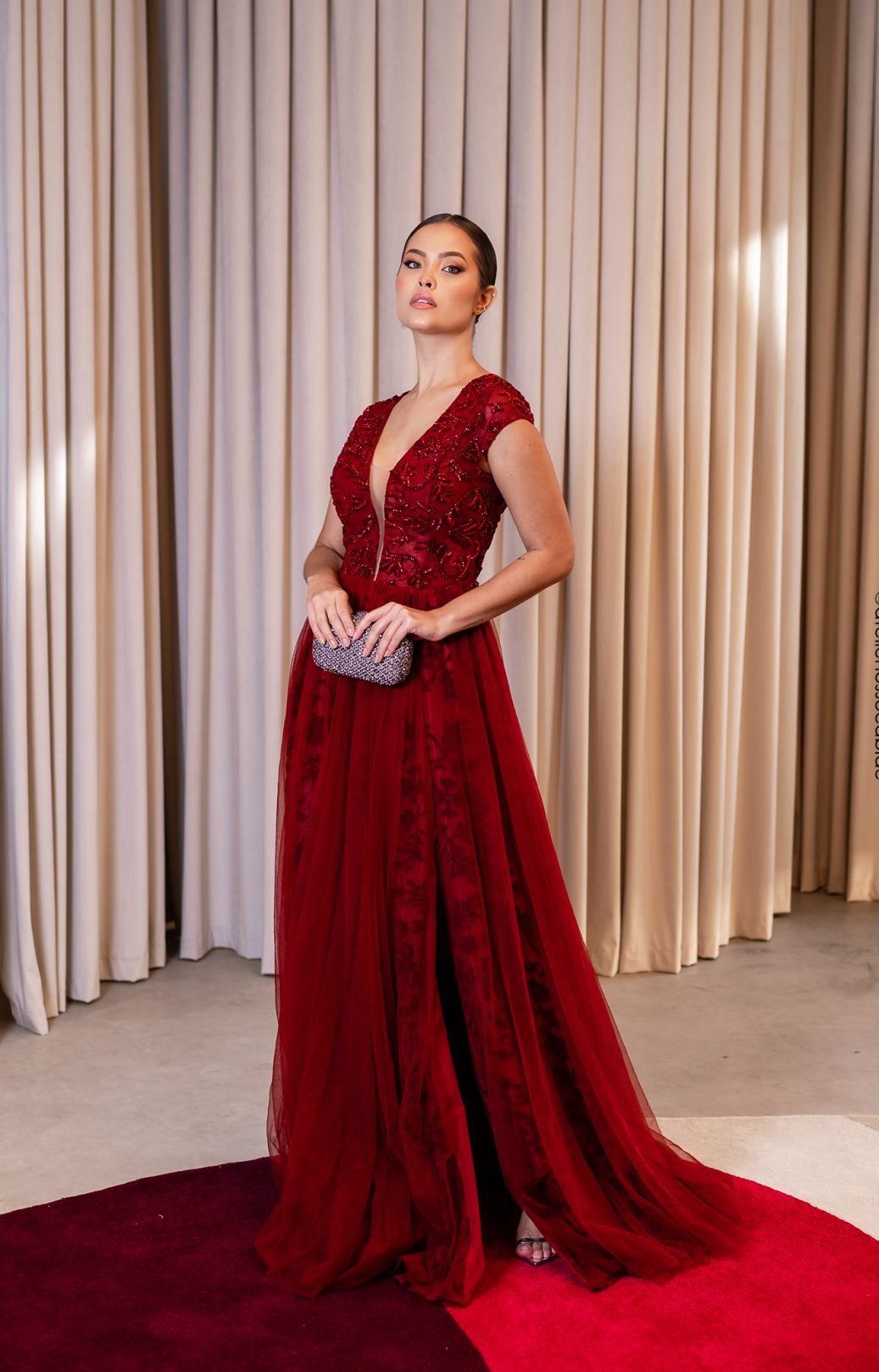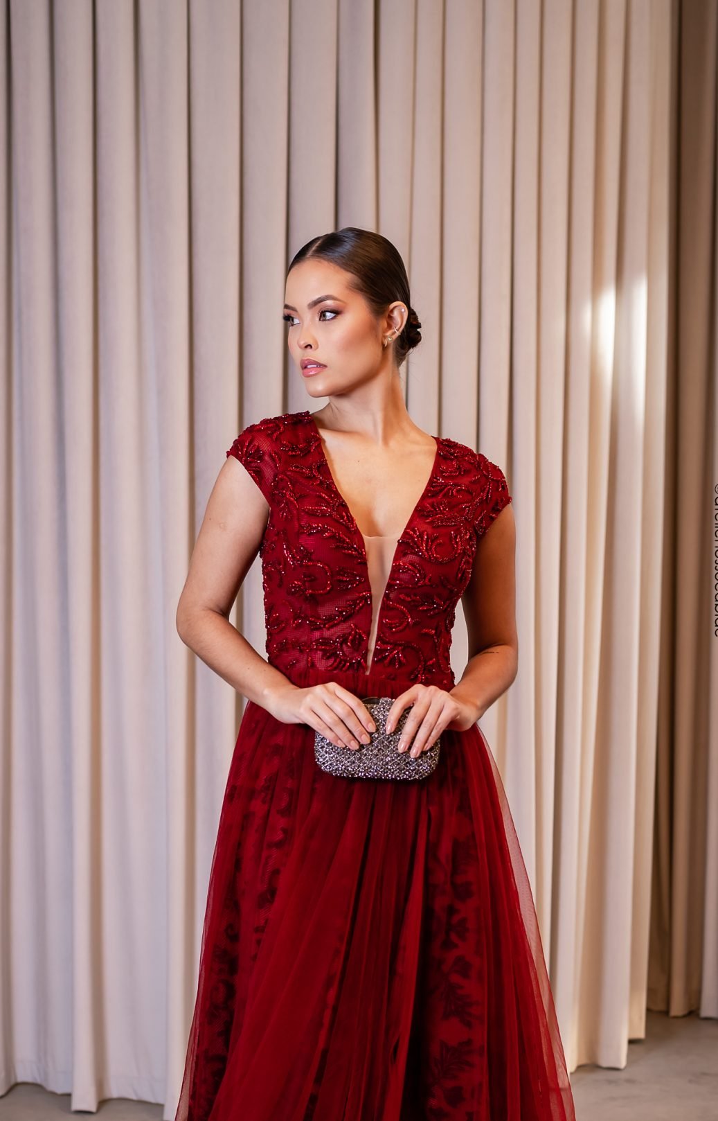 Vestido Longo Vermelho Bordado Saia de Tule e Veludo