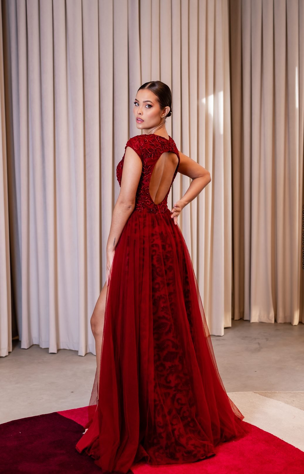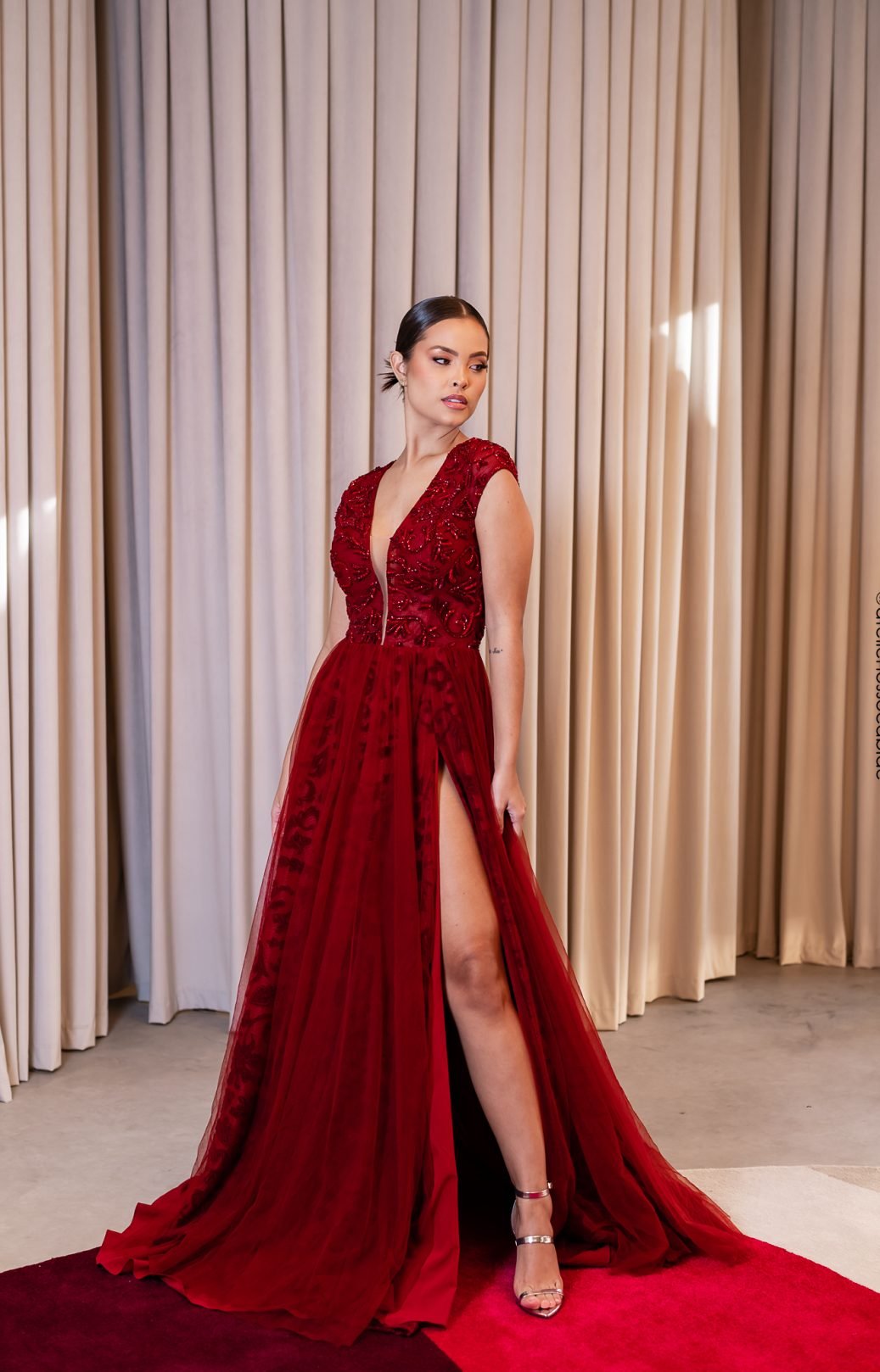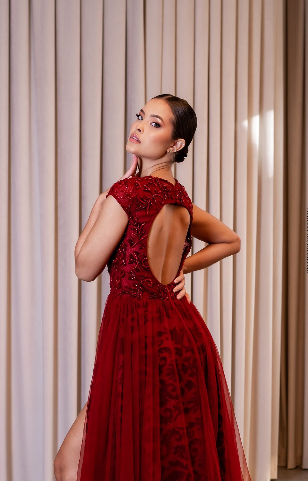 Vestido Longo Vermelho Bordado Saia de Tule e Veludo
