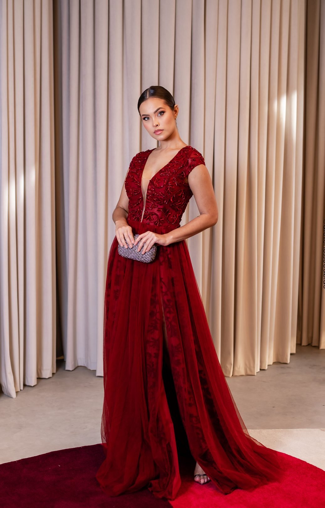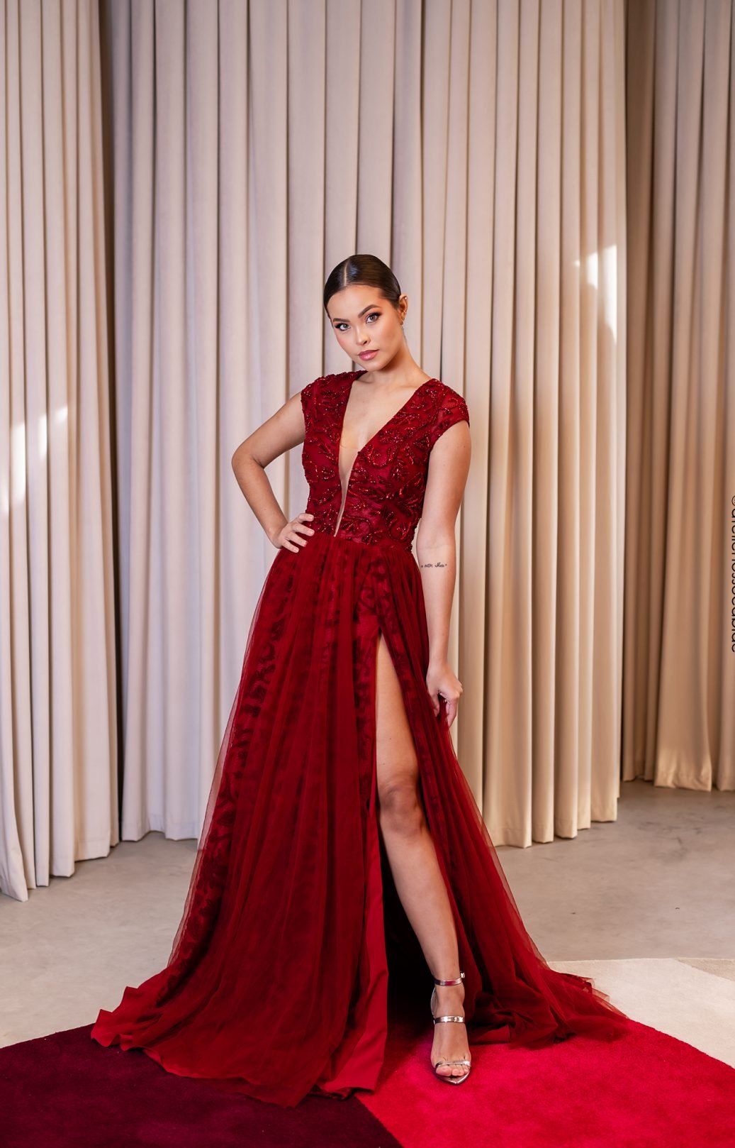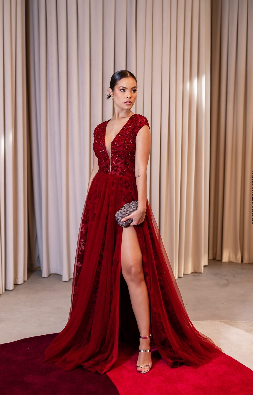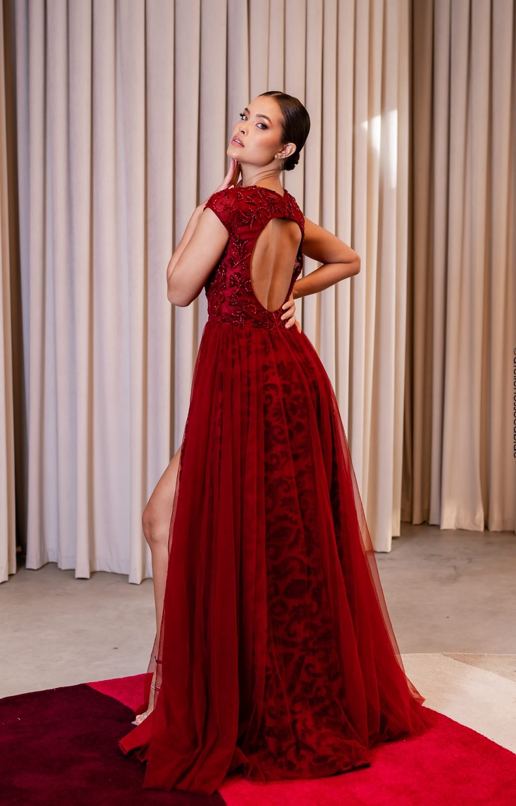 Vestido Longo Vermelho Bordado Saia de Tule e Veludo