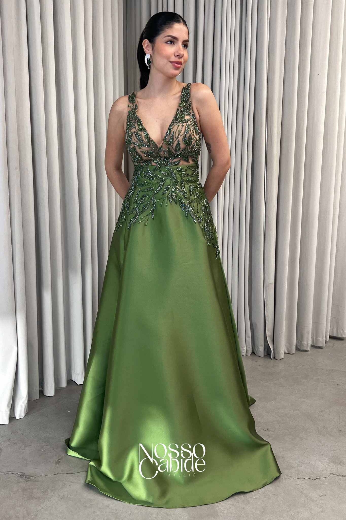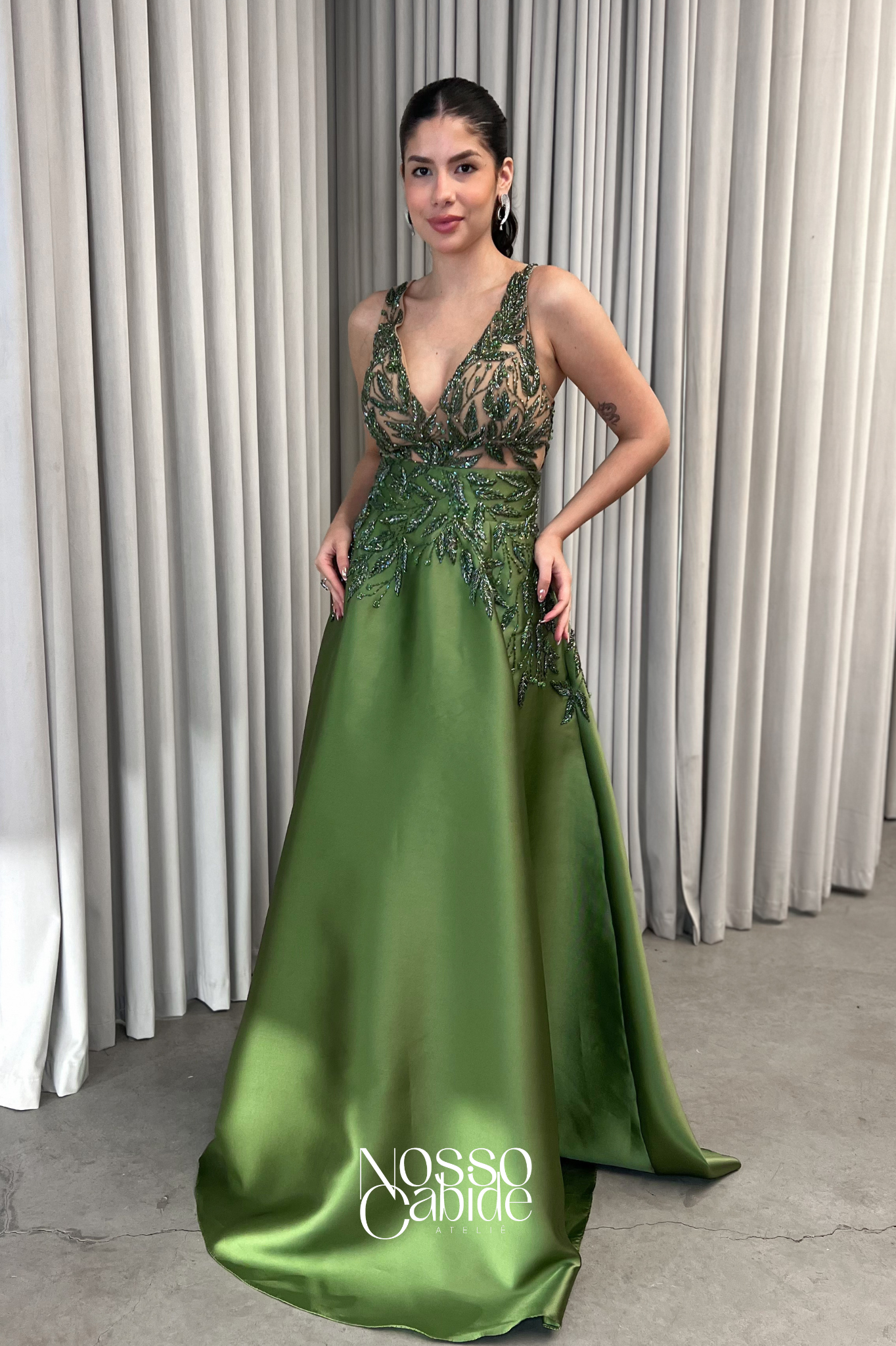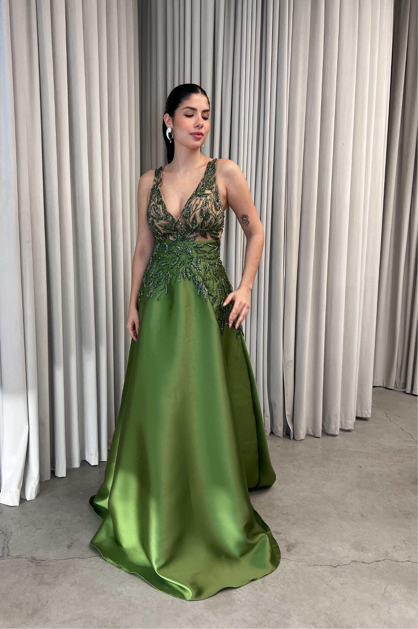 O corte impecável deste vestido realça a silhueta feminina, proporcionando um ajuste perfeito em todas as áreas do corpo. Longa e fluída acrescenta movimento e elegância a cada passo, enquanto valoriza os traços femininos.