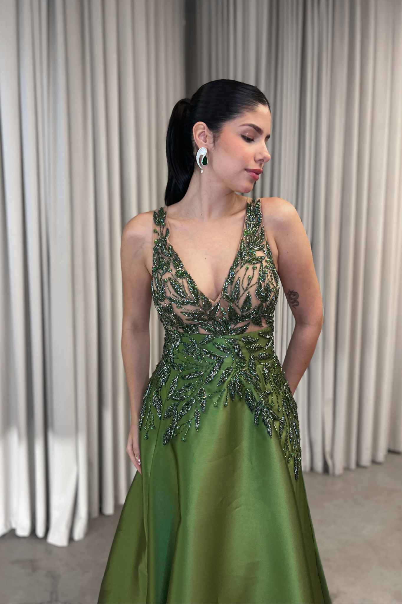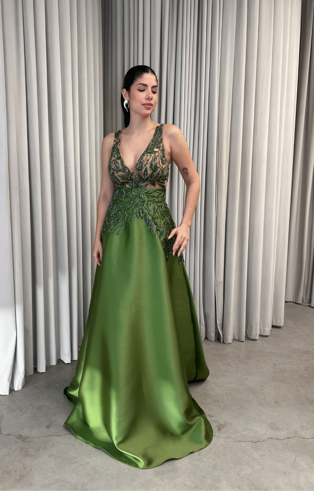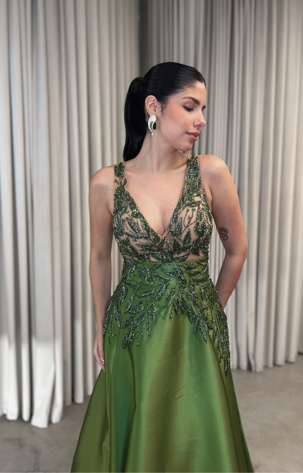 O corte impecável deste vestido realça a silhueta feminina, proporcionando um ajuste perfeito em todas as áreas do corpo. Longa e fluída acrescenta movimento e elegância a cada passo, enquanto valoriza os traços femininos.