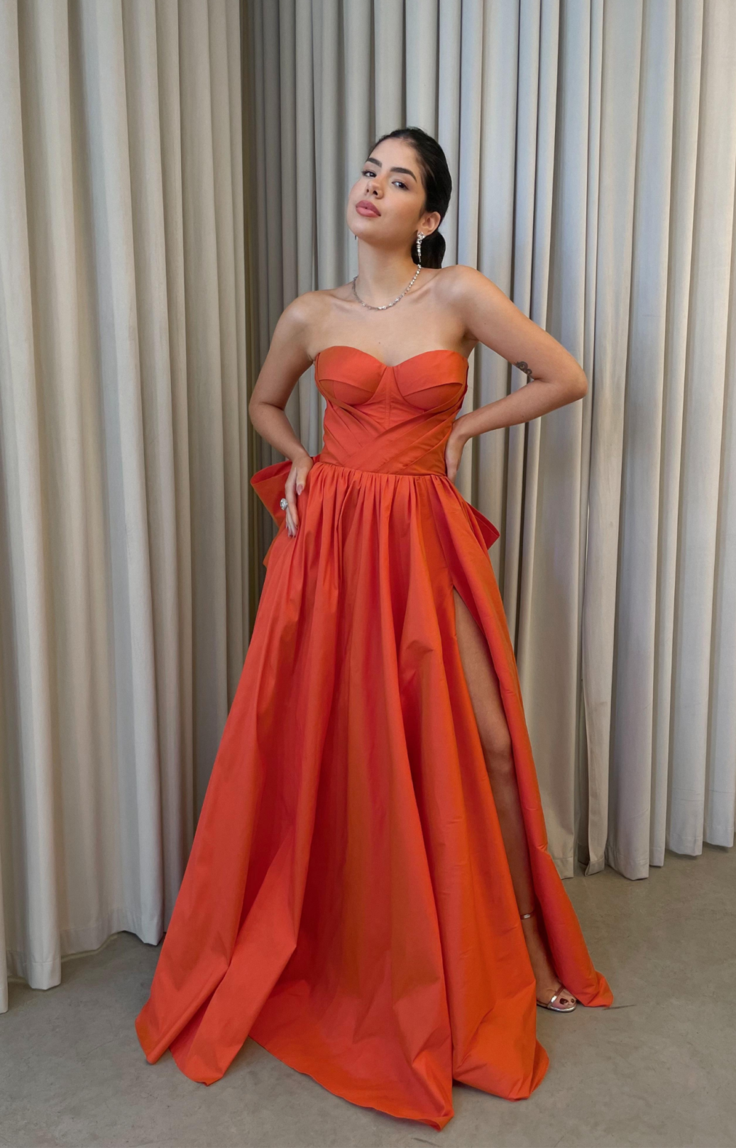 O corte impecável deste vestido realça a silhueta feminina, proporcionando um ajuste perfeito em todas as áreas do corpo. Longa e fluída acrescenta movimento e elegância a cada passo, enquanto valoriza os traços femininos.