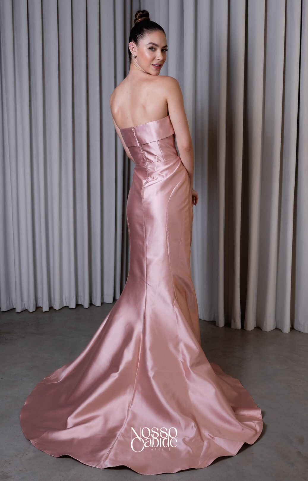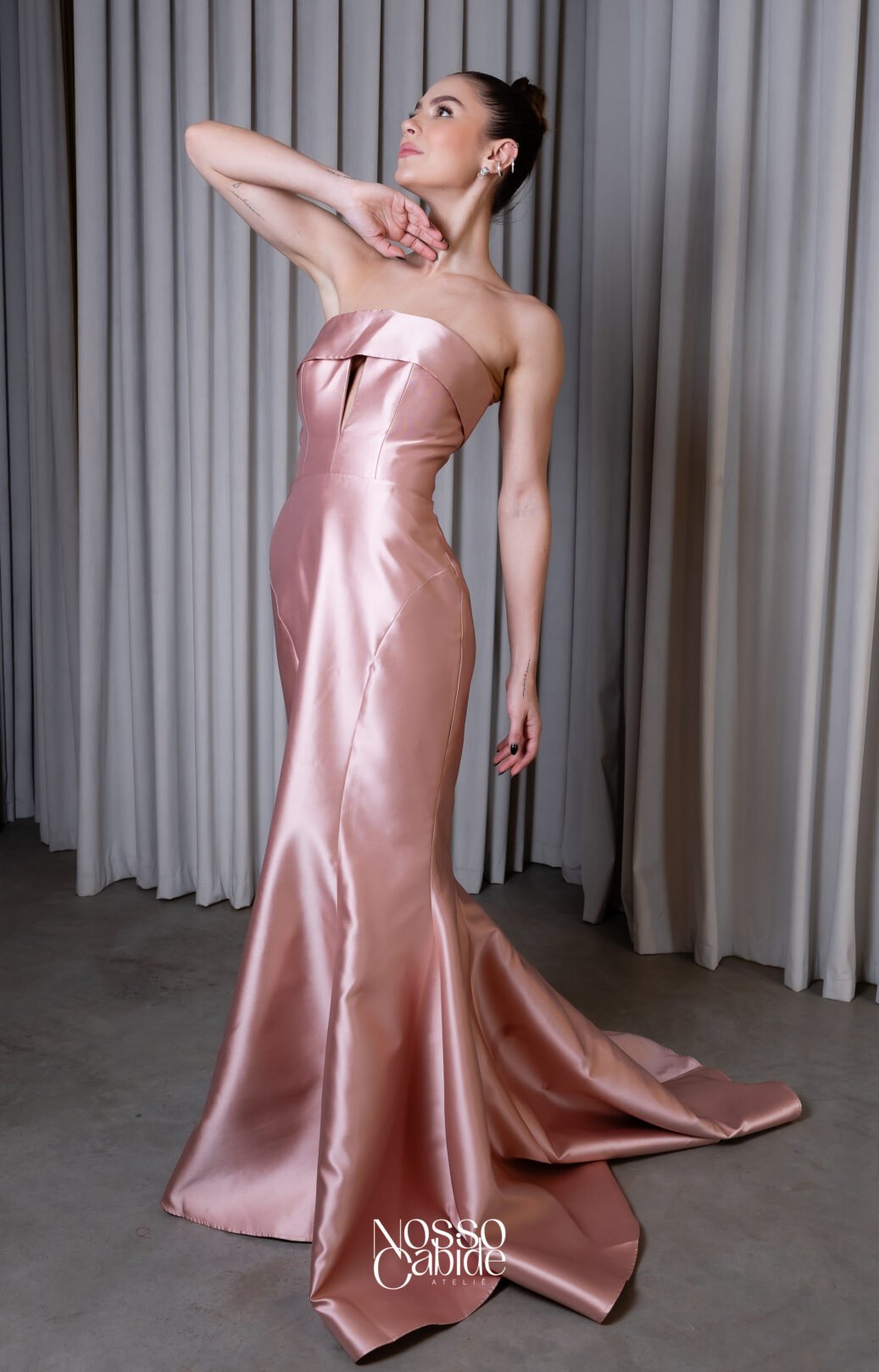 O corte impecável deste vestido realça a silhueta feminina, proporcionando um ajuste perfeito em todas as áreas do corpo. Longa e fluída acrescenta movimento e elegância a cada passo, enquanto valoriza os traços femininos.