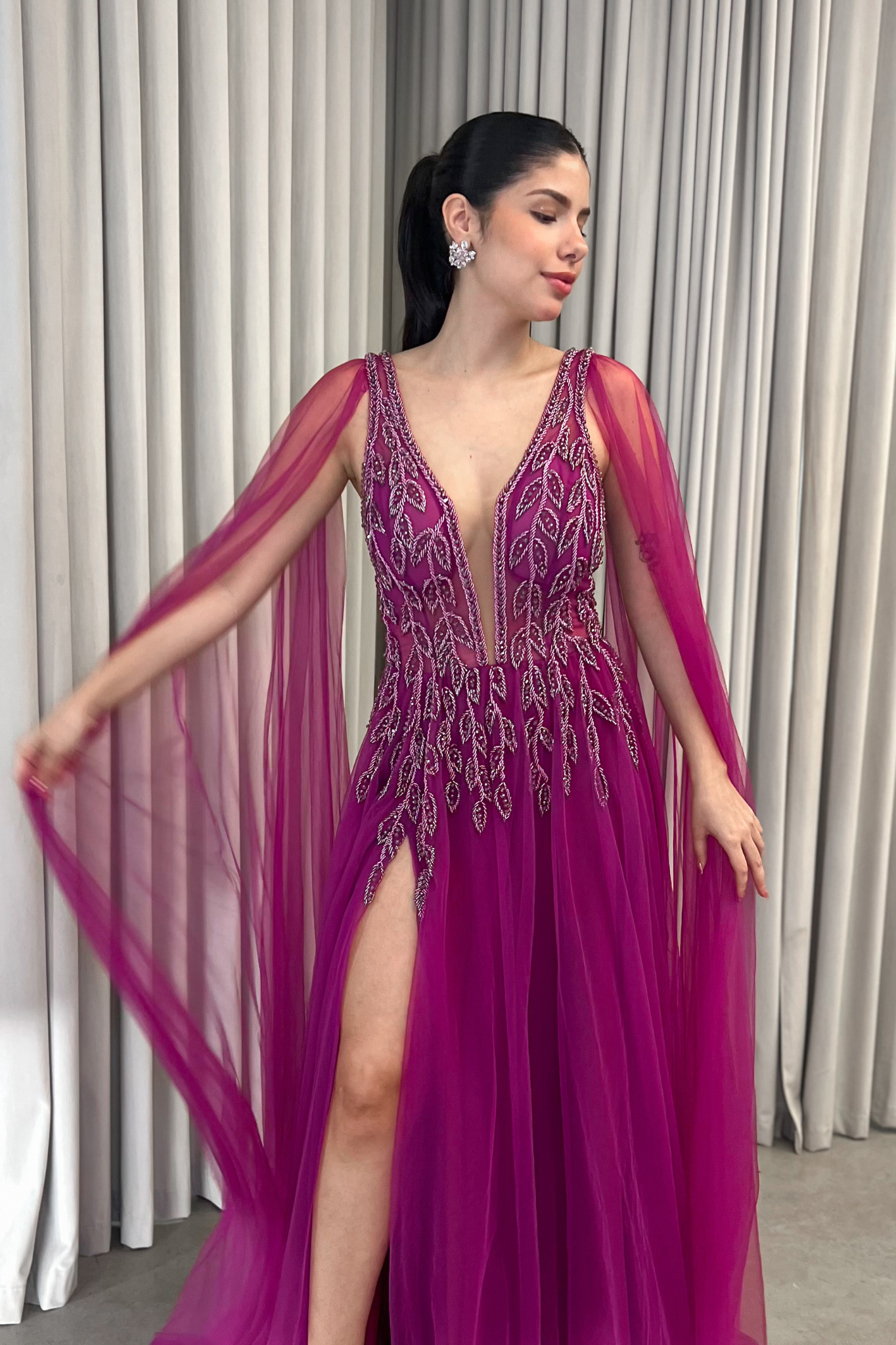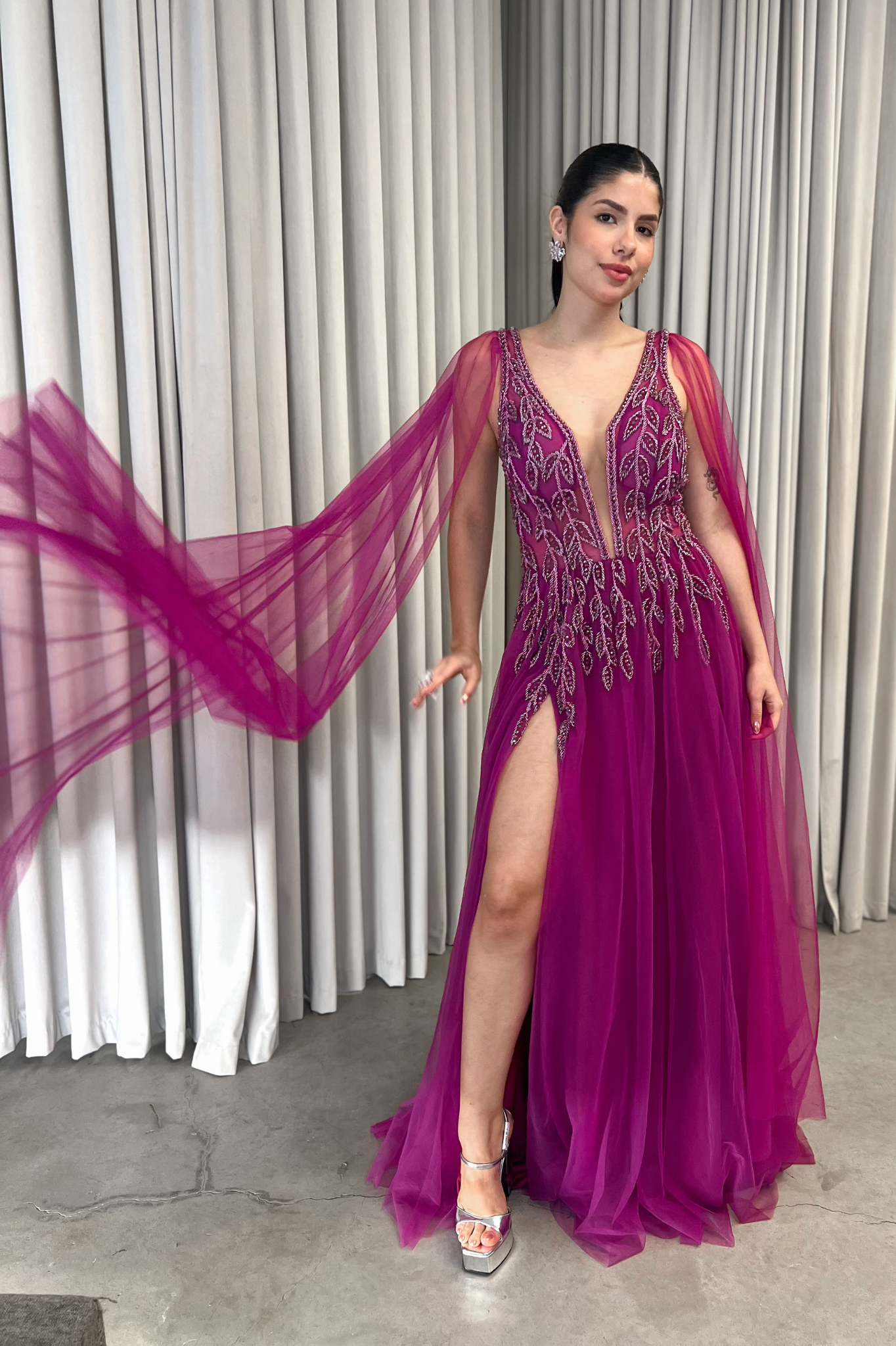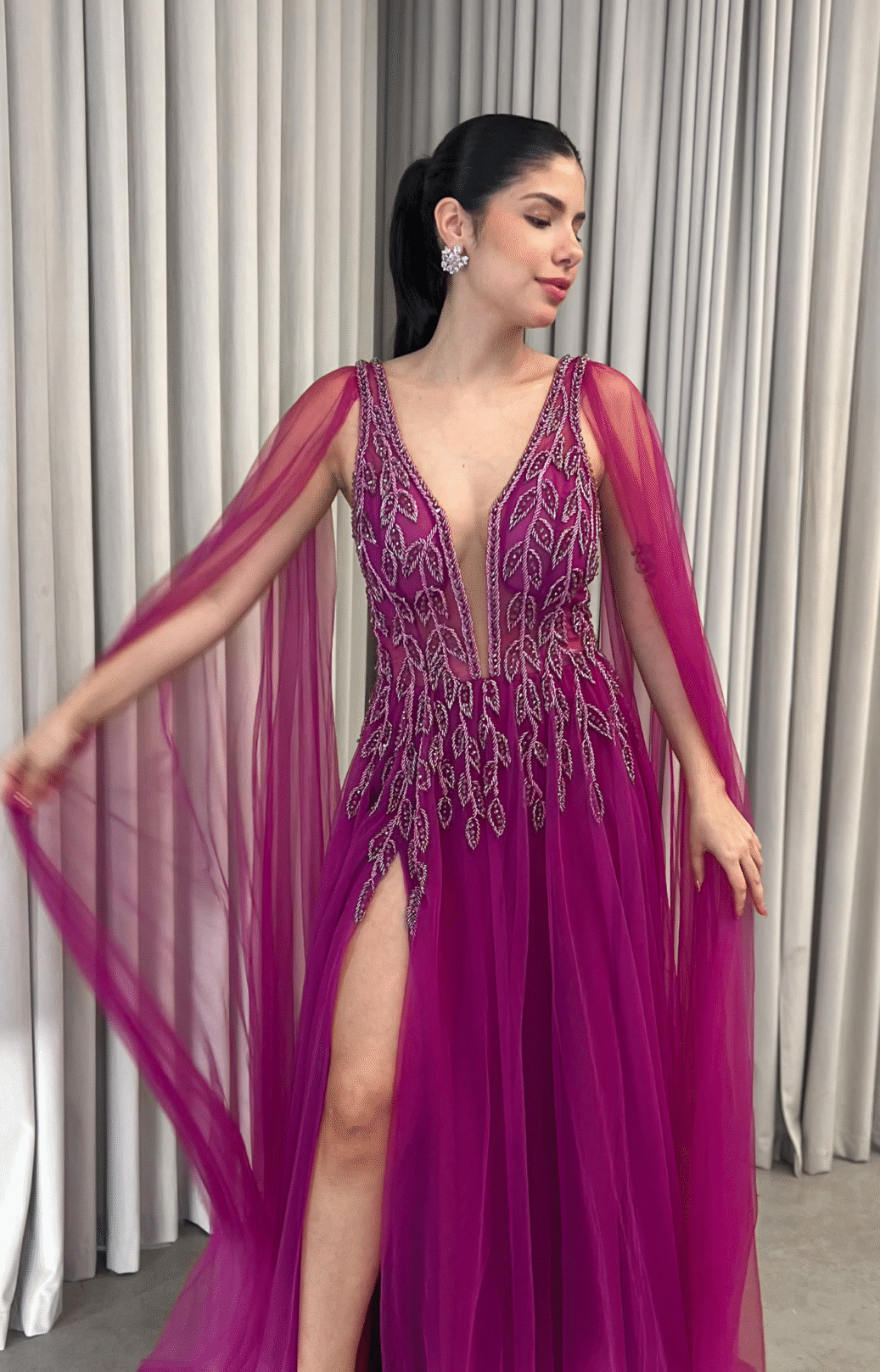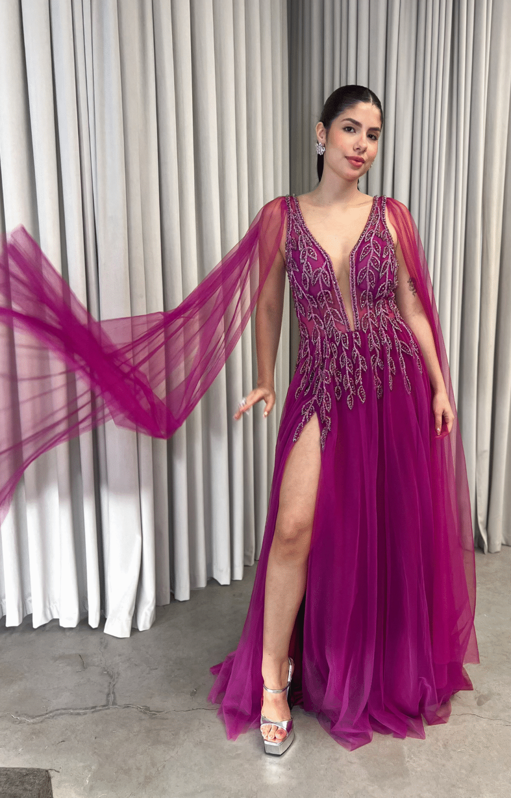 O corte impecável deste vestido realça a silhueta feminina, proporcionando um ajuste perfeito em todas as áreas do corpo. Longa e fluída acrescenta movimento e elegância a cada passo, enquanto valoriza os traços femininos.